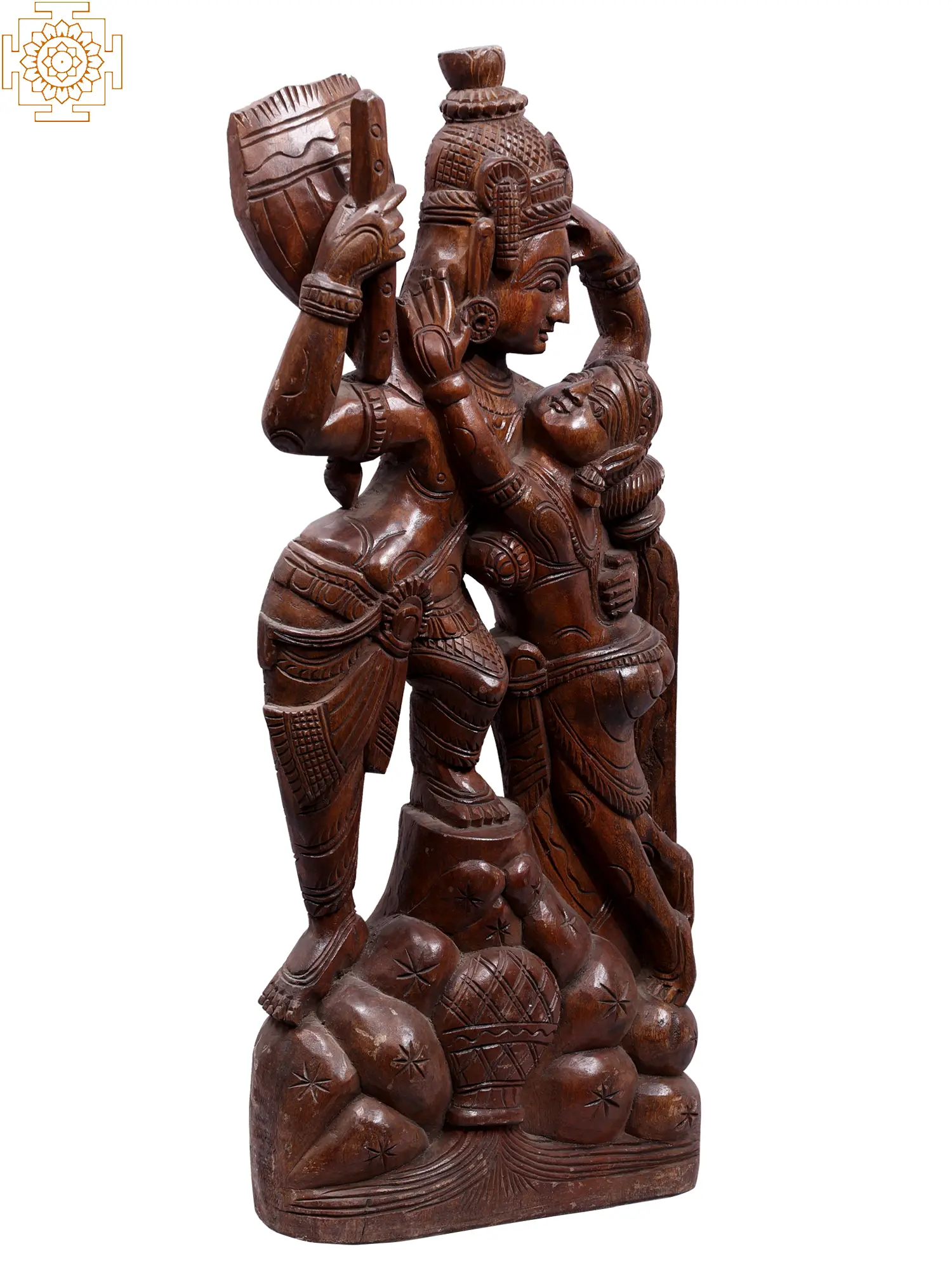 Radha-Krishna, the holy couple, appears in this wooden figure with lively attitudes, playfully engrossed in each other, exhibiting the romantic aspects of Krishna's Lila. Krishna straightens up, plants a leg on the ground, and gives Radha a tender hug.