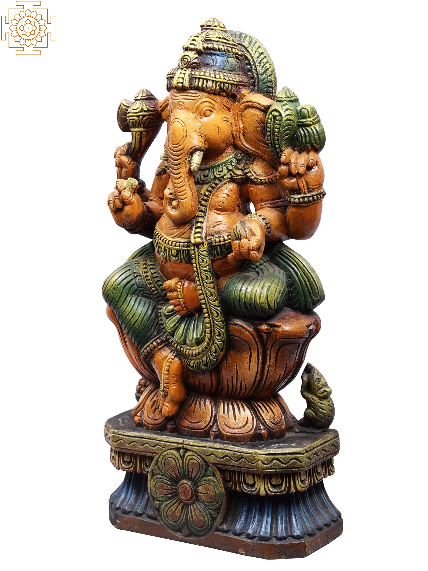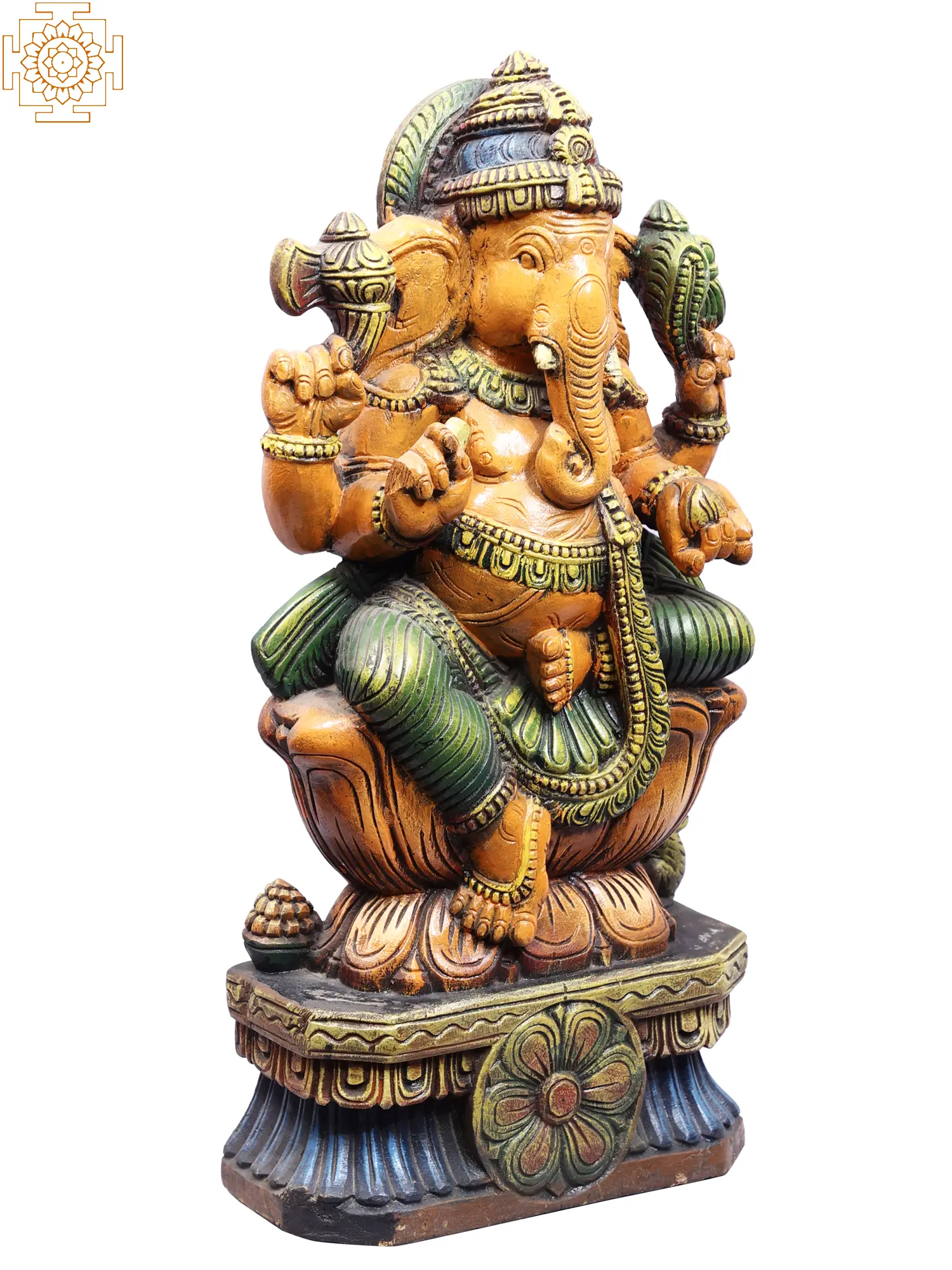 Invite the benevolent presence of Lord Ganesha into your home with this exquisite wooden carving. Standing at 24 inches tall, this majestic representation captures the divine energy of the beloved Hindu deity, known as the god of beginnings, wisdom, intellect, and the remover of obstacles. Each detail of this hand-carved masterpiece speaks to the rich cultural heritage and spiritual significance of Ganesha. Crafted from high-quality wood, this statue showcases the artistry and dedication of skilled artisans. The warm, natural tones of the wood are enhanced by subtle yet vibrant painted accents, bringing the deity to life. Lord Ganesha is depicted in a serene sitting posture, adorned with traditional ornaments and a beautifully rendered mukut (crown). His elephantine head, symbolizing wisdom and intellect, is a testament to his divine nature.