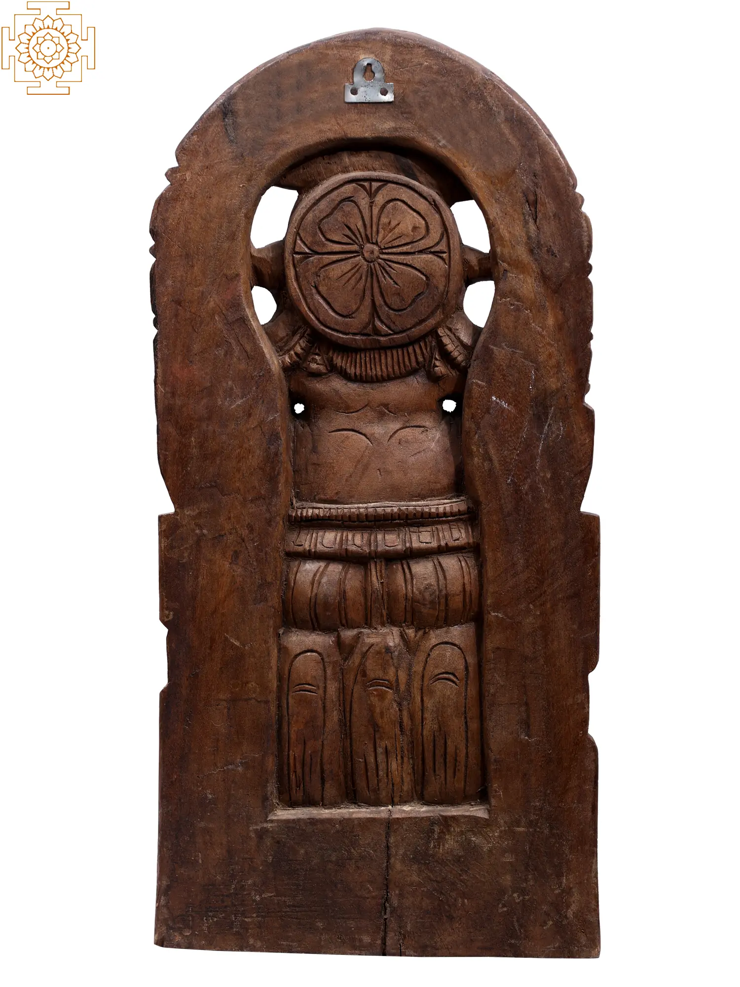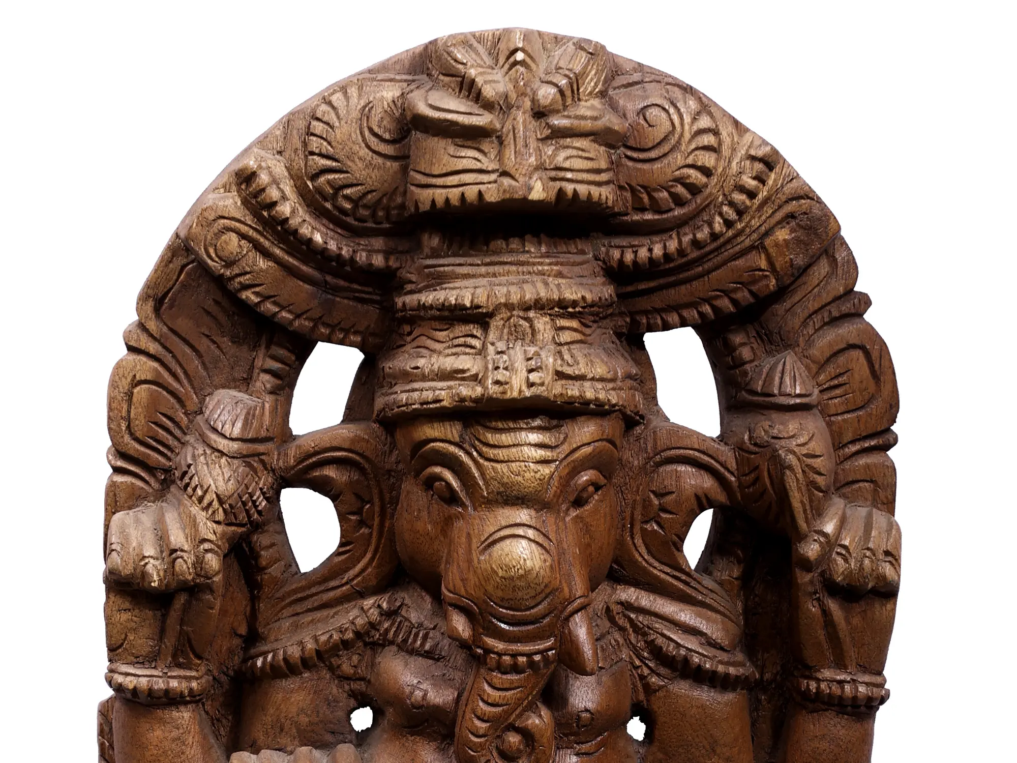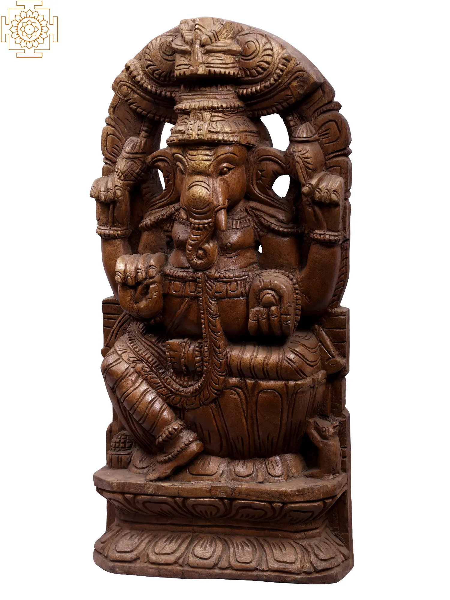 A monotone wooden statue of Sri Ganesha, this artwork is a brilliant example of the skills of South Indian artists, who bring divinity into wood. On a lotus pedestal, Ganesha sits on his lotus throne in the royal Lalitasana pose, in his auspicious four-armed form. Exquisite ornaments adorn the body of Ganesha, along with the sacred Tripunda mark on his forehead. A bowl of Modak on his right and Mushak on his left create the atmosphere of devotion and worship, accentuated by the Kirtimukha prabhavali, that gives the statue a temple-like aura.