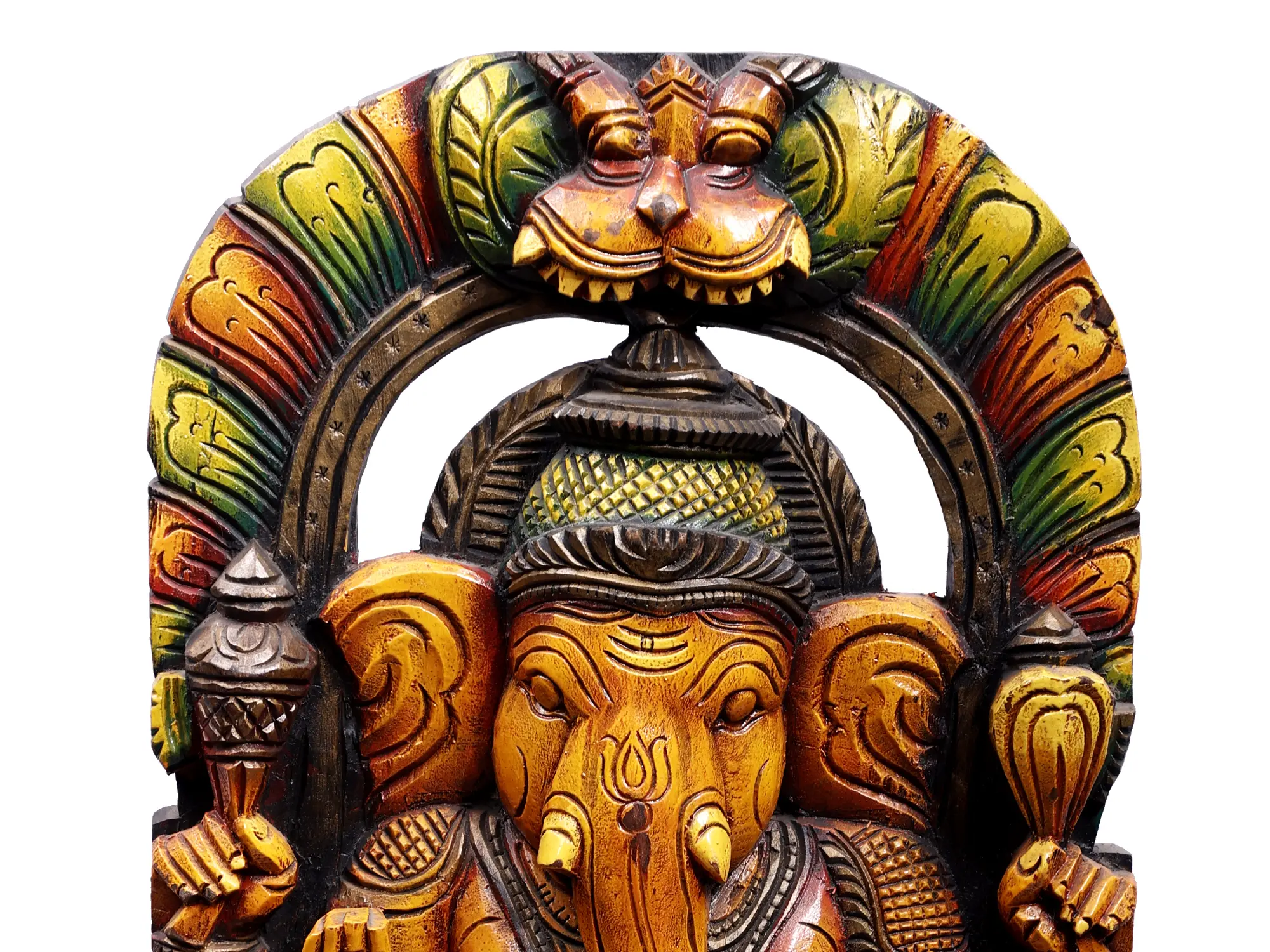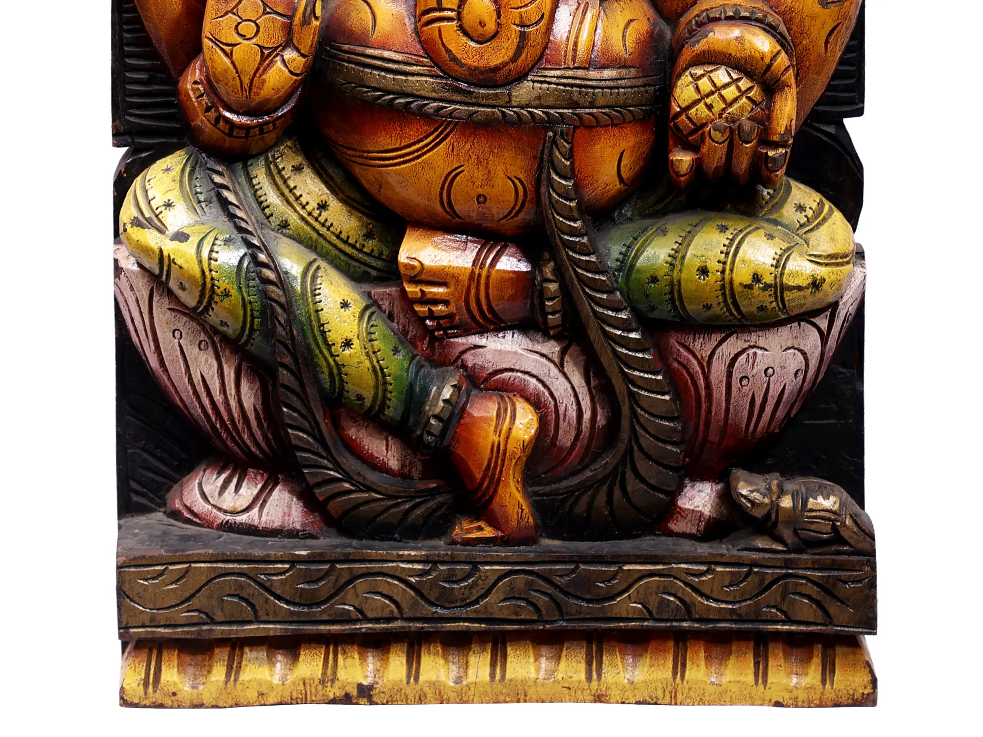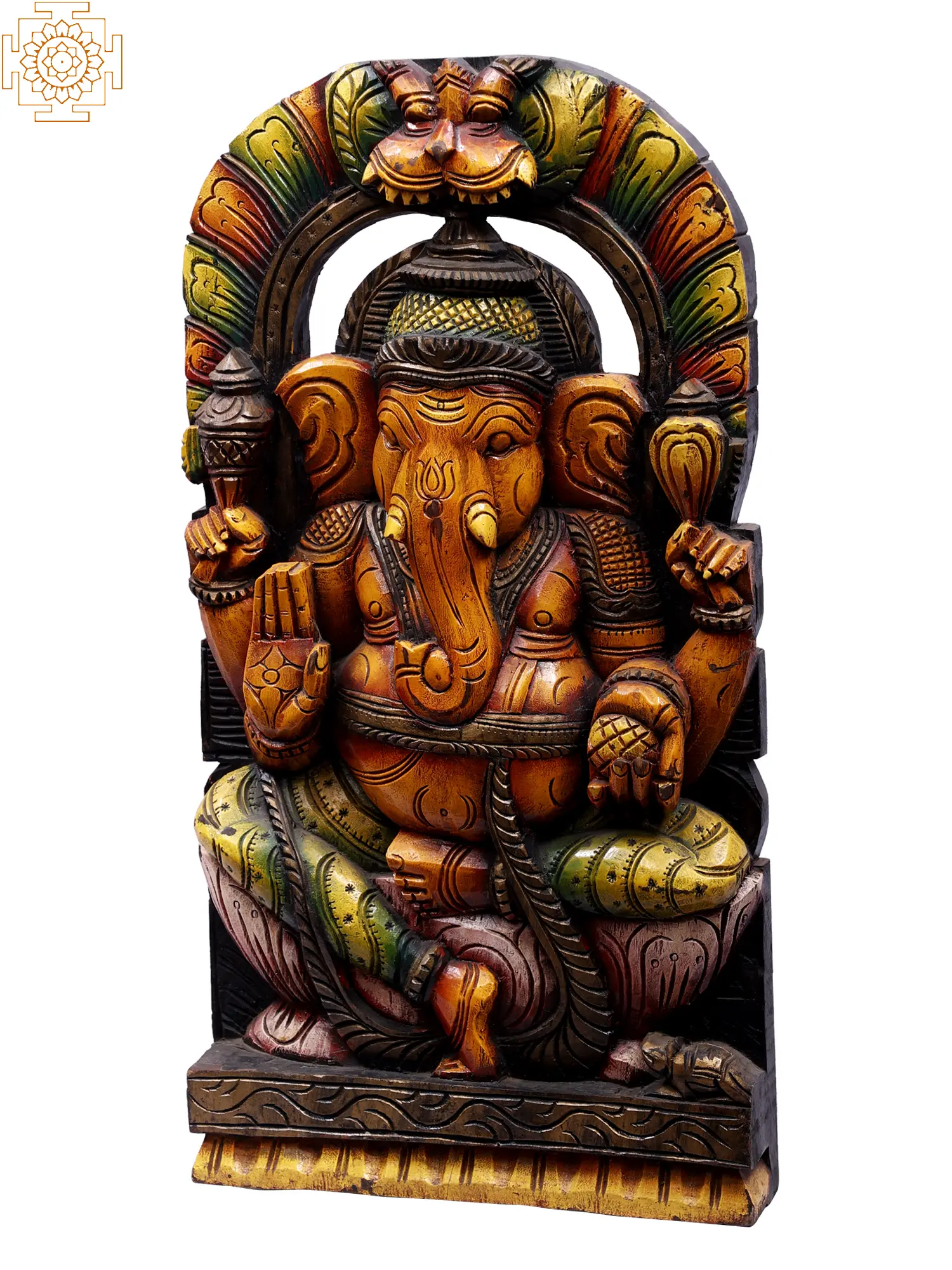 Ganesha in the Hindu world is a symbol of the union of all that is good and virtuous. The son of Shiva and Parvati, brother of Karttikeya, Ganesha is often depicted as a dotting child, yet the god holds supreme strength and divine wisdom that is sought after by kings and sages. This wooden statute brings the splendor of Sri Ganesha in the idiom of South Indian wood artworks.