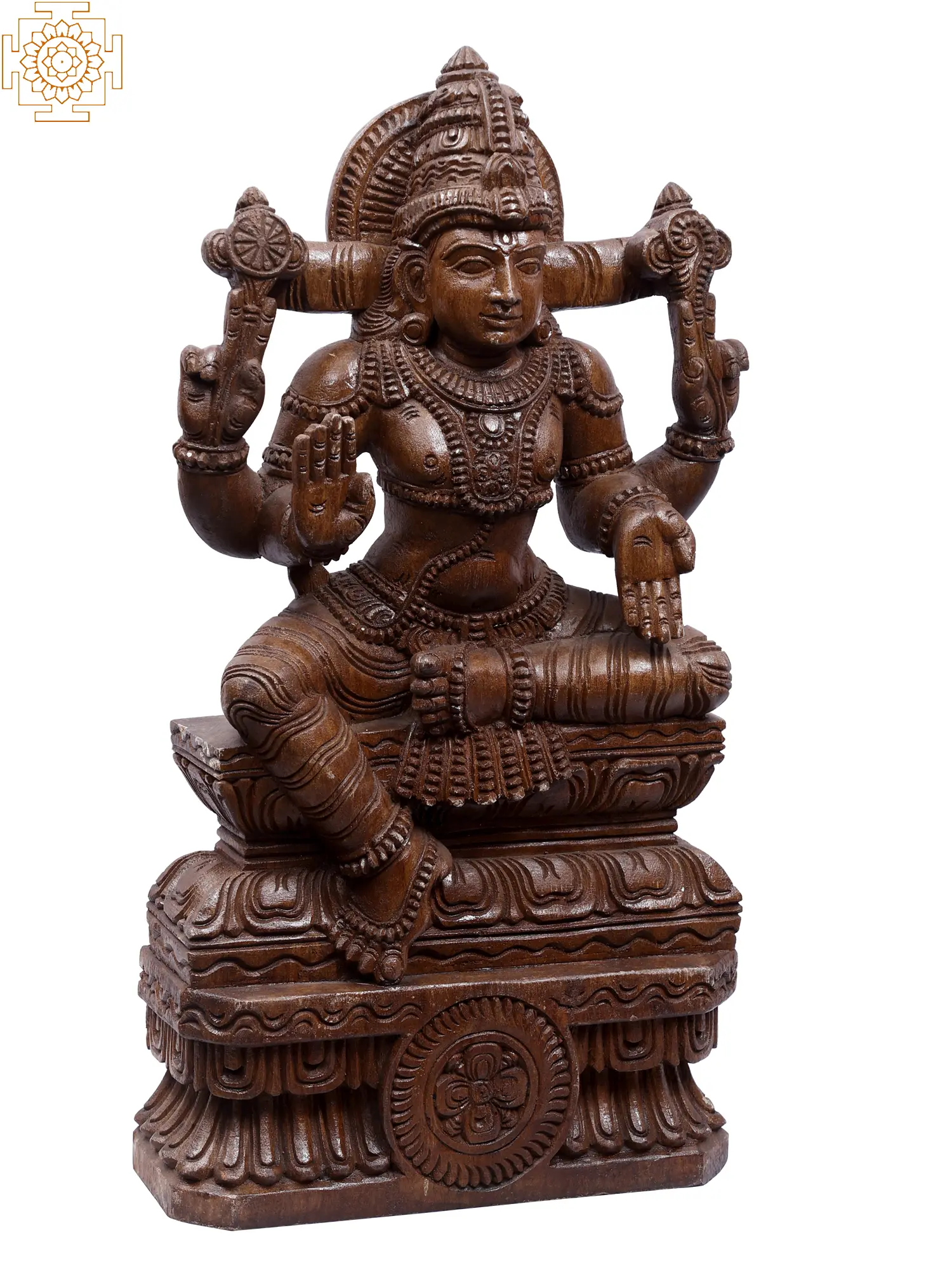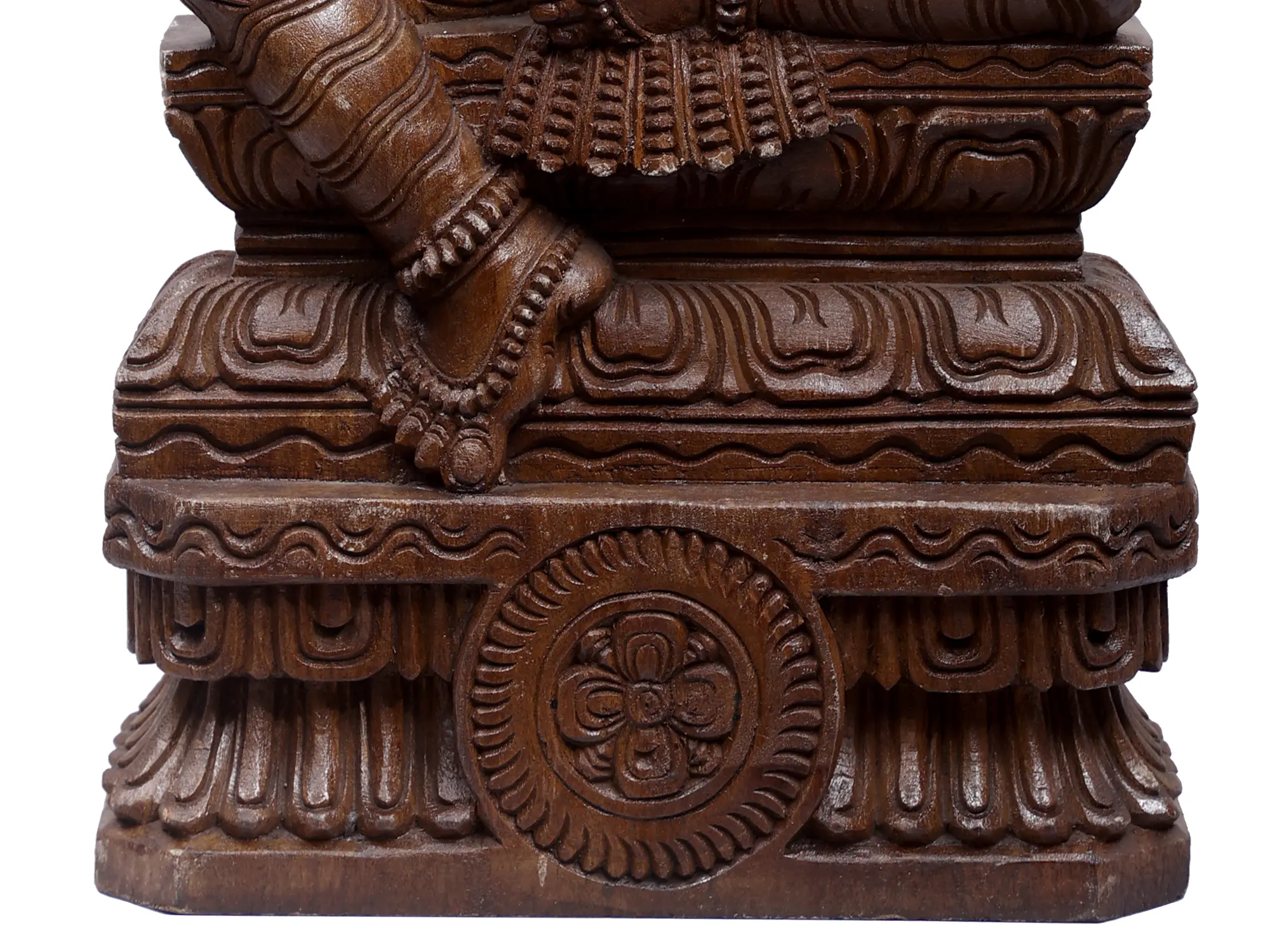 The Lord of Vaikuntha and three realms, Sri Vishnu in Hinduism is the supreme king, the sustainer of the Creation of Brahma, often compared to a sovereign or Chakravartin. In this wooden statue, the royal aspect of Lord Vishnu is depicted, placing him on an imposing throne in the attire of a king.