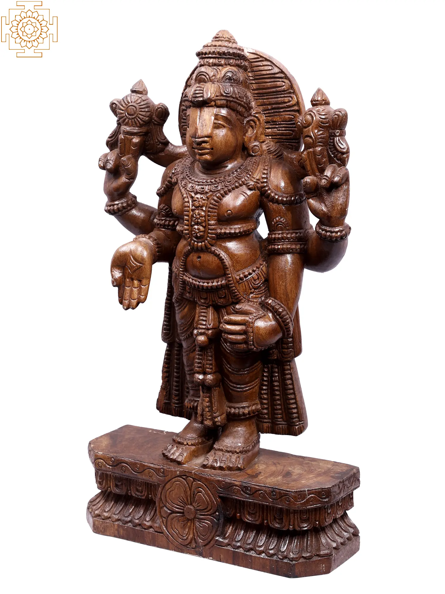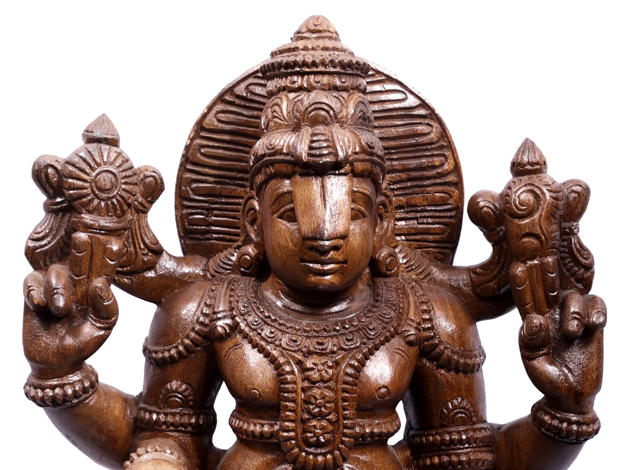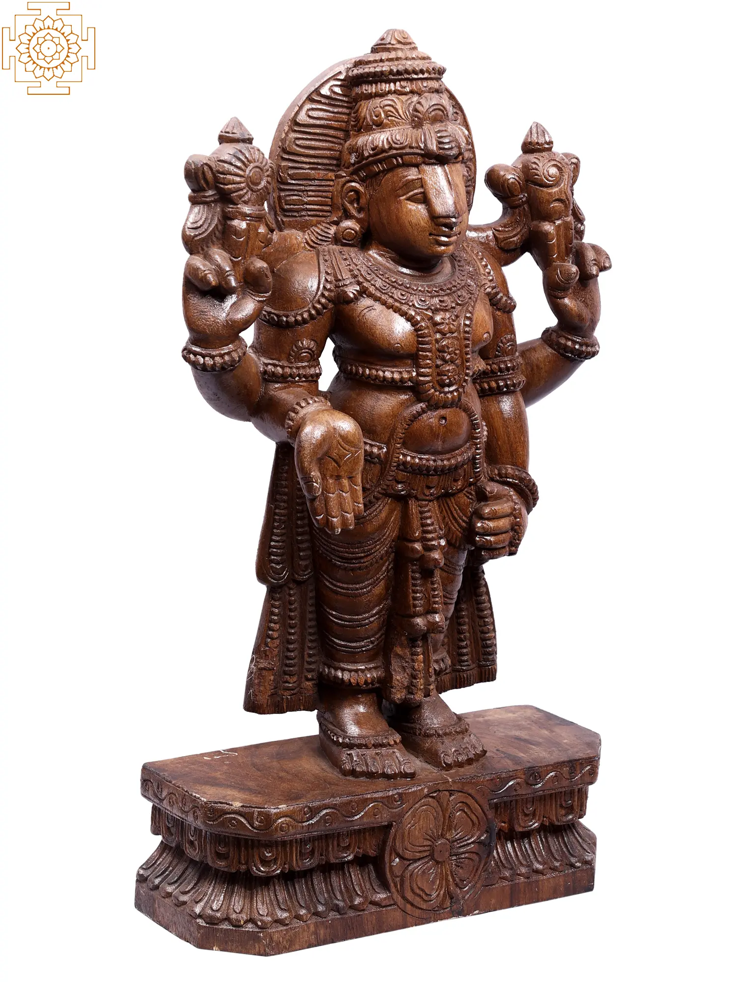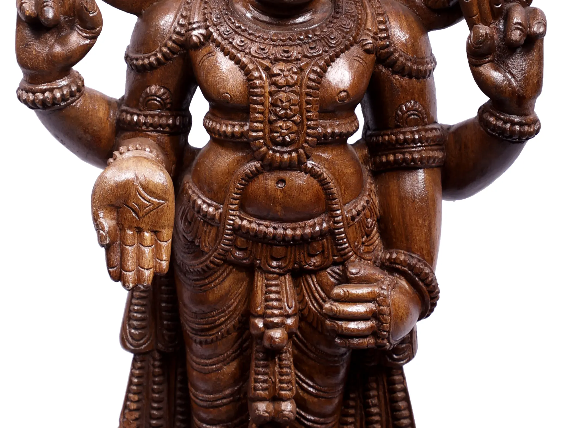 In this wooden statue, Sri Venkateshwara is presented standing upright in a firm pose, holding his sacred Shankha and Chakra in secondary hands, placing his left hand on his waist in Katihasta mudra and raising his right hand in Abhaya mudra or the gesture of fearlessness. A towering Vaishnava crown, intricately carved jewelry, garments, and halo adorn the idol of Tirupati, along with his characteristic Tilak, from underneath which the heavenly gaze of Tirupati guards his devotees.