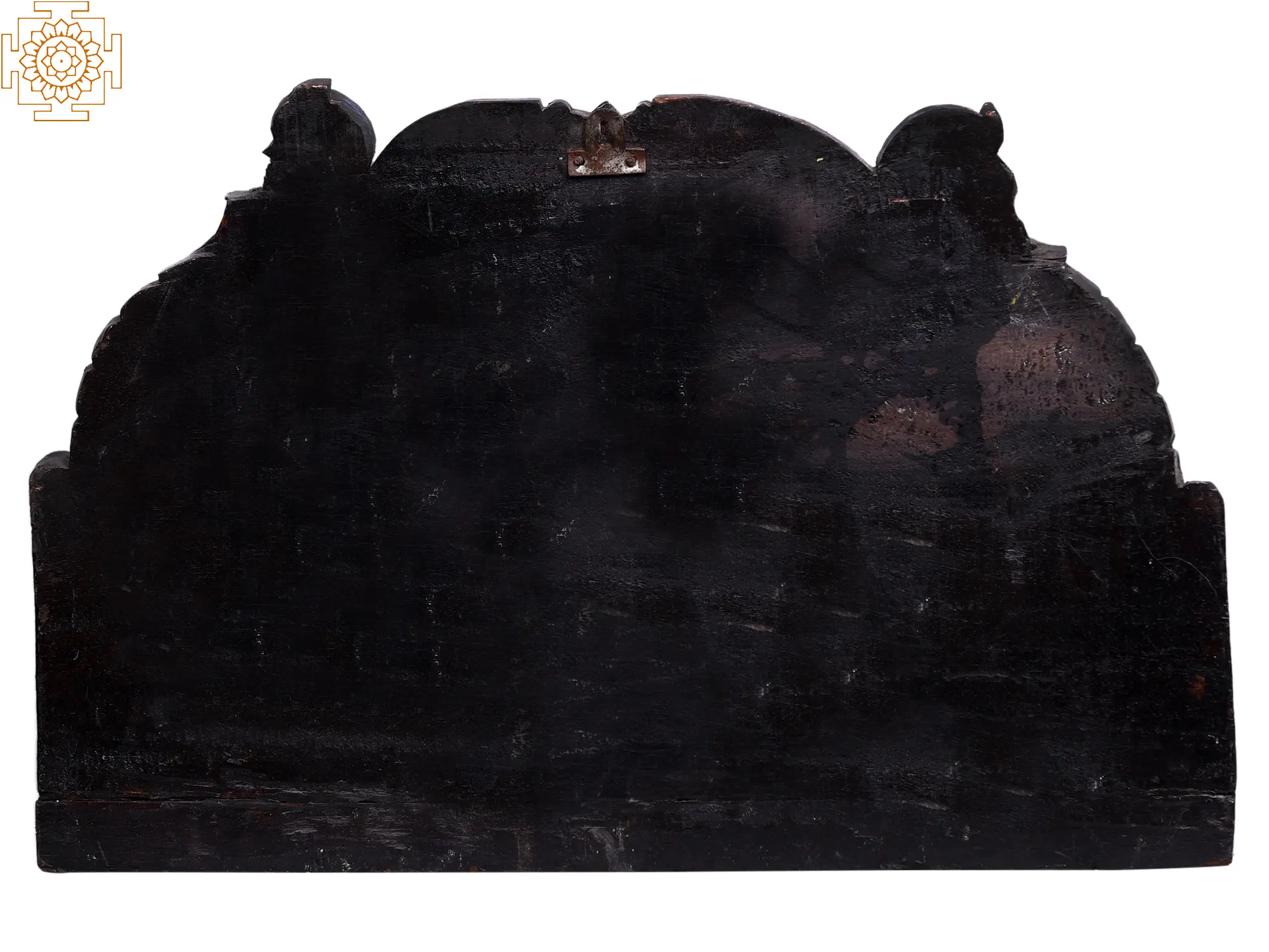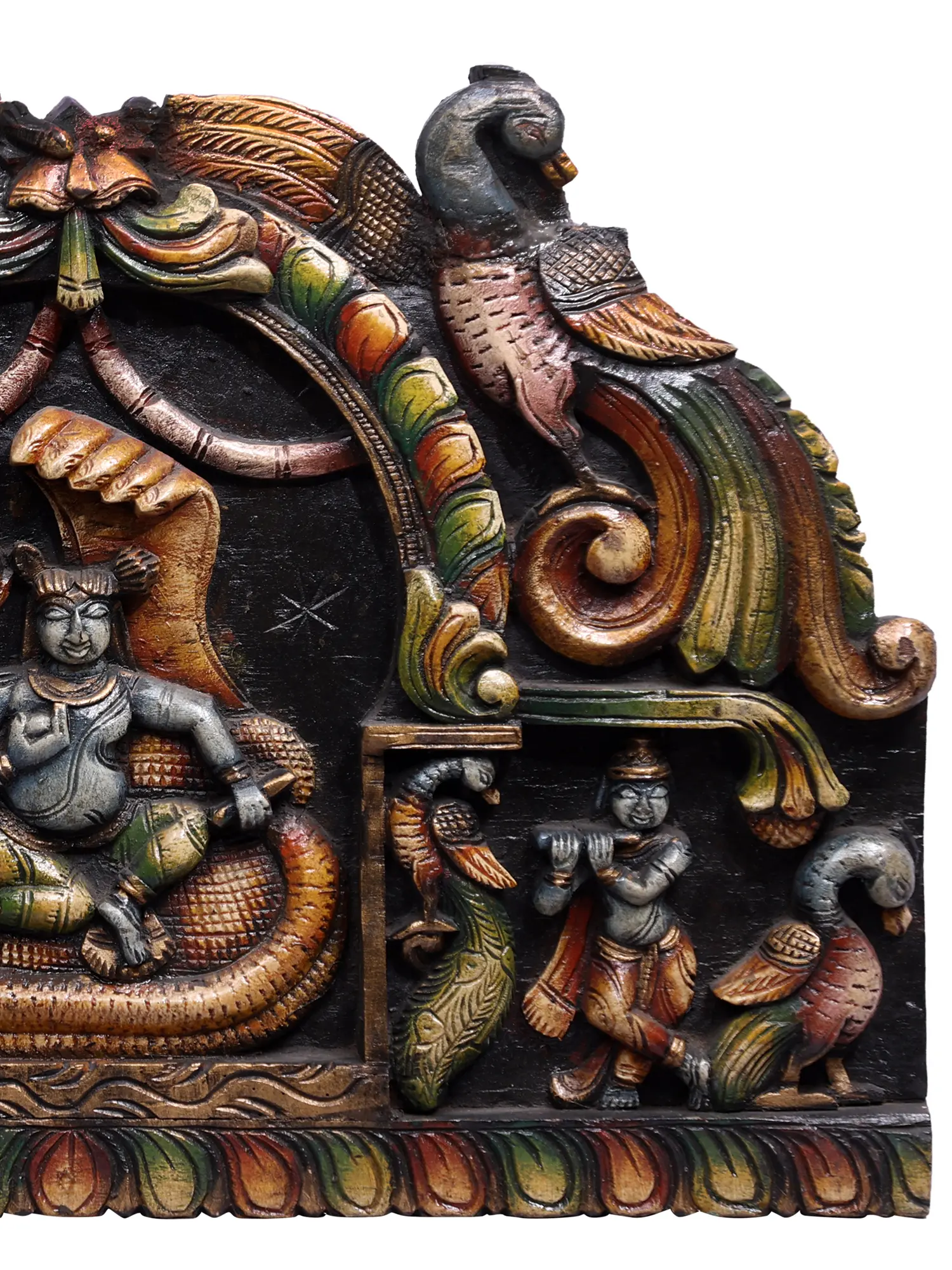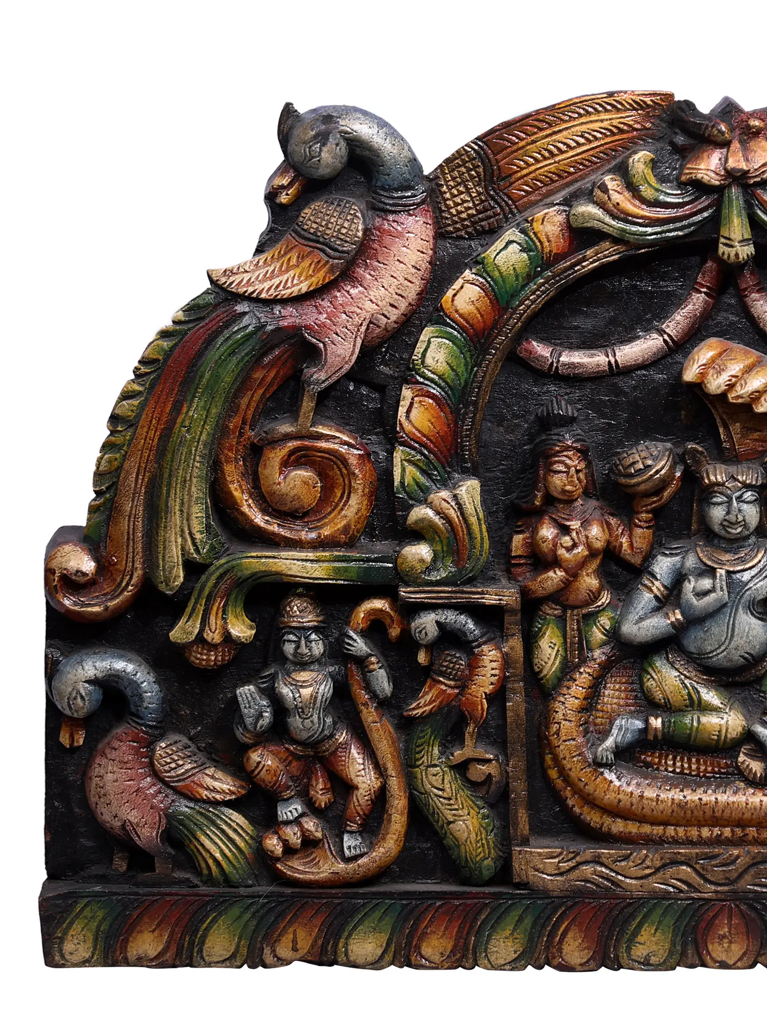 The wall panel is carved as a portable storyboard, with one side delineating the heavenliness of Kaliya-Krishna (Krishna trampling the hoods of Kaliya serpent) and the other showing Tribhanga Murari- triple-bent Krishna, fluting his Murli. Adorned with Kirtimukha aureole, peacocks, and floral embellishments, the woodwork is an ode to the divine incarnation of Vishnu, who is the perfect union of divine valor and transcendental beauty.