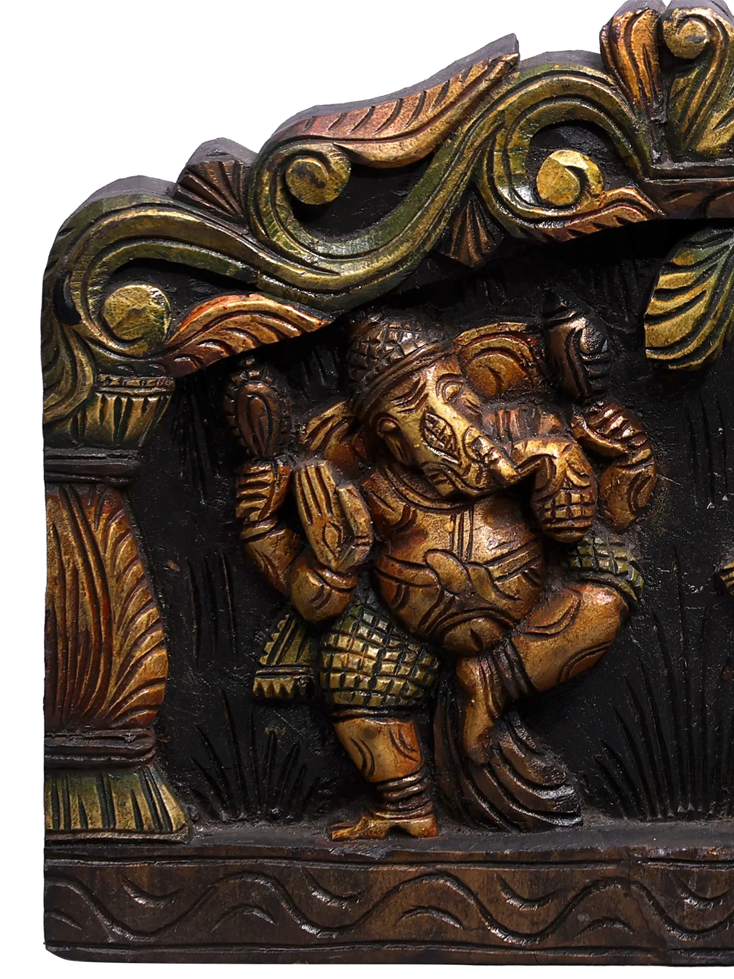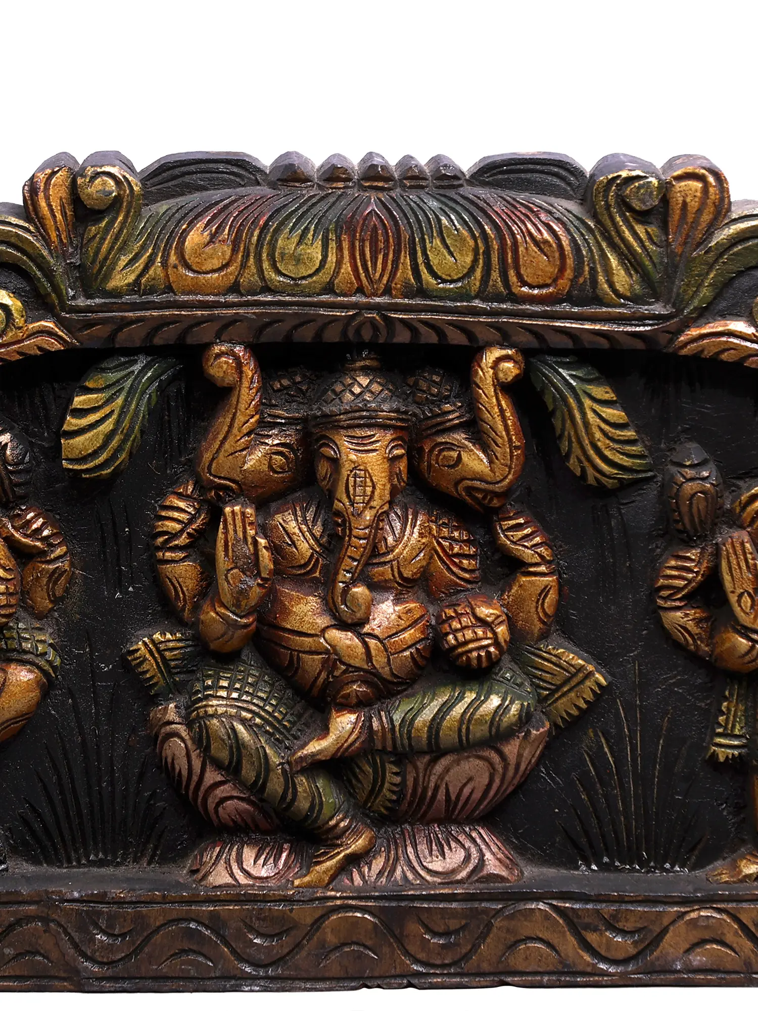 For all eternity, Ganesha images have served as the protectors and guardians of auspiciousness in homes and sacred locations. Drawing inspiration from the traditional Hindu temple imagery, this wooden wall panel showcases three forms of Ganapati:  Nritya Ganapati, or dancing Lord, who infuses the world with auspiciousness and bliss, Trimukha Ganapati (three-headed Ganesha) who guards one against any obstacles and standing Ganesha, who is ever-ready to answer the prayers of his devotees, as an active and benevolent parent.
