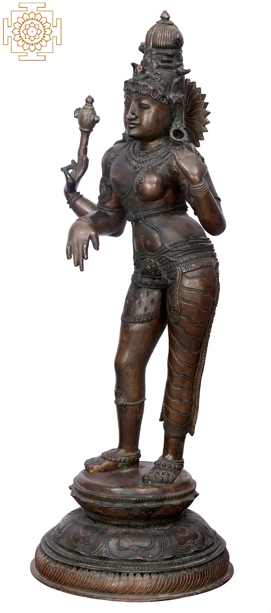 This magnificent bronze sculpture captures the divine form of Ardhanarishvara, a powerful representation of the fusion of Lord Shiva and Goddess Parvati. Ardhanarishvara embodies the fundamental unity of masculine and feminine energies that permeate the universe, symbolizing the creative and destructive forces in eternal balance. The deity's androgynous nature signifies that the divine encompasses all aspects of existence, demonstrating that creation, sustenance, and dissolution are intrinsically linked and interdependent. This profound concept resonates deeply within Hindu philosophy, highlighting the ultimate oneness of reality. The term "Ardhanarishvara" itself translates to "the Lord who is half woman." This iconography is a visual metaphor for the inseparable union of Shiva, the ascetic, and Parvati, the consort, representing the totality of creation stemming from their divine union. Myths tell of Shiva's desire to understand the feminine principle, and his granting half of his form to Parvati. This union is not merely about duality but about transcending it, illustrating that the seemingly opposite forces are indeed two sides of the same cosmic coin. The form is a reminder that within every being, both masculine and feminine principles coexist, and their harmonious integration leads to completeness and spiritual realization. ––––––––––––––––––