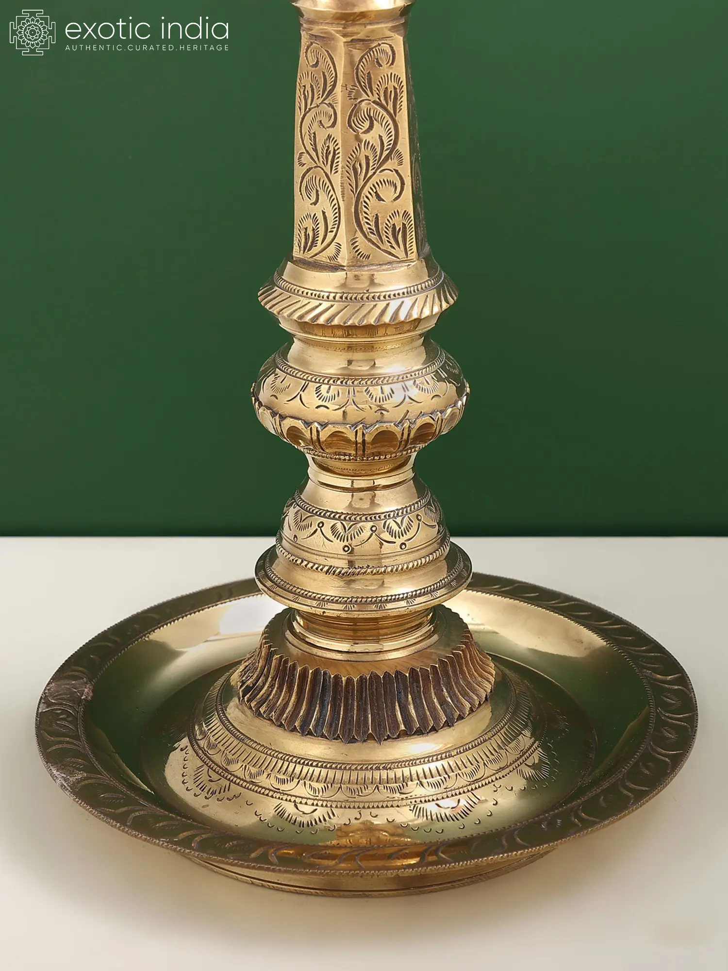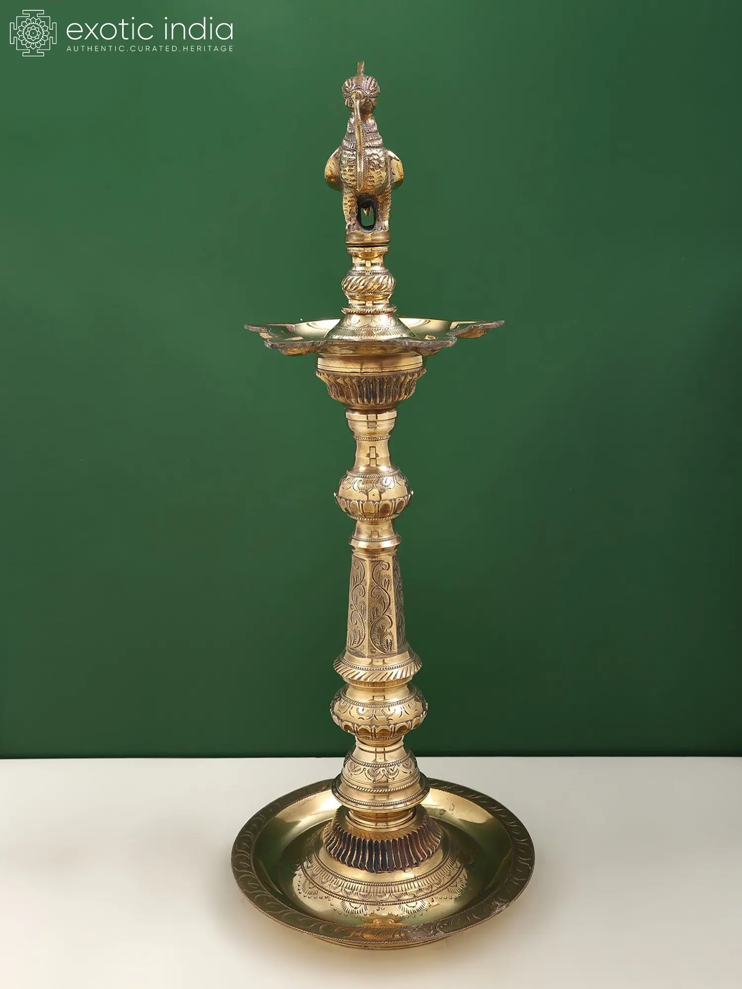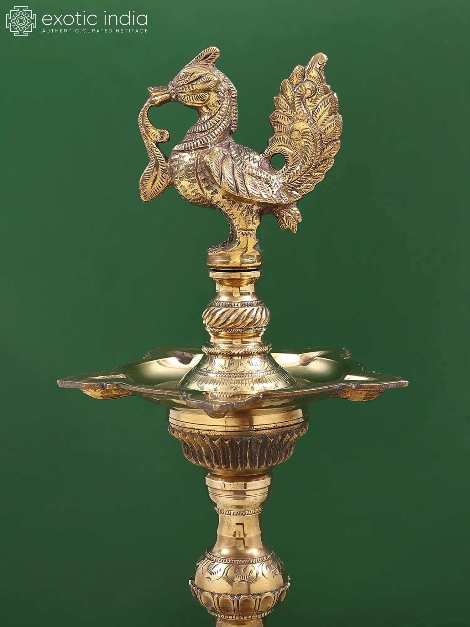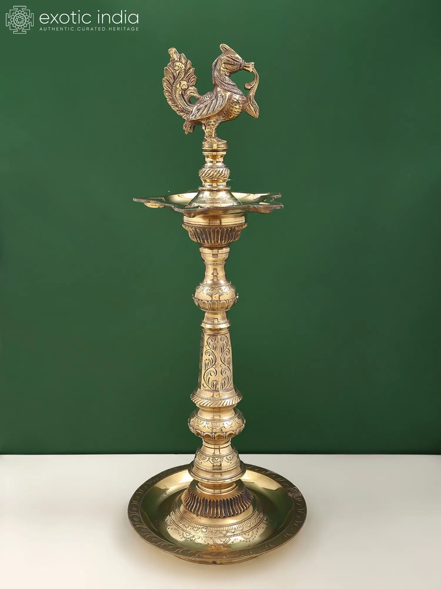 Nachiarkoil Kuthuvilakku is a brass lamp that is handcrafted specifically in Nachiarkoil, Tamil Nadu, India. The lamp, which is hollow cast, comes in a variety of sizes and is made up of four screwed-together sections. The lights are topped with a sacred image of Annam or a mythological peacock. The lamp's components are carved in beautiful patterns. These lights are available with five to seven wicks. They are considered auspicious and are used for temple adornment. Often, rows of these lamps are lighted to bring the almighty's blessings. Because of their religious importance, these lights are often used at Kerala's Poorams (festivals).