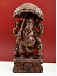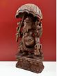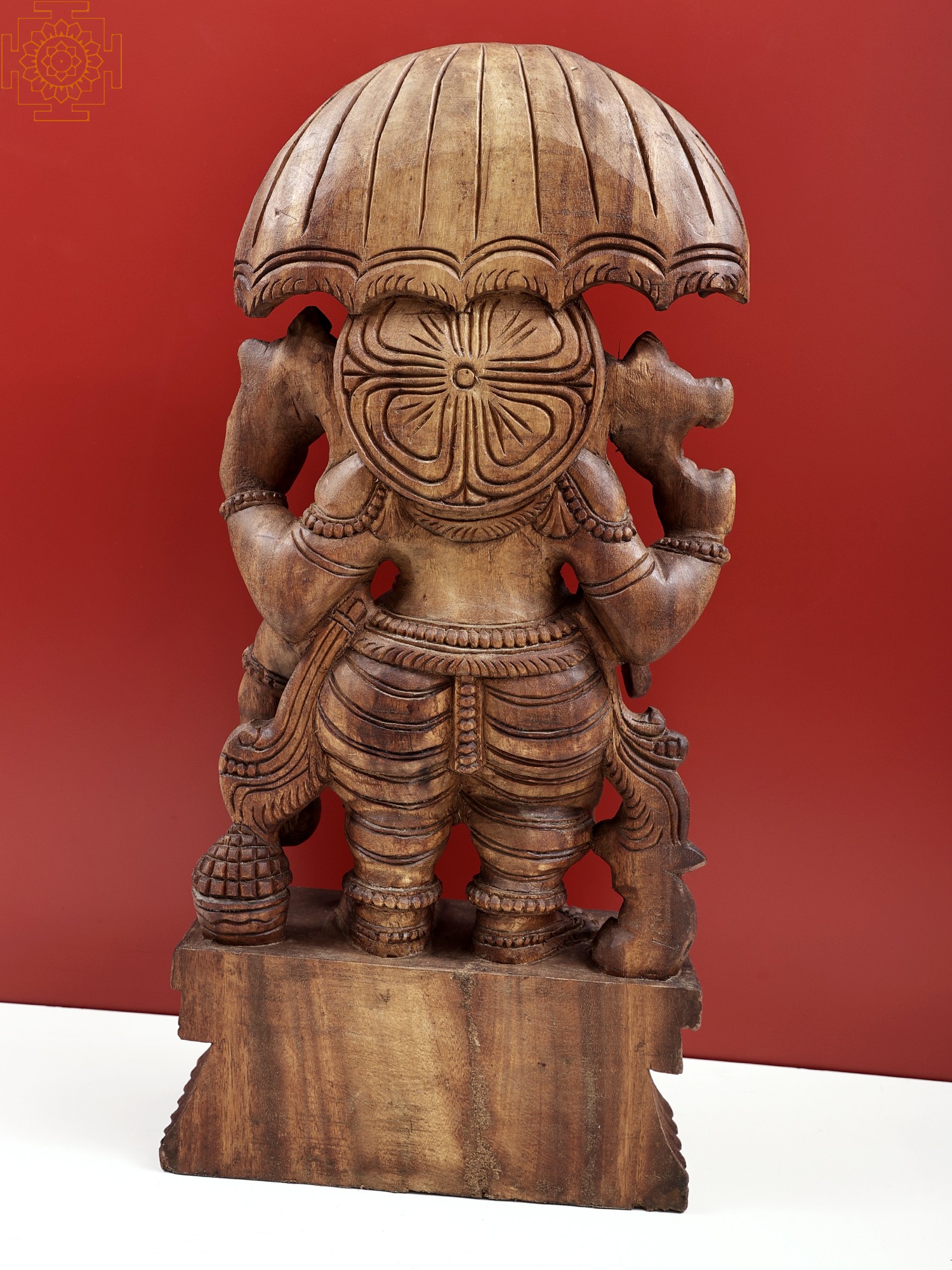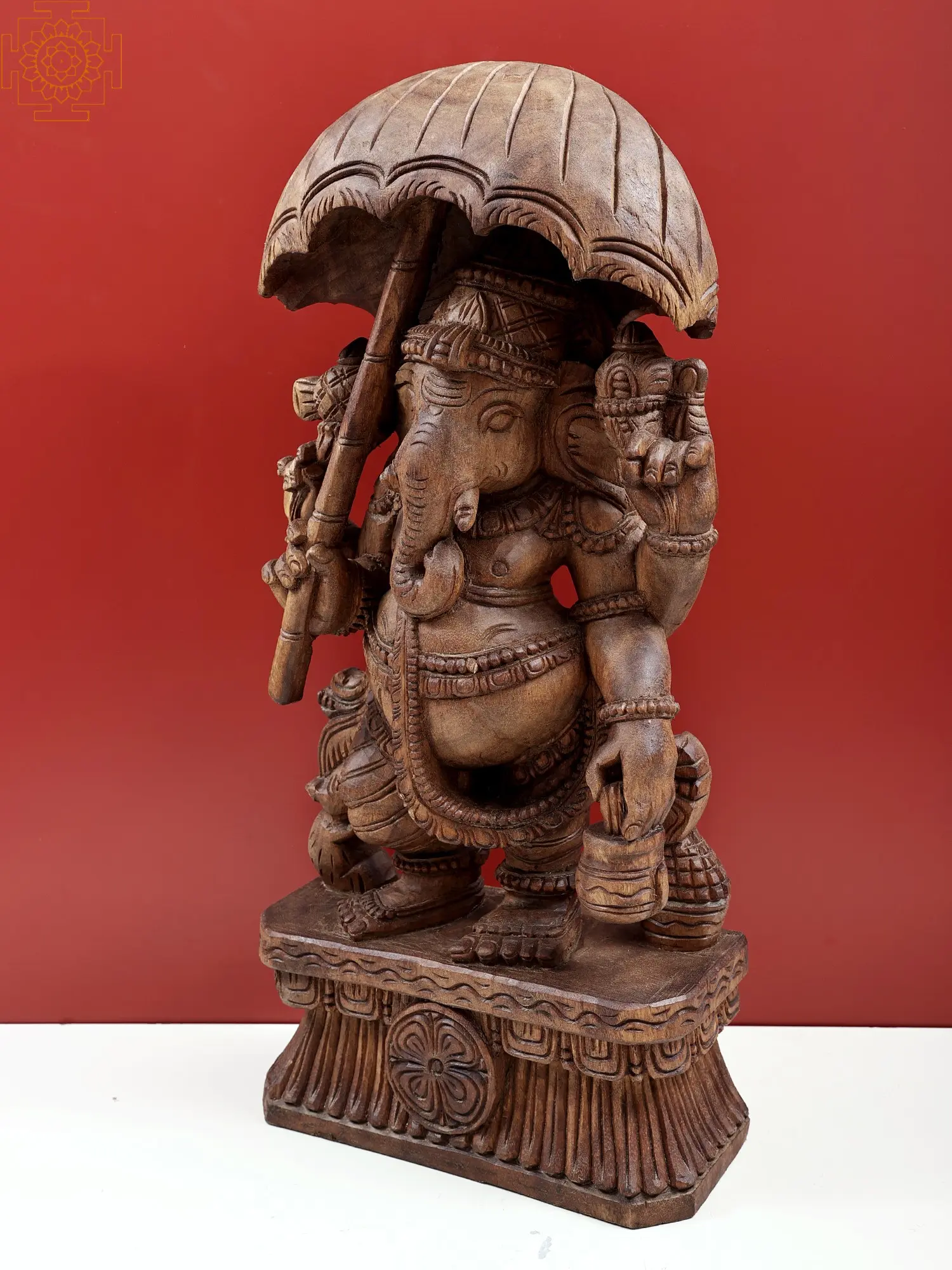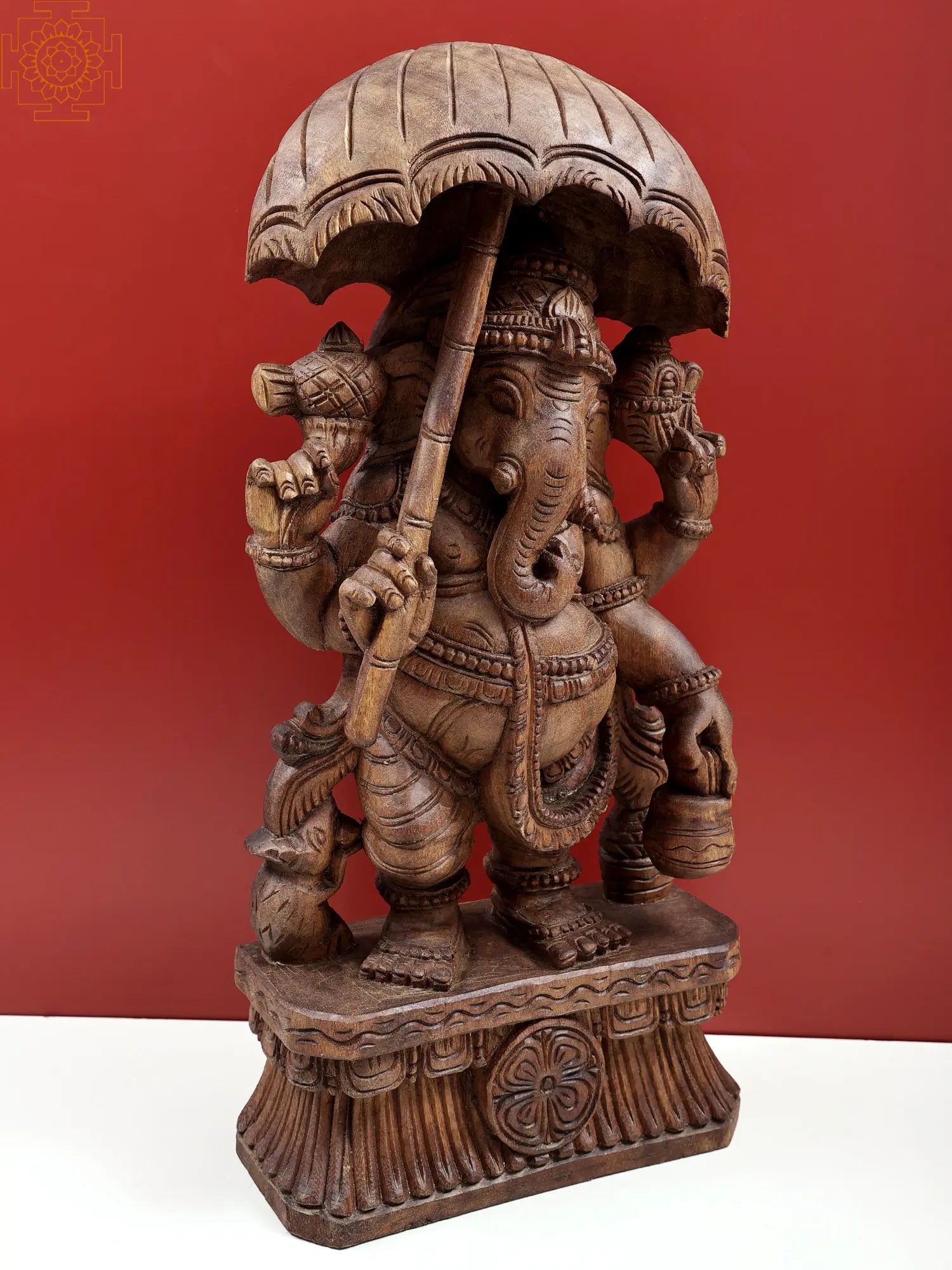 25" Four Handed Wooden Ganesha with Umbrella and Kamandal | Handmade