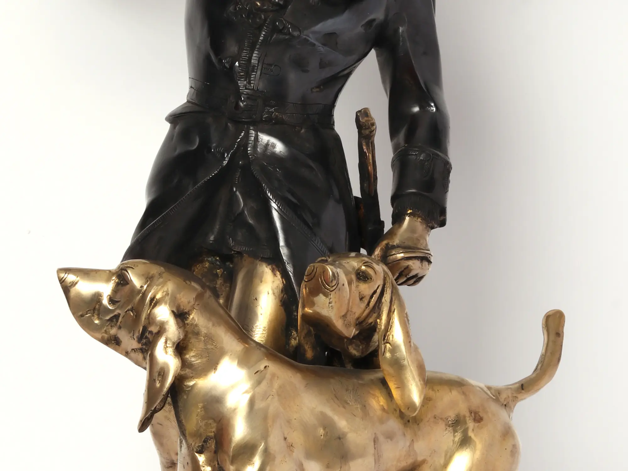 Flanking the huntsman are two magnificent hounds, their muscular bodies and alert expressions perfectly capturing the breed's inherent loyalty and remarkable agility. These hounds were frequently depicted in 18th-century French art, often appearing alongside noble huntsmen. Hounds were not merely working animals; they were symbols of companionship, representing the strong bonds between man and beast. In mythology and folklore, dogs often act as guides and protectors, linking the human world to the spiritual realms. These hounds, faithfully rendered in bronze, mirror this rich symbolism, adding a layer of depth and meaning to the overall composition.