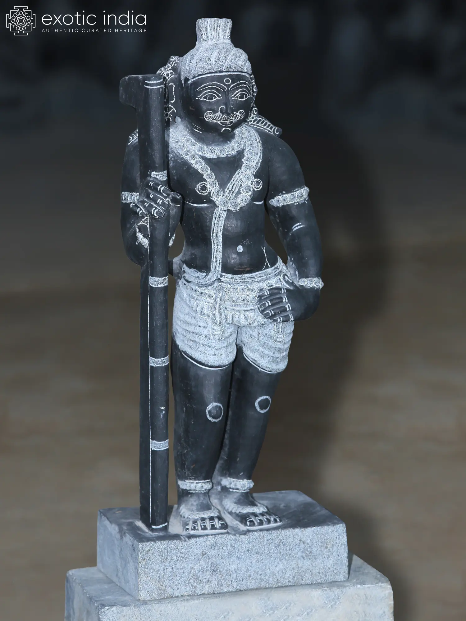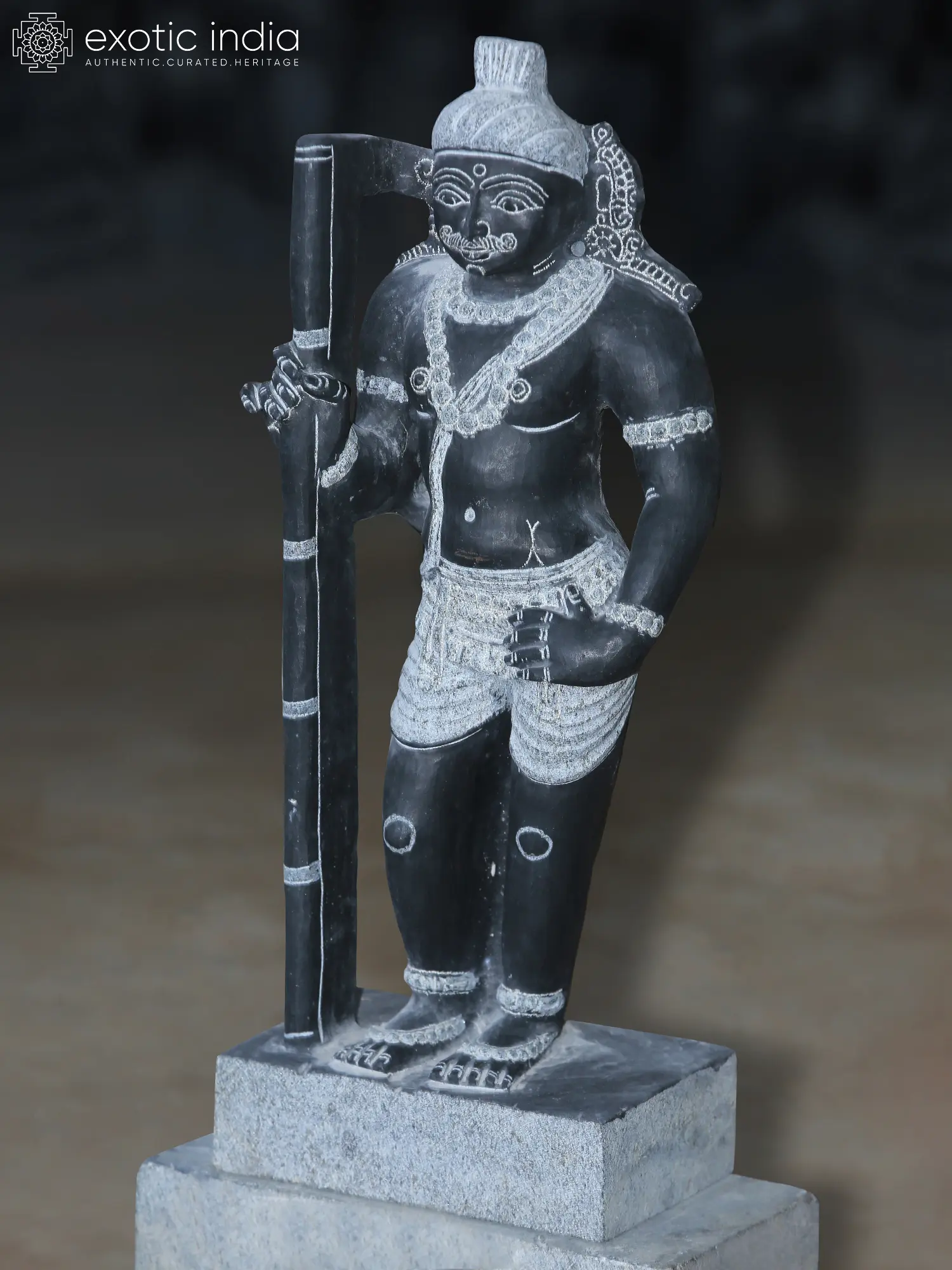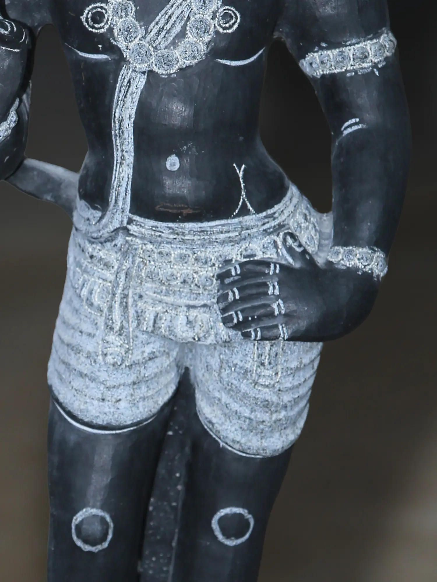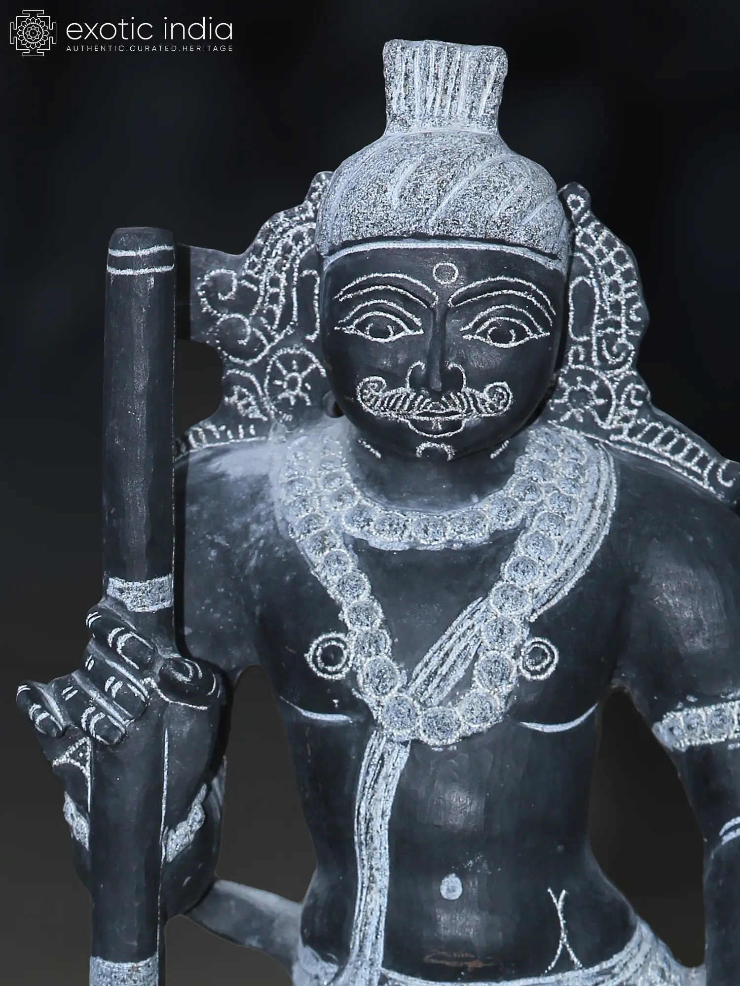 The granite’s smooth, dark surface accentuates the intricate carvings of his youthful face, serene expression, and neatly tied hair (Jata) atop his head.
