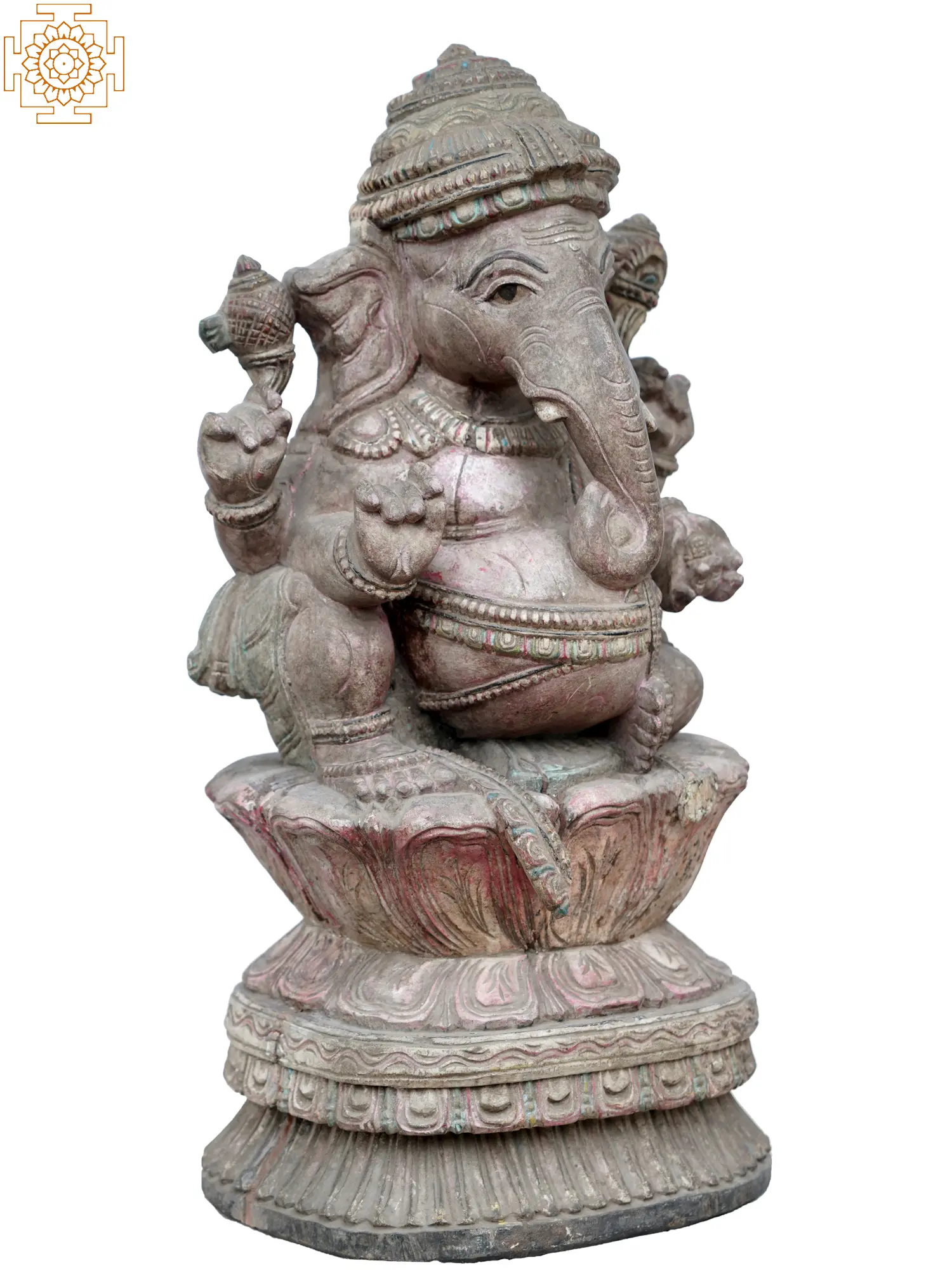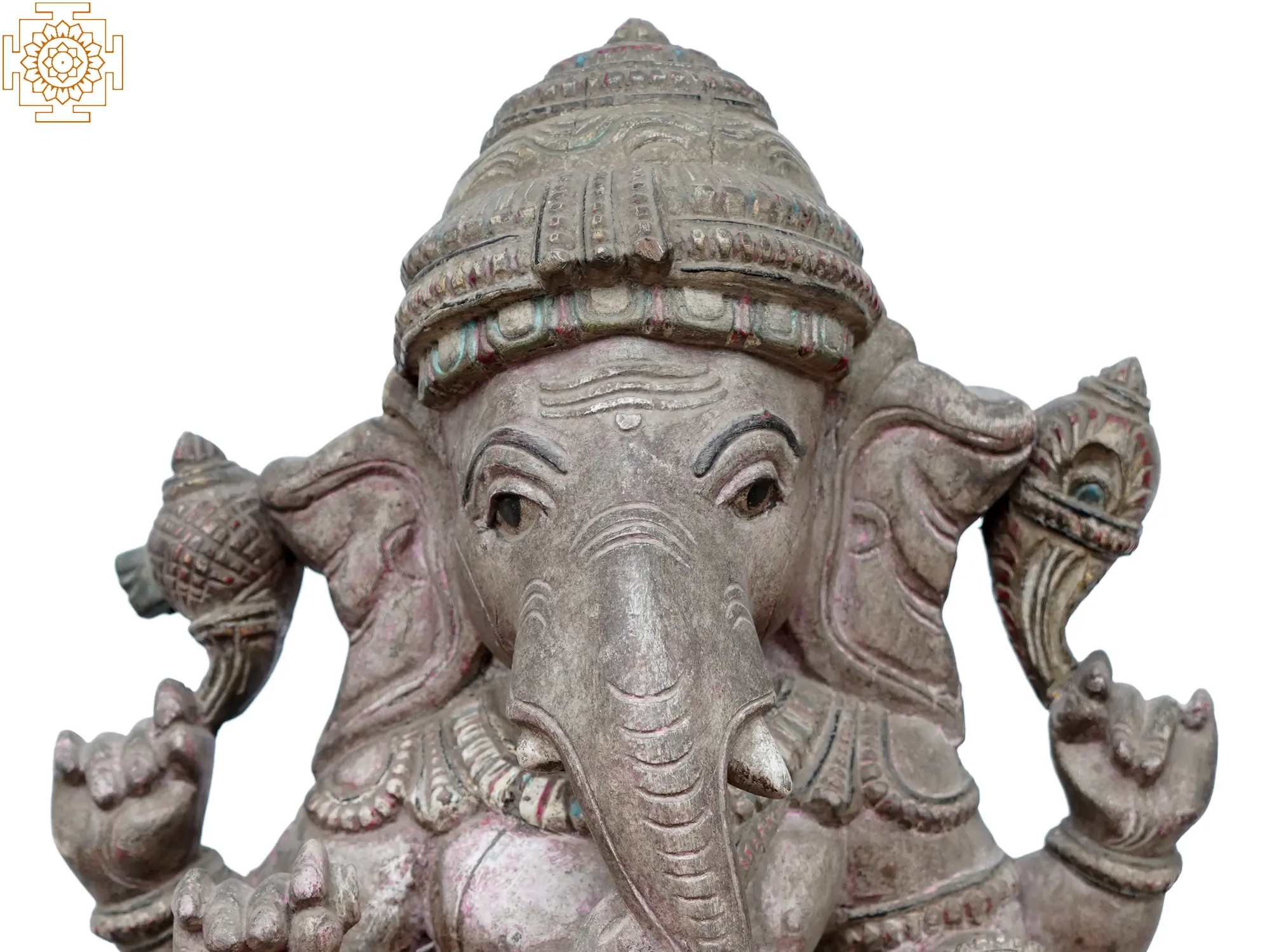 Ganesha in Hindu are the most popular divine symbol, depicted on sanctums, and shrines as aesthetic icons and in home shrines or ritual worship with sacred motifs and patterns, always included in the ritual sphere in one form or the other. This wooden statue carries the celestial aura of Ganesha in a classic, antiquated idiom. Ganesha appears in a royal pose on a lotus throne, adorned with rich ornaments and carrying his attributes- Ankusha (goad), Paasha (noose), Danta (tusk), and Modaka (sweet).