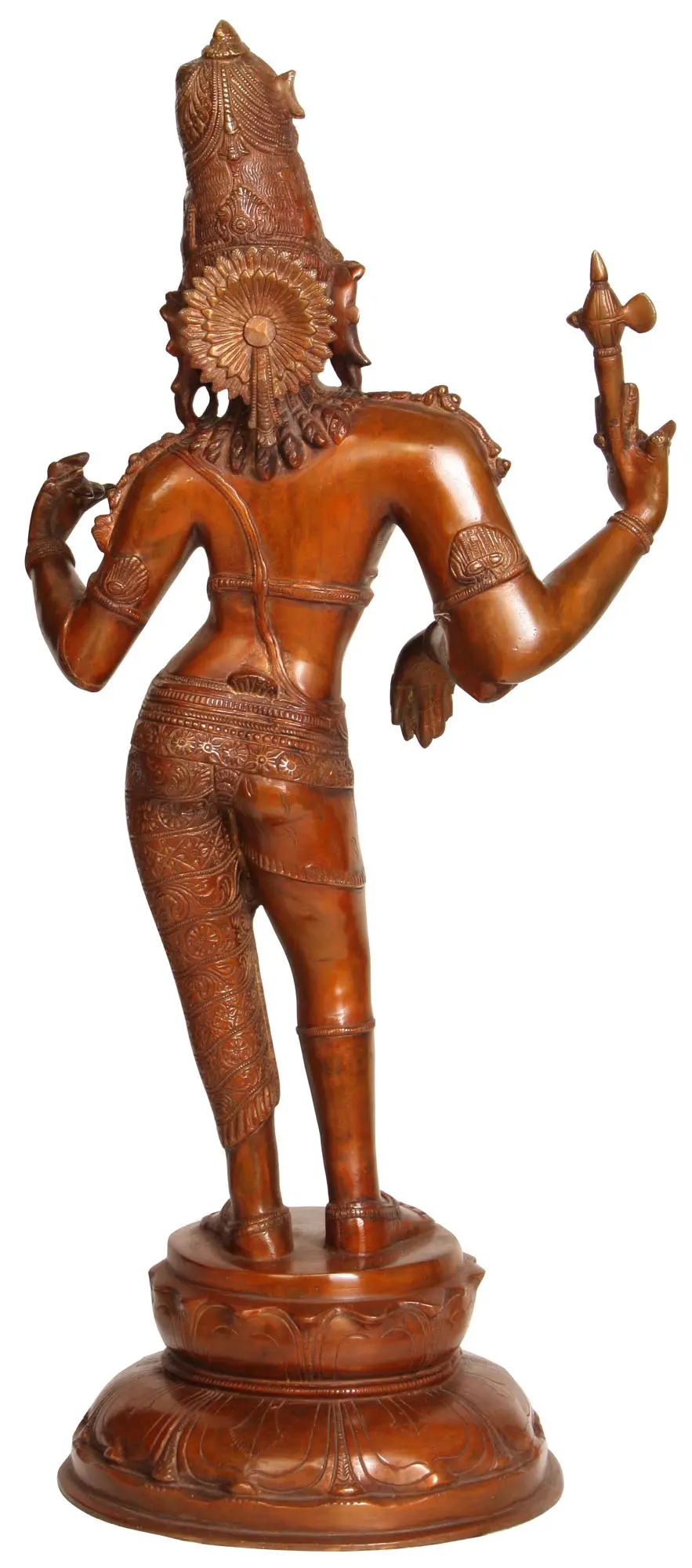 Behold this magnificent brass statue, a striking representation of Ardhanarishvara, the composite and androgynous form of the Hindu deities Shiva and Parvati. This powerful deity symbolizes the fusion of masculine and feminine energies, the creative and destructive forces, and the inherent duality that pervades the universe. Crafted with exceptional artistry in India, this large-scale idol stands as a testament to centuries-old traditions of brass casting and devotional craftsmanship. The statue embodies the essence of Ardhanarishvara's divine union. The right half, representing Shiva, is typically depicted with a fierce yet serene countenance, often adorned with serpents and a crescent moon. The left half, representing Shakti (Parvati), emanates grace and beauty, often depicted with elaborate jewelry and a more feminine physique. In this particular portrayal, the artist has masterfully captured the subtle yet distinct features that define each divine aspect, highlighting the harmonious balance between them. The intricate details, from the elaborate headdresses to the finely chiseled garments and ornaments, showcase the skill of the artisan and the rich cultural heritage from which this piece originates. ––––––––––