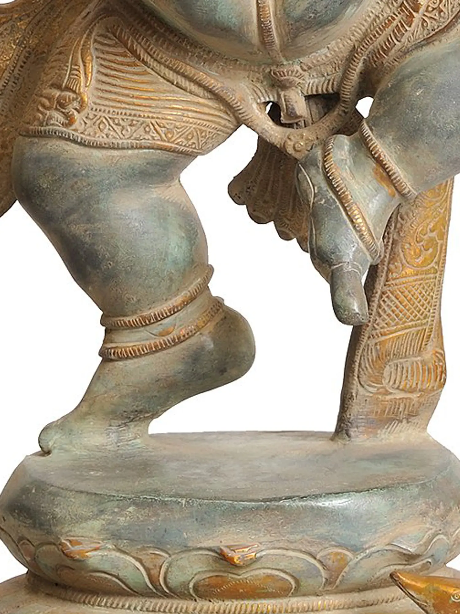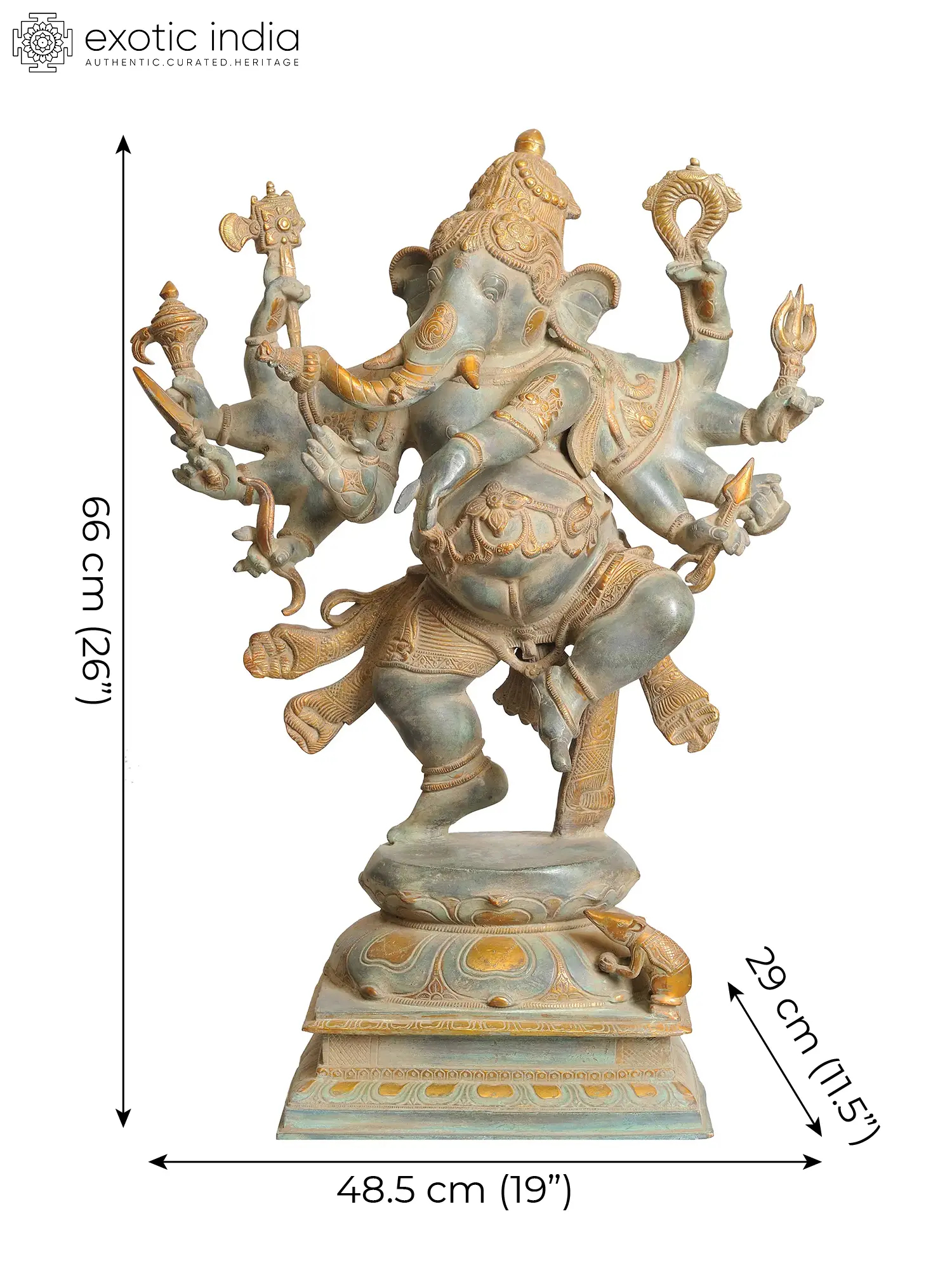 Crafted from high-quality brass, this statue is a testament to the skill of Indian artisans. The fine detailing on Ganesha's ornaments, his divine garments, and the expressions on his face speak volumes about the reverence and dedication poured into its creation. The textured finish and carefully applied patina give the brass a rich, aged appearance, evoking the aura of ancient deities. Ganesha, the elephant-headed god, is one of the most beloved deities in Hinduism, revered as the god of beginnings, wisdom, intellect, and prosperity. While commonly depicted as a benevolent figure who removes obstacles, his warrior aspect is invoked during times of great spiritual or existential crisis, reminding devotees of the inner strength and divine protection available to them. This Ashtabhuja-dhari Yuddha Ganesha statue serves as a powerful reminder to face life's battles with wisdom, courage, and unwavering faith.