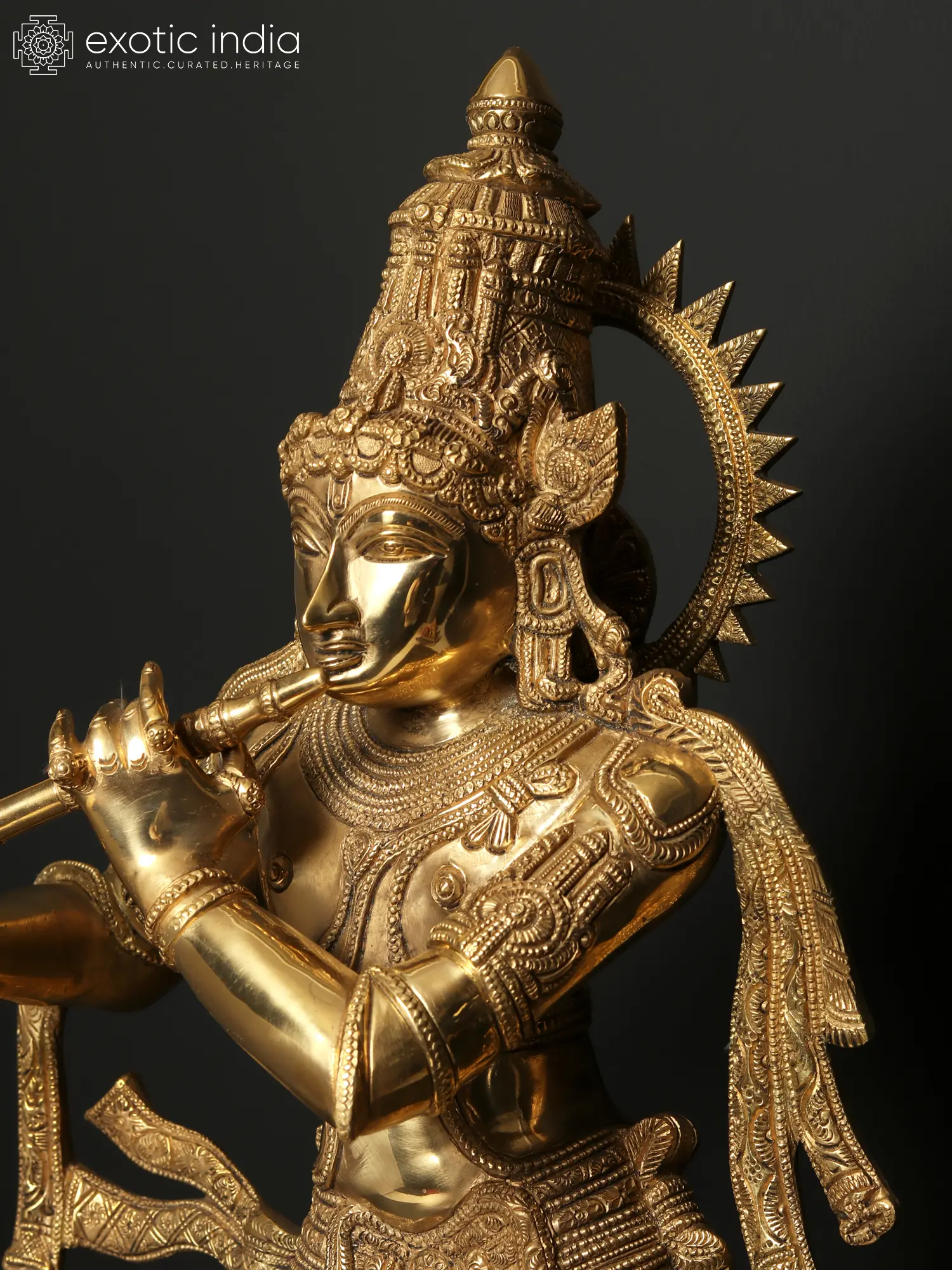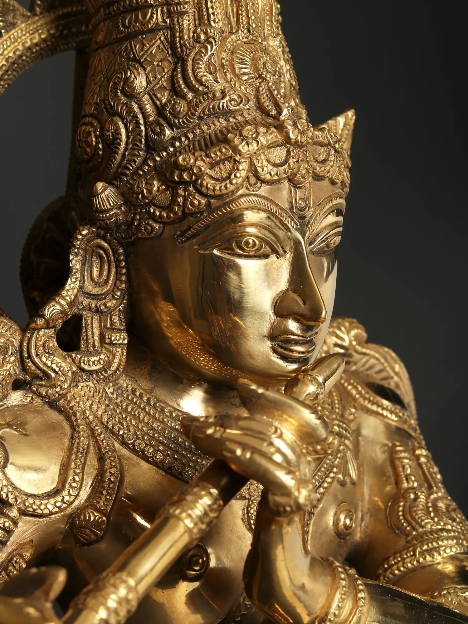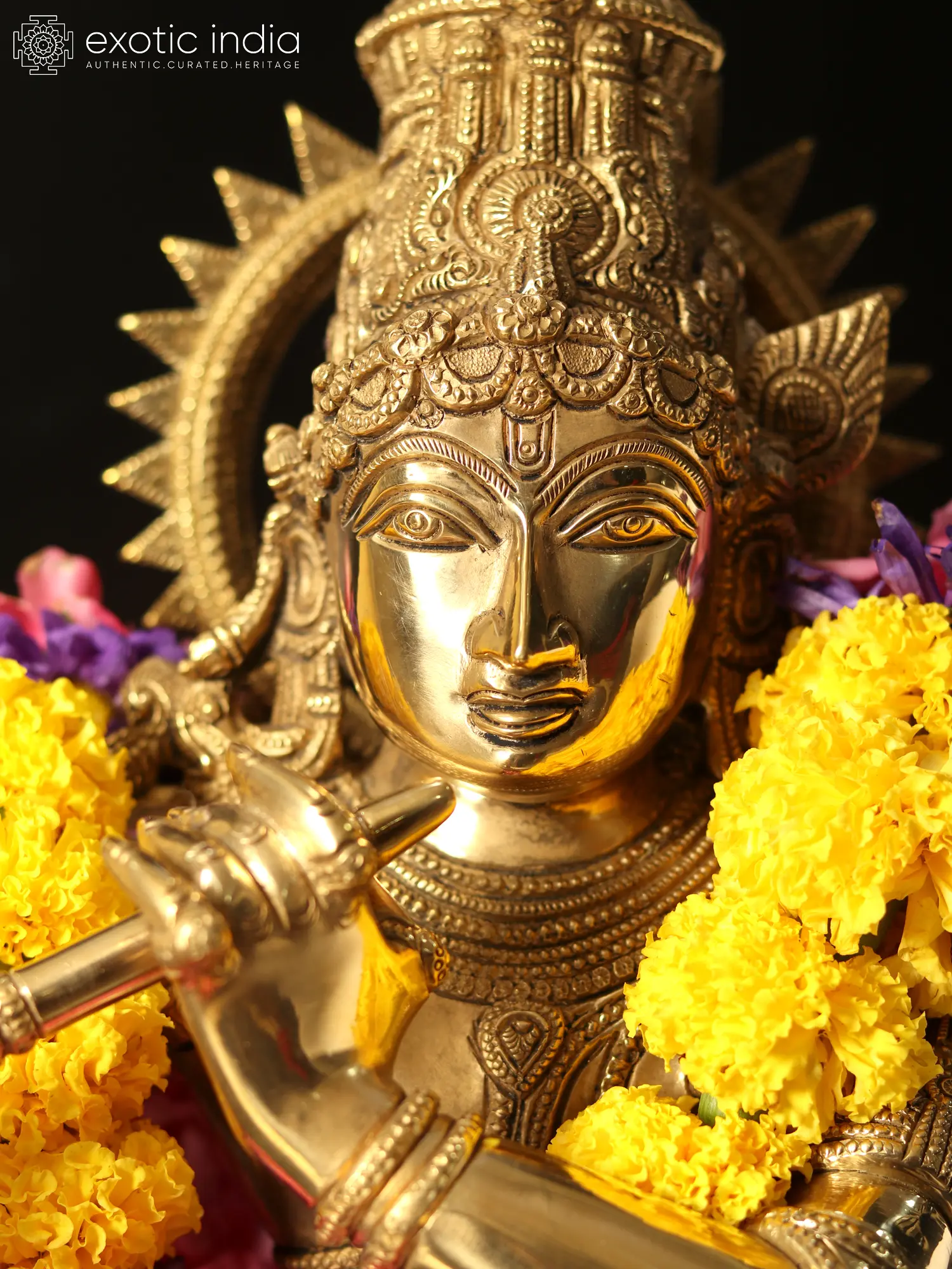 In the ethereal realm of divine artistry, Lord Krishna, “also known as Adidev”, stands on a lotus podium in “Natvarasana posture”, captivating souls with his enchanting melody. Clad in regal attire, adorned with jewels that shimmer like stars, and crowned with the “RatnaPara”, He is the epitome of celestial grandeur. As his nimble fingers caress the flute, a symphony of love and devotion echoes through the cosmos. His music transcends earthly confines, drawing all into its magnetic embrace. This mesmerising portrayal, crafted in brass, signifies Krishna’s divine play. It invites us to transcend worldly concerns, to seek spiritual union, and to find solace in the harmonious dance of life, surrendering to the cosmic serenade of the divine.