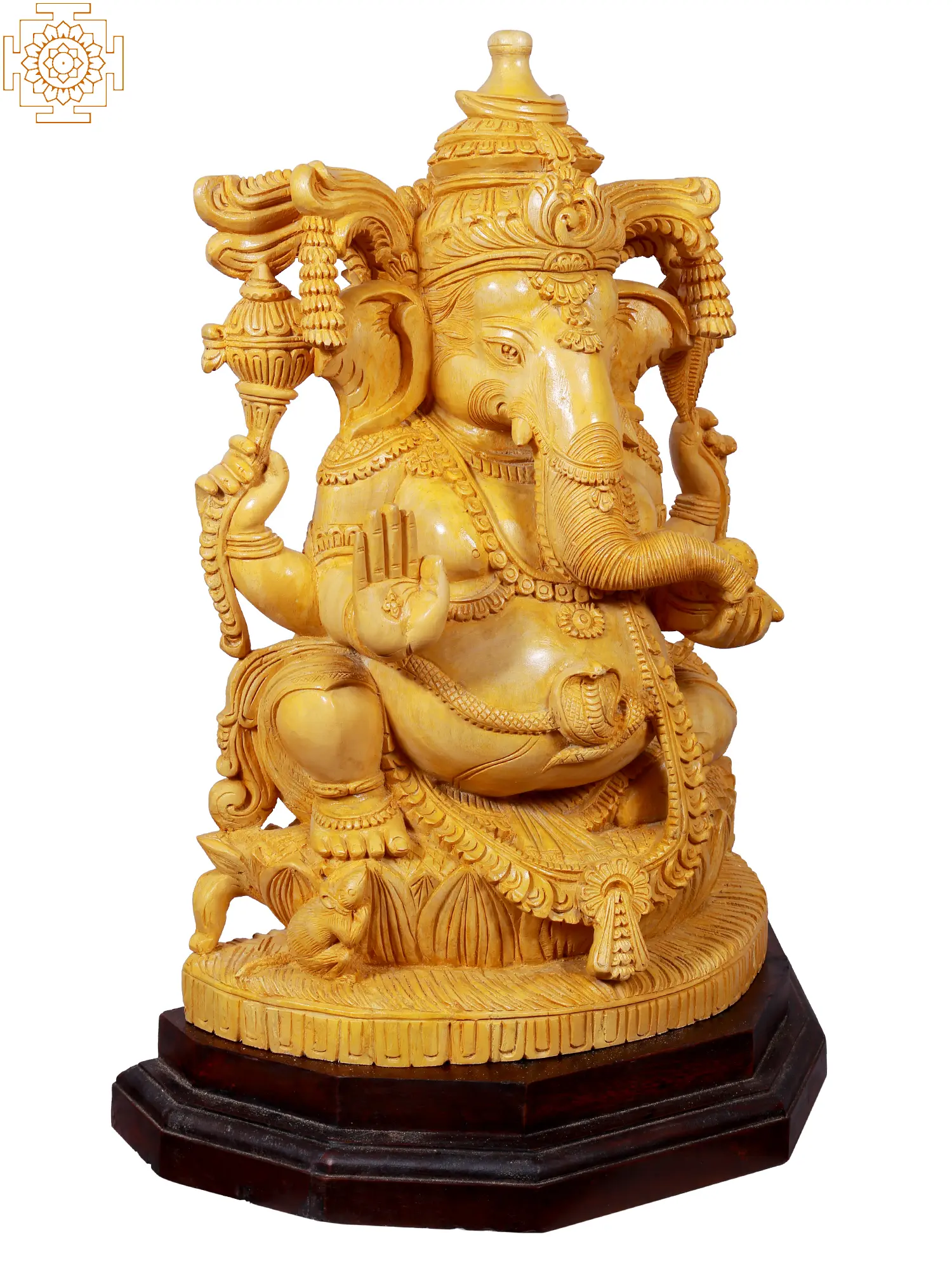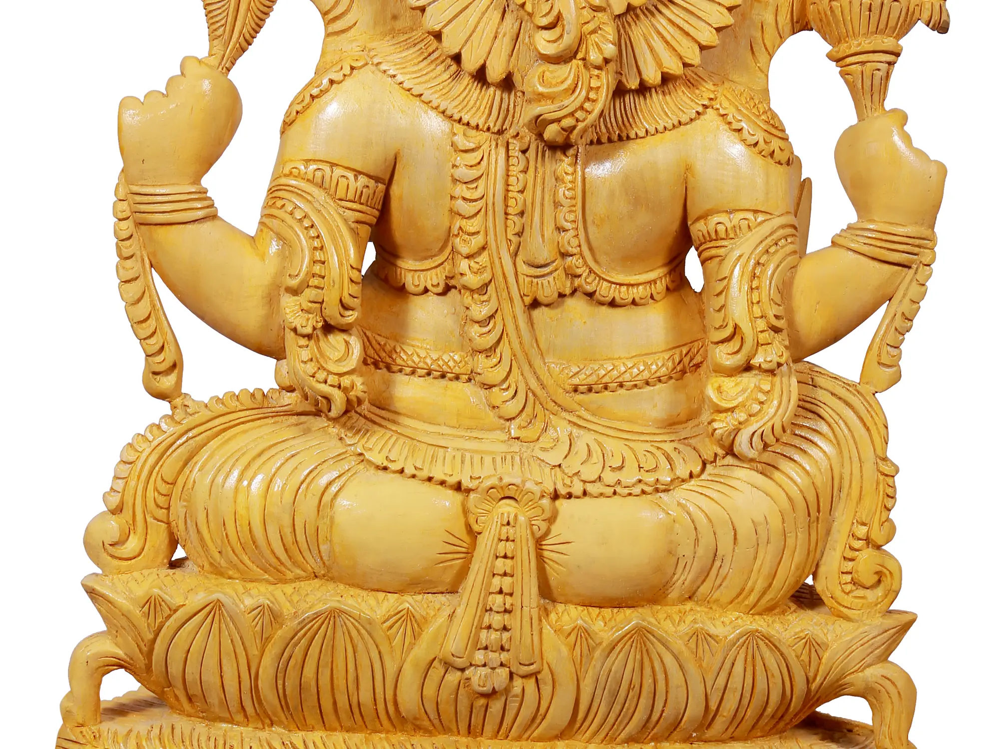 This impressive 26-inch statue showcases the artistry of traditional wood carving. The warm, natural tone of the white wooden craft highlights the intricate details, from the delicate adornments and jewelry that grace Ganesha’s form to the serene expression on his face. Each curve and contour has been thoughtfully rendered, creating a piece that is both aesthetically pleasing and spiritually resonant. The Ganesha is depicted seated gracefully on an ornate pedestal, which is further elevated by a sturdy, octagonal wooden base, adding to its grandeur and stability. The meticulous carving extends to the lotus that forms the seat, a symbol of purity and spiritual awakening. The hands of Ganesha are posed in mudras that convey blessings and reassurance.