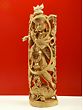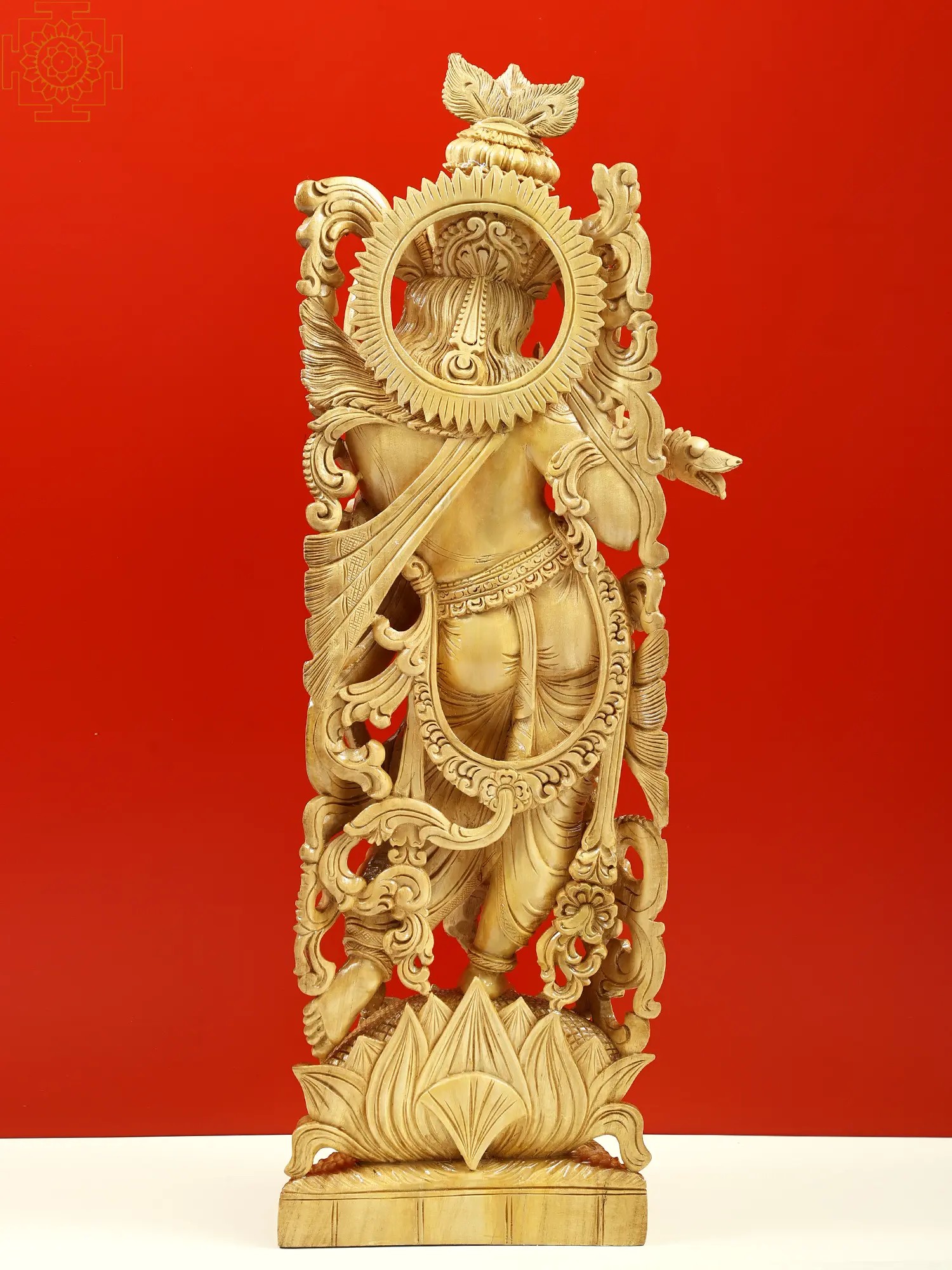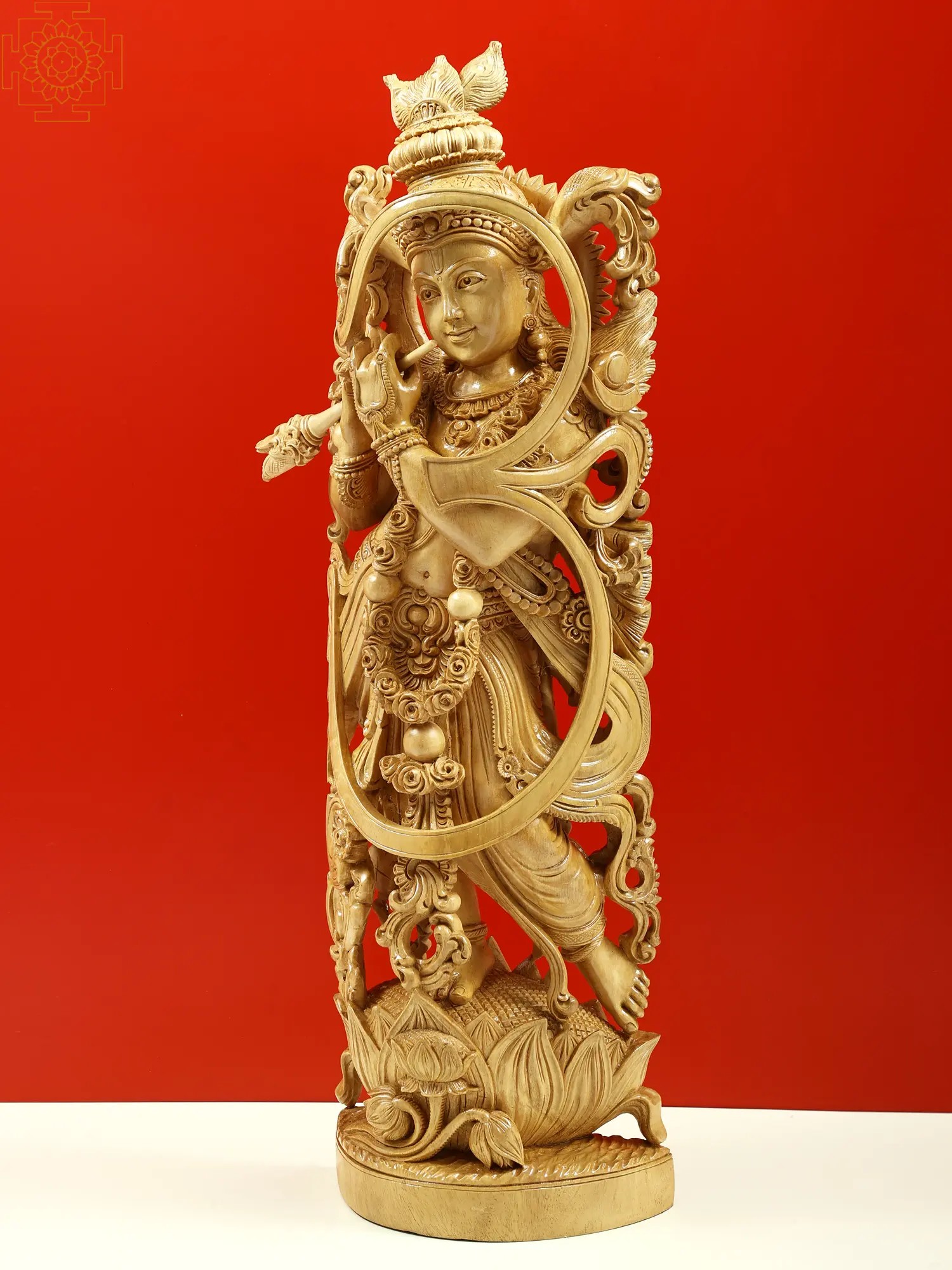 Three beautiful Mor Pankh (peacock feathers) are tidily tucked in the jeweled mukut (crown) adorning the head of Sri Krishna. His realistically carved ornaments include- earrings, a gorgeous necklace with lotus petal designs, a waist belt with pearl, and precious metal arranged in a number of parallel lines. His bansuri (flute) with the Makara (a mythical crocodile-like animal) motif at its end is held gracefully in his hands, as pretty as the flowers of spring, their appeal enhanced by the Haath Phool (set of rings with attached strings of pearls and bracelet) worn by the Lord. His dhoti worn in Kaccha style clings beautifully to his body, while his Uttariya freely flows, mingling with the vines germinating from and around Krishna. Krishna’s male energies (Purush) combine with the female potencies (Prakriti) represented by the stylized creepers blossoming rhythmically. The physique of Sri Krishna puts to shame the beauty of Kamadeva, the god of love, and our woodwork here has rightly captured this idea. The brilliance of Krishna’s youthful figure is highlighted by the Vanamala, the garland of exotic fauna found deep in the forest, and the yajnopavita (sacred thread). The potent incarnation of Vishnu stands with poise on an extremely naturalistic lotus flower, carved in a semi-circle, decorated at its base with a bunch of lotuses, sprouting out of the waves below, representing the primordial waters from which all life forms emerged. Krishna stands Contrapposto (the majority of his body weight shifted on one leg) looking like an image of beauty and charm. What makes this wood statue stand apart is the Om, the primordial sound framing the image of Krishna. The artist wants us to see the paradoxical nature of Sri Krishna, the centre of the universe. He is Saakar, has a form, and the most exquisite form at that as well as Nirakaar- formless. Like the sound of Om, he cannot be seen, but heard, experienced. He and Om are one. He is Pranav- a term used to denote both Om and Lord Vishnu.