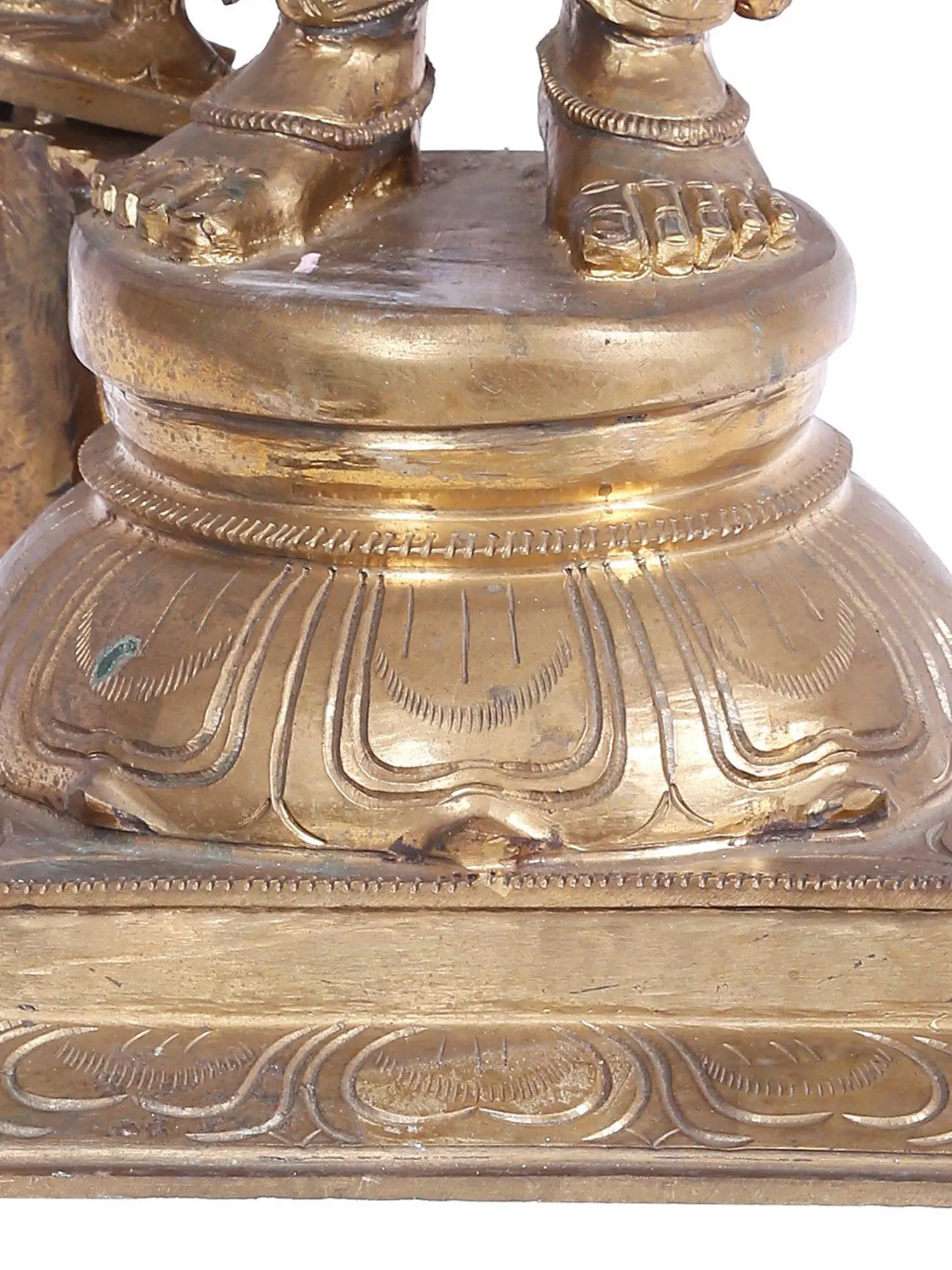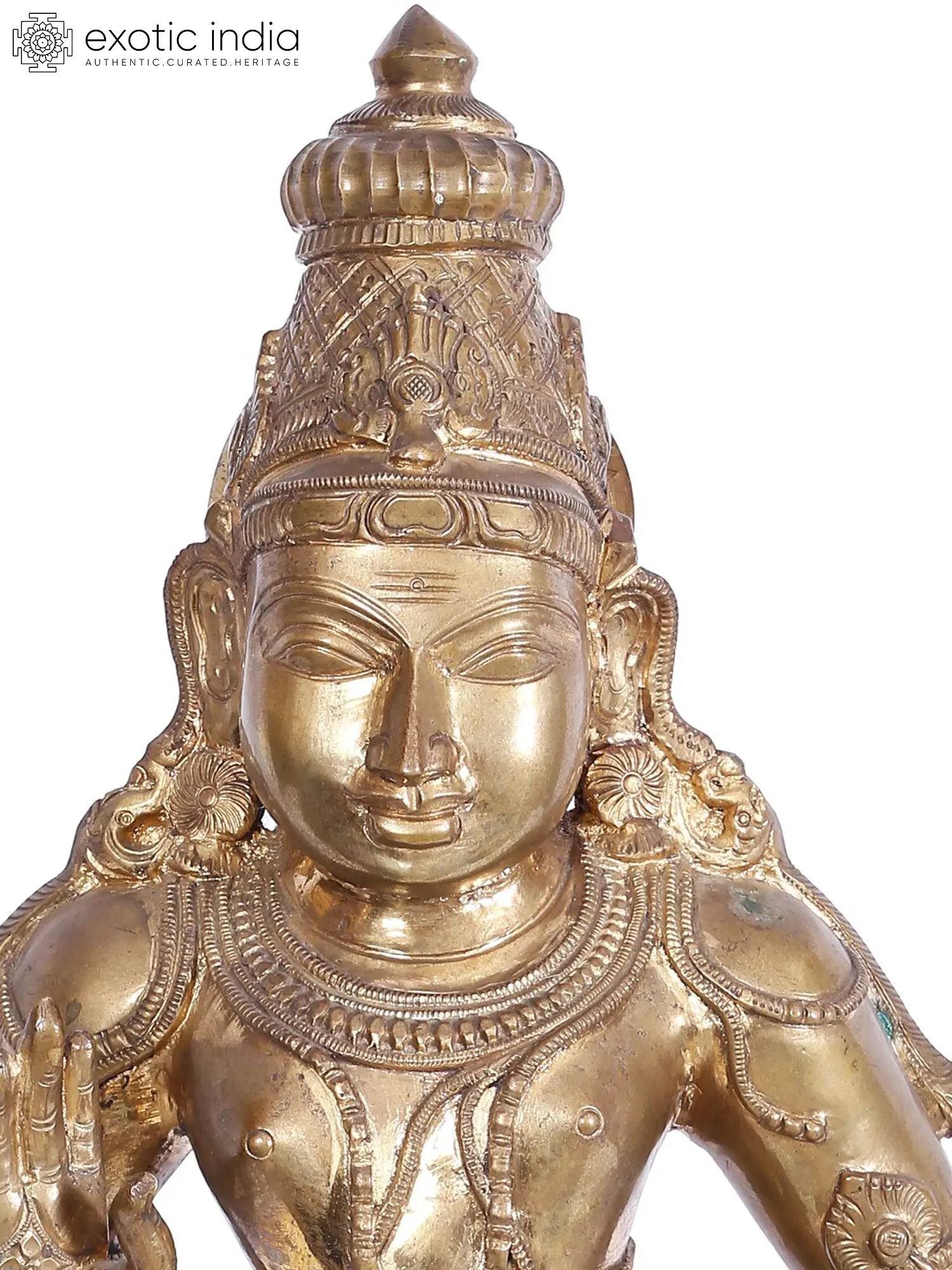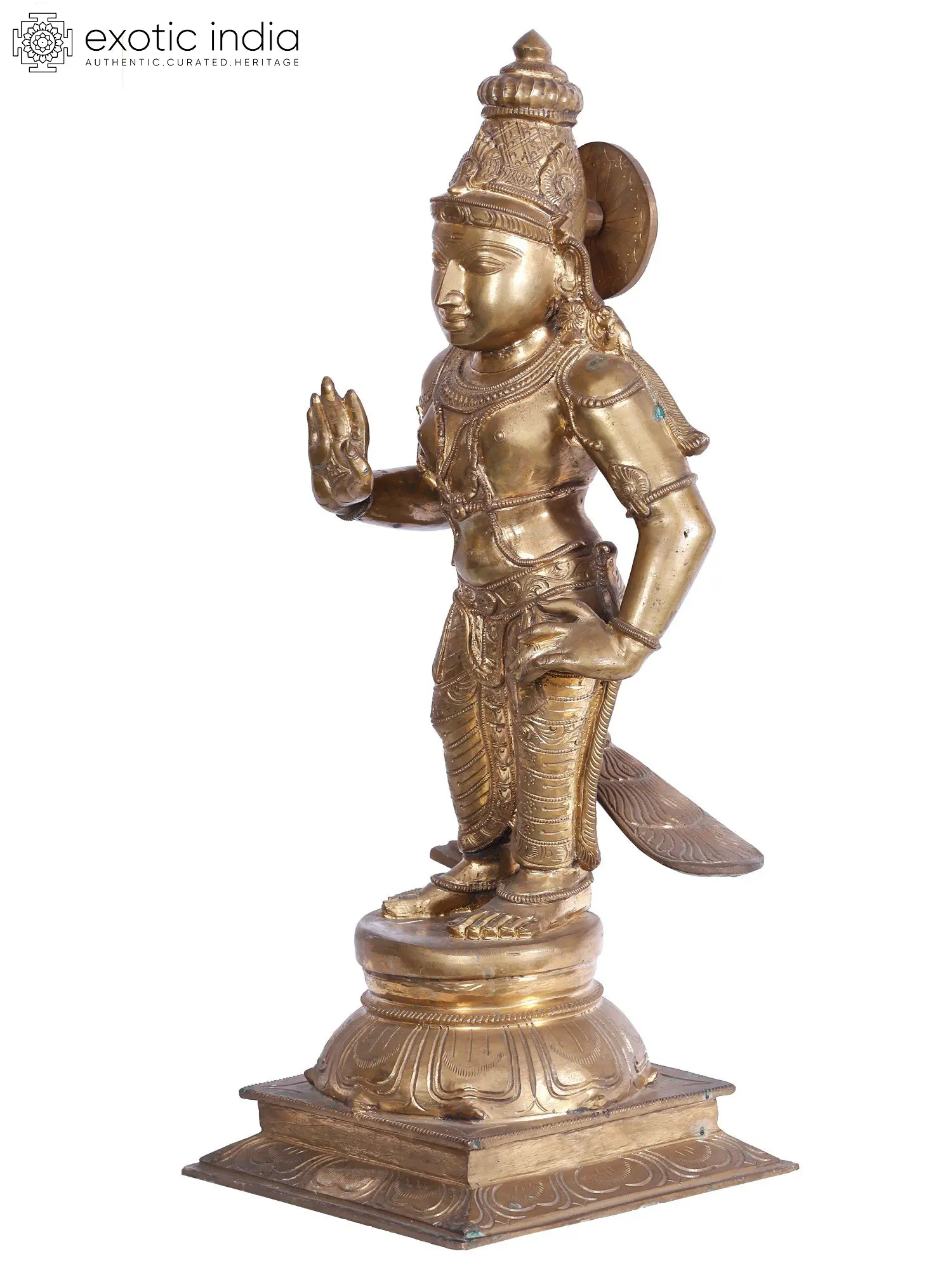 In this bronze statue, Murugan or Kumara Karttikeya stands atop a lotus pedestal, in a benevolent mood, with an imposing crown, ornaments, and Yajnopavita enhancing his heavenly aura. Accompanied by his Vahana, Mayura, Murugan lifts his hand in the mudra of fearlessness, signifying his protective presence in the lives of his devotees.