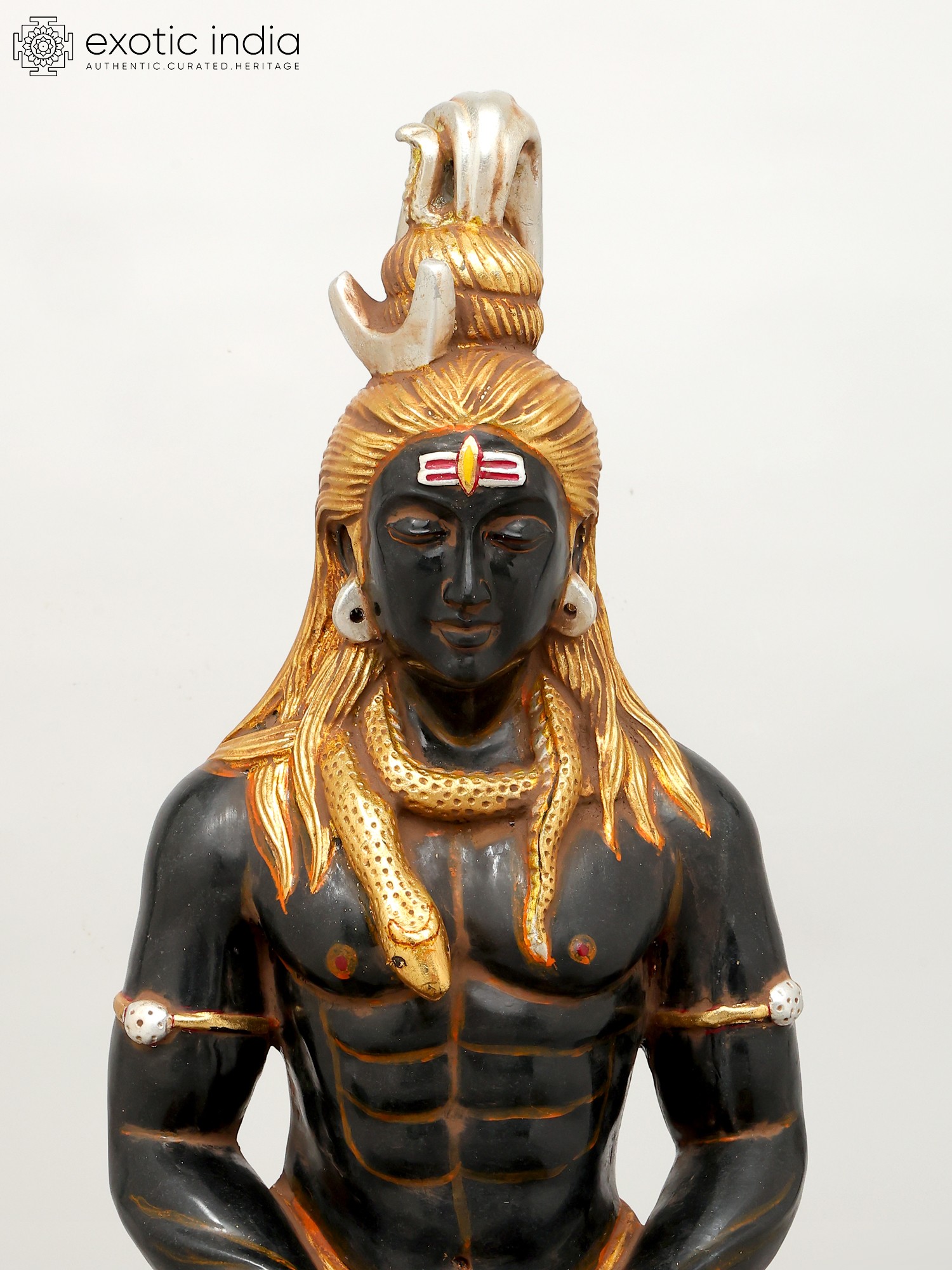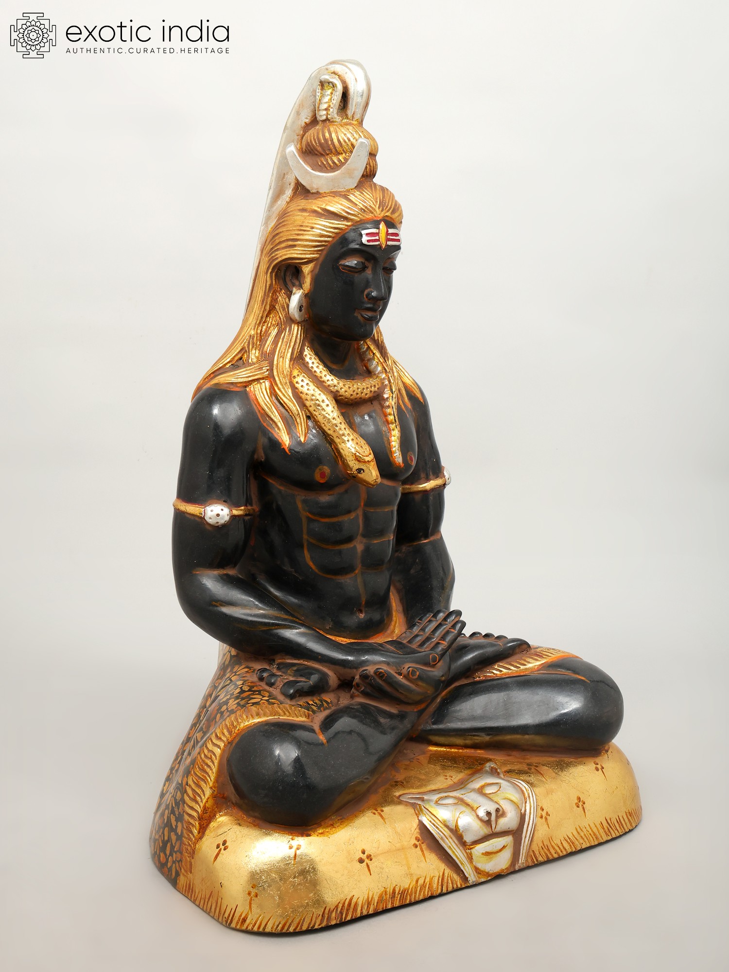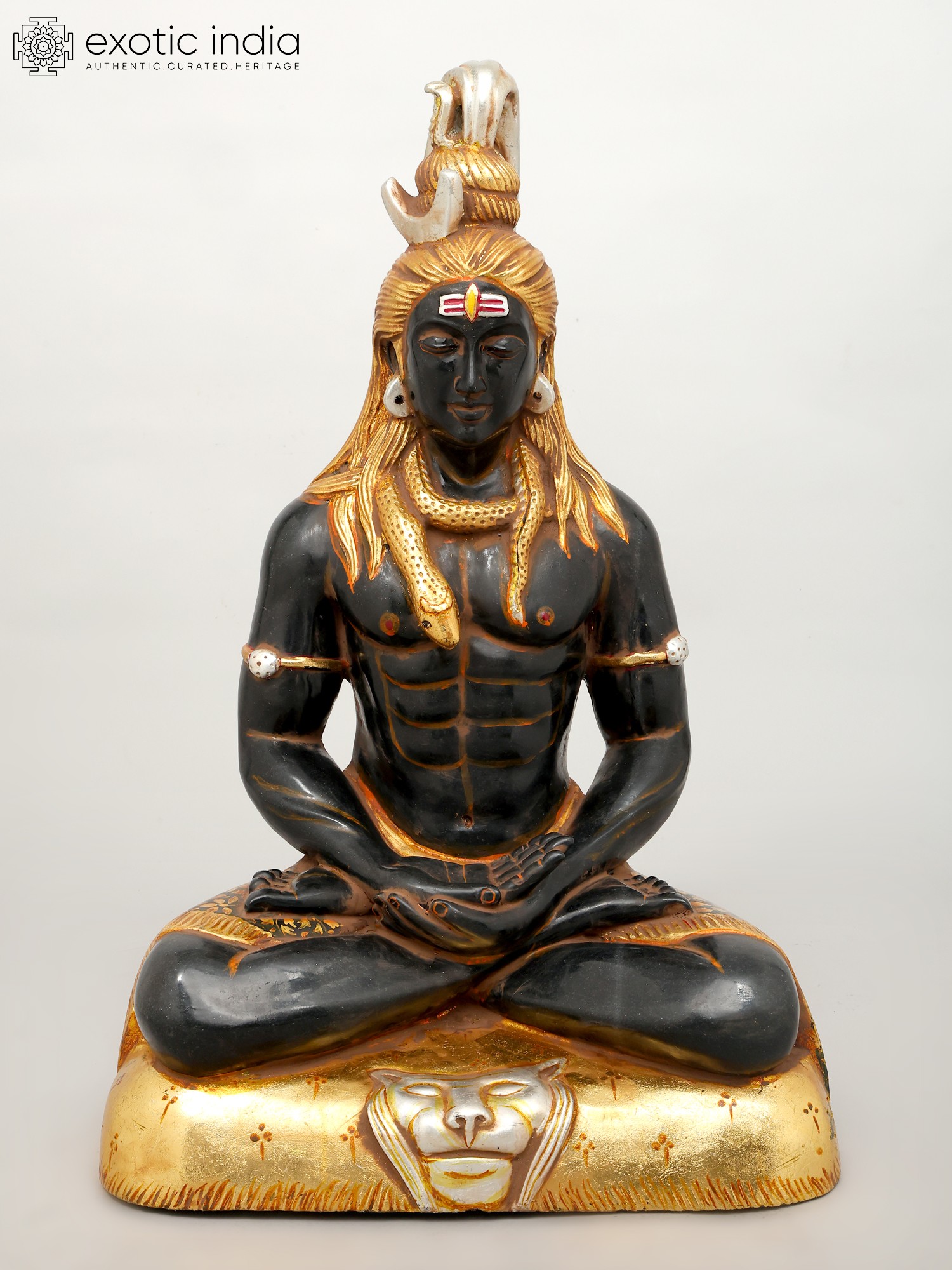 This magnificent statue captures the serene yet powerful presence of Lord Shiva, revered as the Adiyogi, the first yogi, and the Mahadeva, the great god. Crafted from exquisite white marble, the figure is rendered in a striking black hue, a color deeply symbolic in Hinduism, representing the primordial void from which all creation emerges, and the ultimate reality that transcends form. The contrast of black with the shimmering gold accents evokes the divine aura and the inherent duality of Shiva – the destroyer and the transformer, the ascetic and the householder, the fierce and the benevolent. The deity is depicted in a meditative posture, Padmasana, with hands resting in a gesture of profound stillness and contemplation. This posture is not merely physical; it represents the yogic path to inner liberation, a state of perfect balance and tranquility. The third eye, a prominent symbol of Shiva's omniscience and cosmic awareness, is etched on his forehead, often depicted as a focal point for spiritual insight and understanding. The flowing locks of hair, characteristic of Shiva, cascade around his head, some adorned with the crescent moon, a symbol of time and his cyclical nature. ––––––––––––––––––