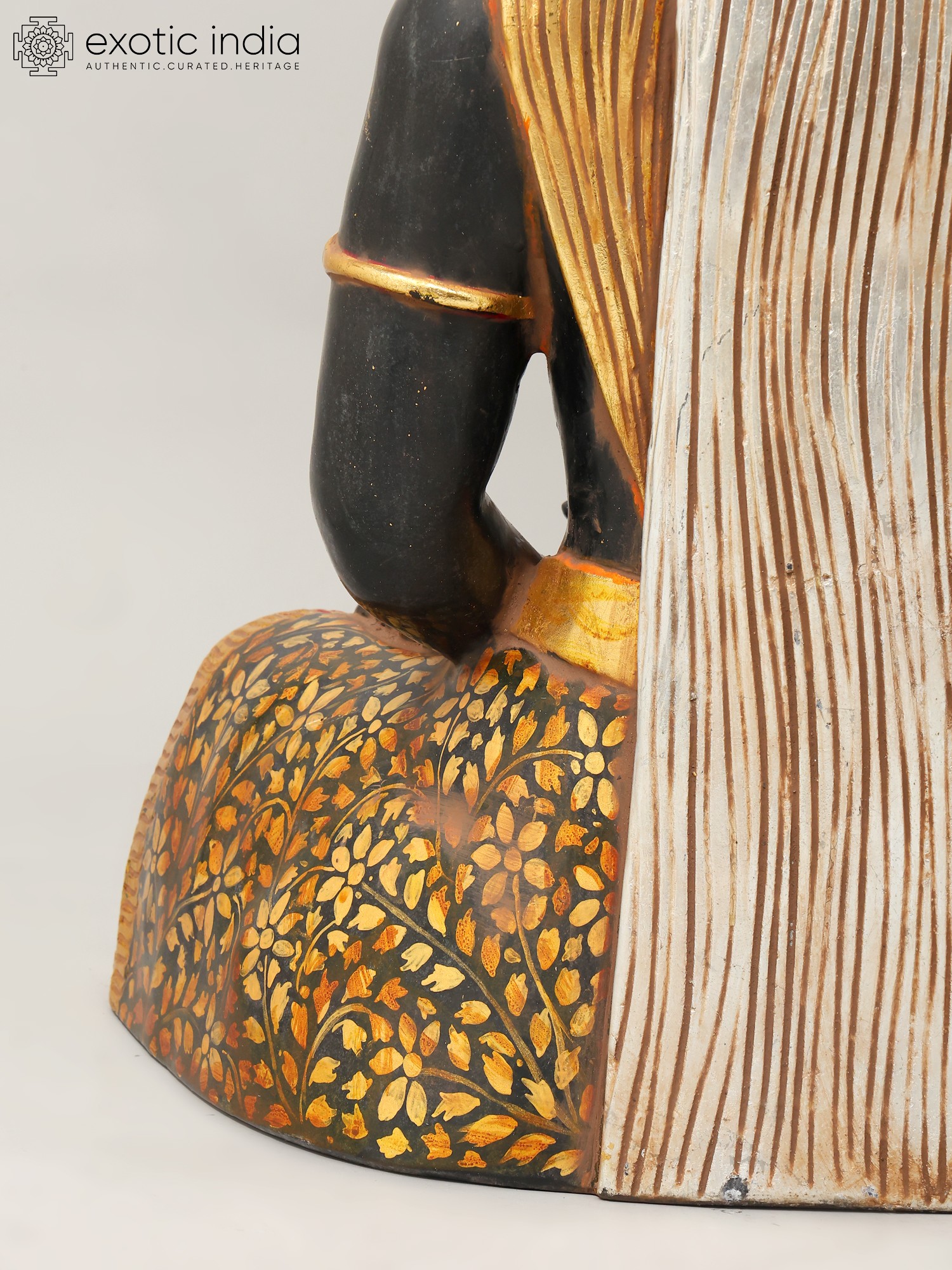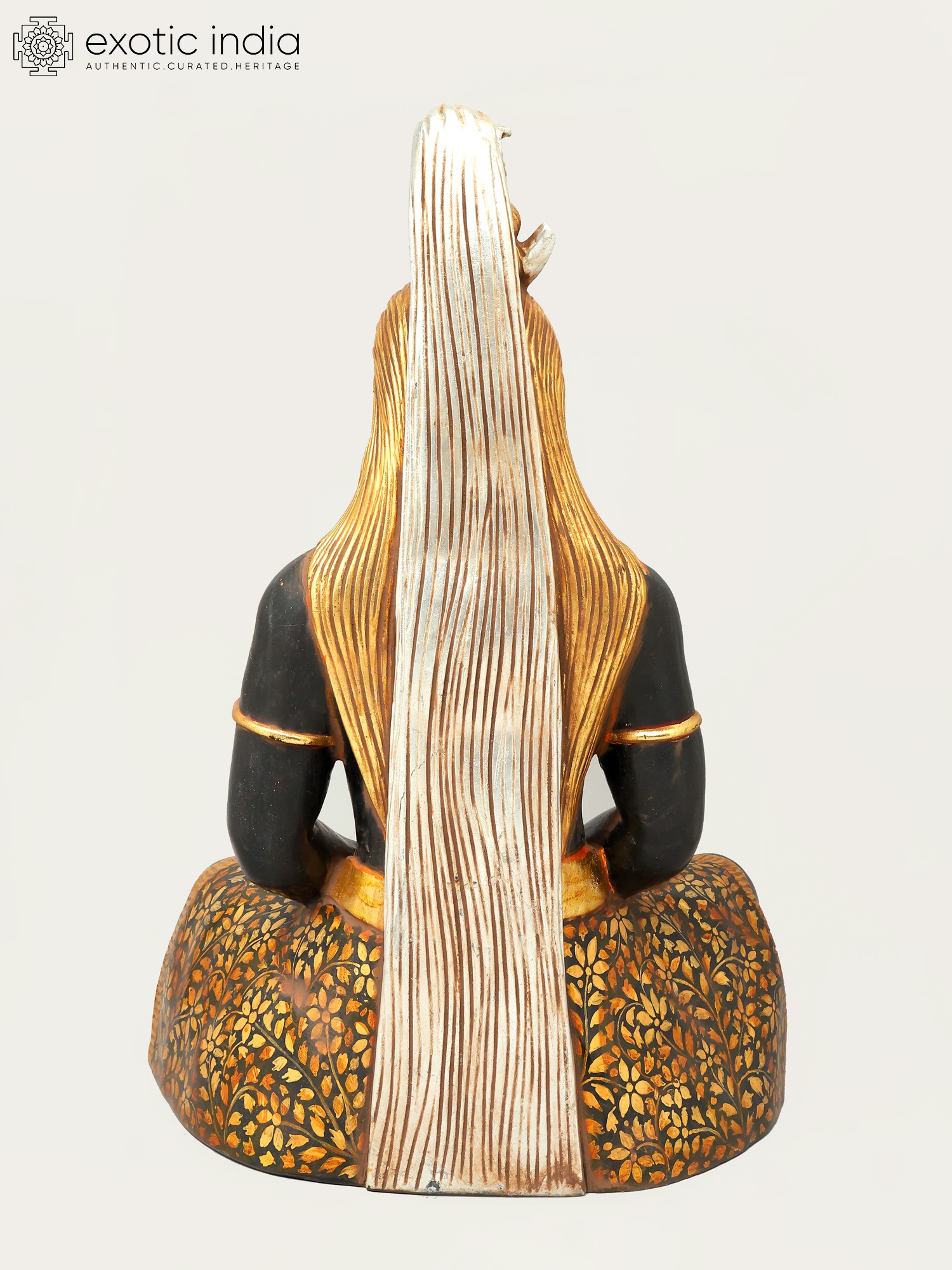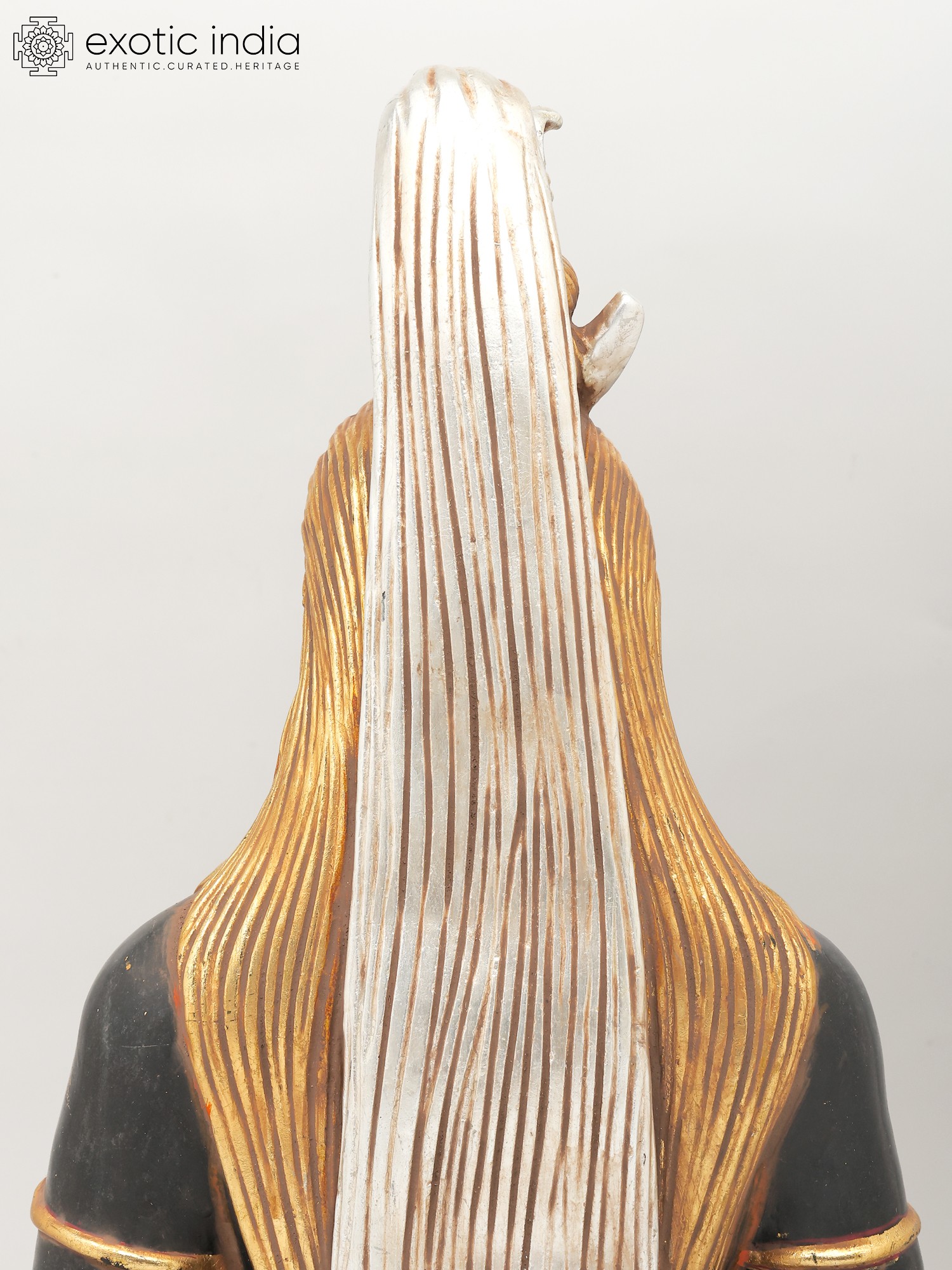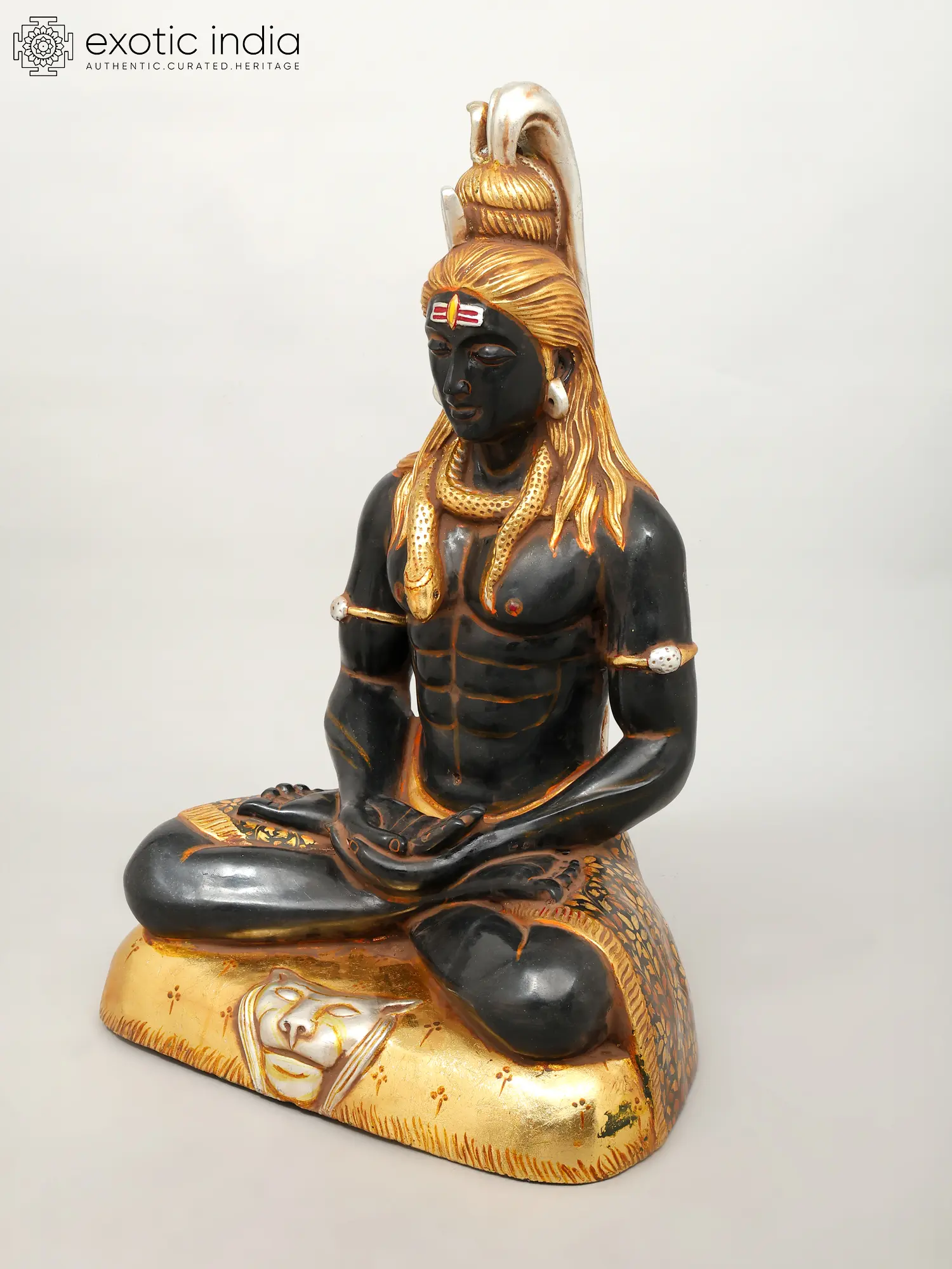 This magnificent statue captures the serene yet powerful presence of Lord Shiva, revered as the Adiyogi, the first yogi, and the Mahadeva, the great god. Crafted from exquisite white marble, the figure is rendered in a striking black hue, a color deeply symbolic in Hinduism, representing the primordial void from which all creation emerges, and the ultimate reality that transcends form. The contrast of black with the shimmering gold accents evokes the divine aura and the inherent duality of Shiva – the destroyer and the transformer, the ascetic and the householder, the fierce and the benevolent. The deity is depicted in a meditative posture, Padmasana, with hands resting in a gesture of profound stillness and contemplation. This posture is not merely physical; it represents the yogic path to inner liberation, a state of perfect balance and tranquility. The third eye, a prominent symbol of Shiva's omniscience and cosmic awareness, is etched on his forehead, often depicted as a focal point for spiritual insight and understanding. The flowing locks of hair, characteristic of Shiva, cascade around his head, some adorned with the crescent moon, a symbol of time and his cyclical nature. ––––––––––––––––––
