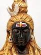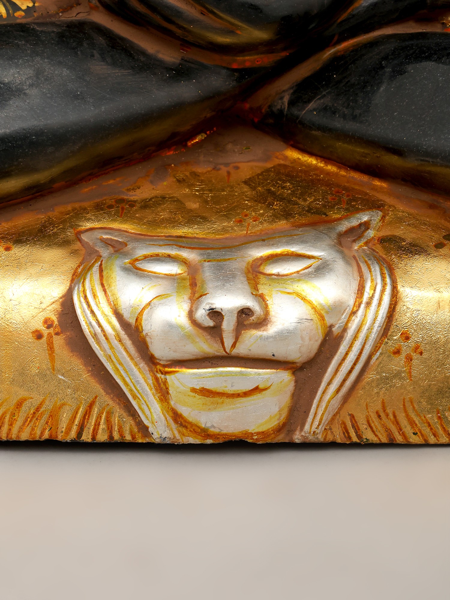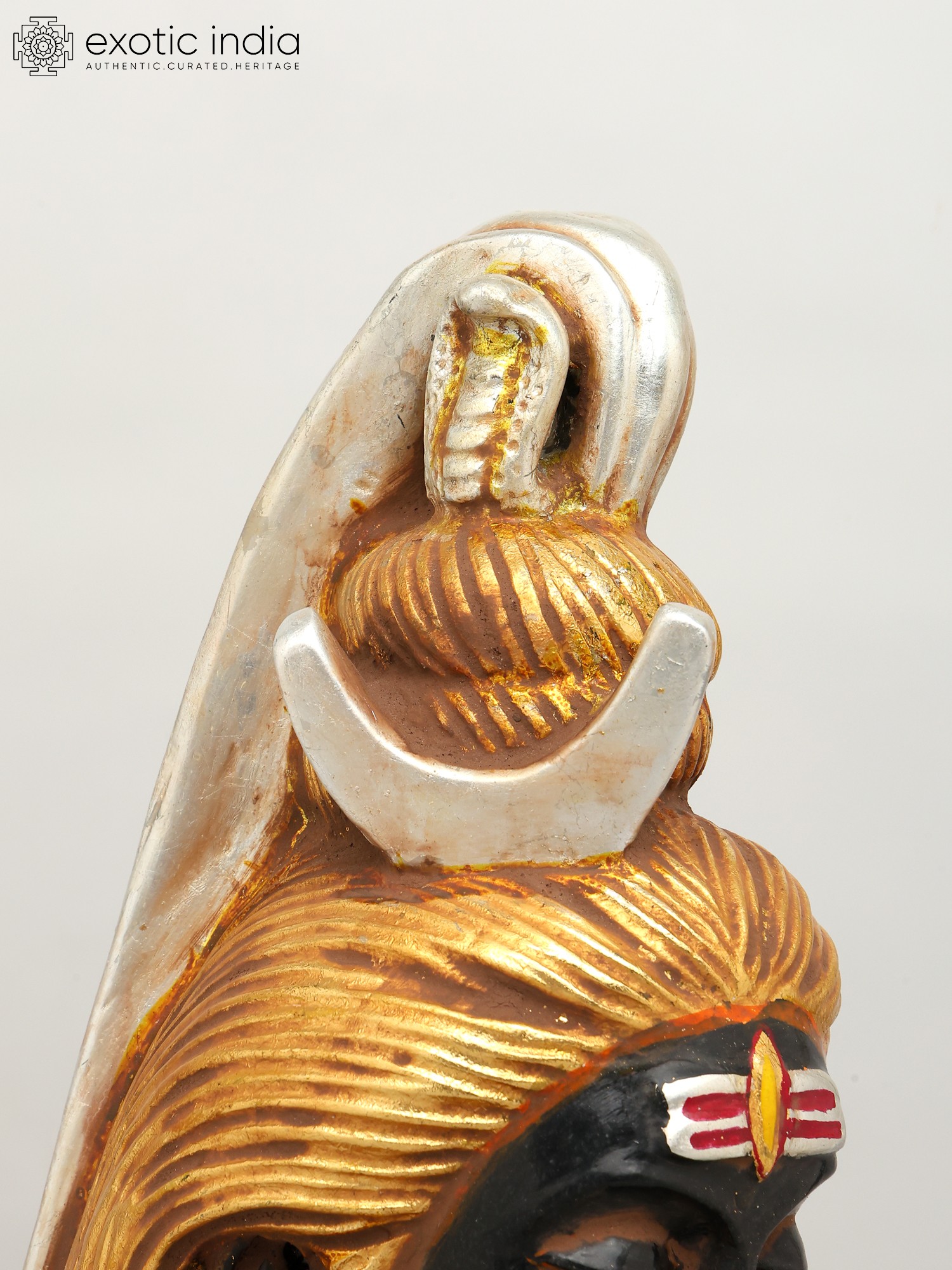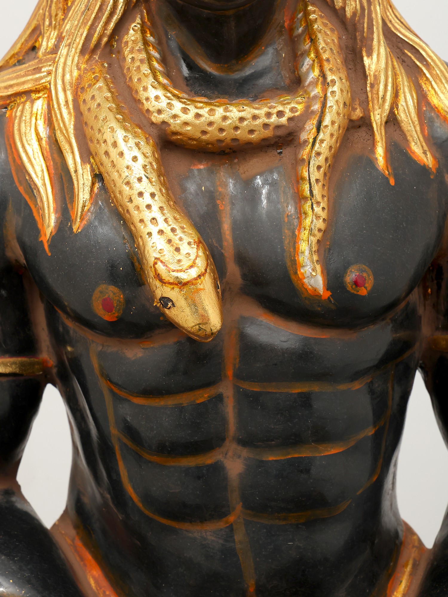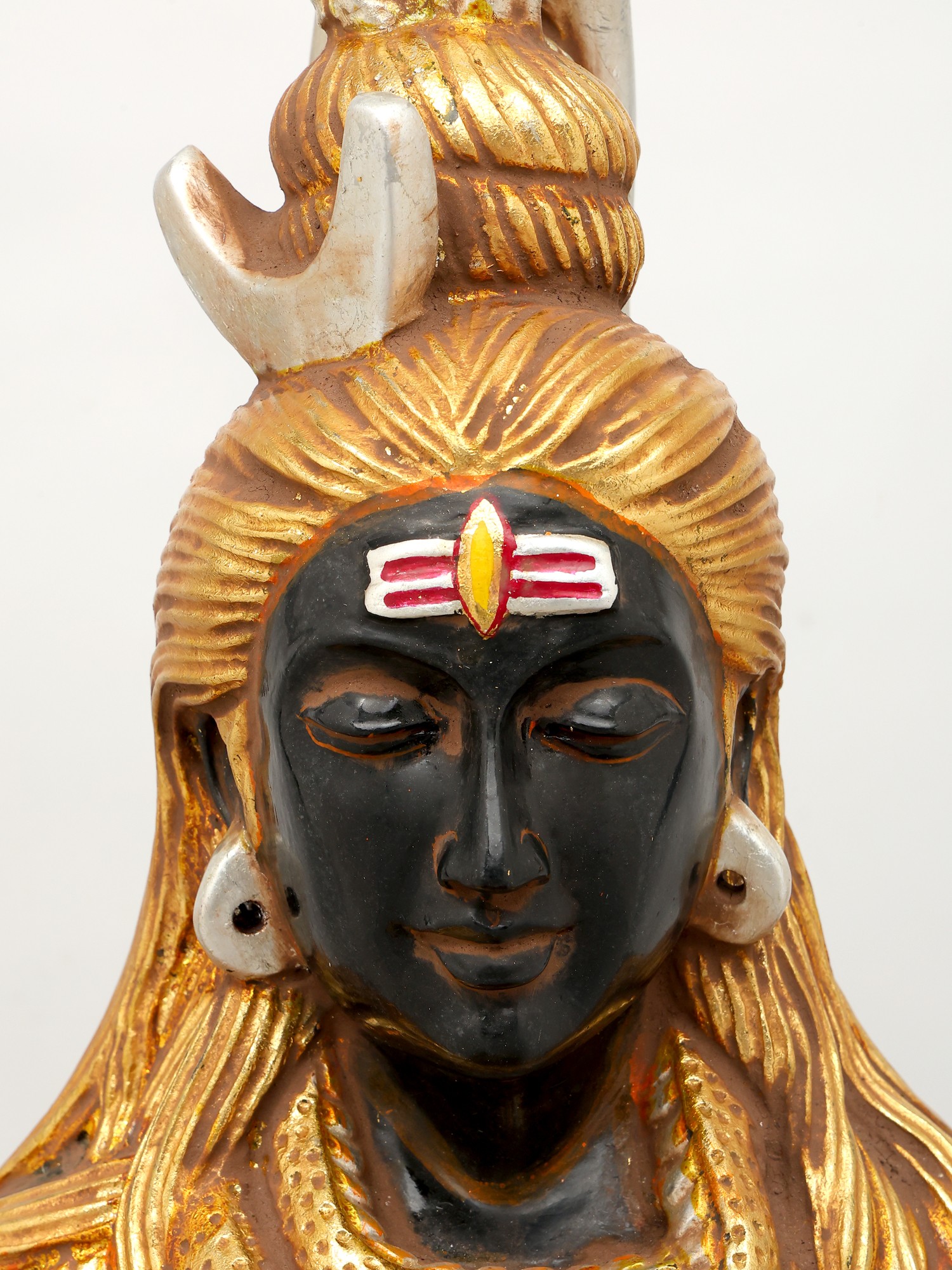 Coiled gracefully around Shiva's neck is a serpent, Vasuki, an emblem of his mastery over fear, ego, and the venomous aspects of existence. In Hindu mythology, Vasuki played a crucial role in the churning of the cosmic ocean (Samudra Manthan) to extract the nectar of immortality. Shiva, by consuming the poison that emerged, saved the universe, thus symbolizing his role as the preserver and protector. The serpent also signifies the awakening of Kundalini, the divine cosmic energy residing within every individual, which, when awakened through yogic practices, leads to spiritual enlightenment. The armbands on his muscular physique further accentuate his divine power and regal bearing. The base of the statue is lavishly decorated with a rich golden finish, signifying prosperity, purity, and the celestial realms. A beautifully sculpted lion's face adorns the front of the base, representing courage, strength, and the conquest of the primal forces. This lion is often associated with Nandi, Shiva's devoted vahana (mount), who embodies unwavering loyalty and devotion. The intricate detailing and the lustrous finish of the gold leaf speak to the artisanal skill and the devotion invested in creating this sacred object. ––––––––––––––––––