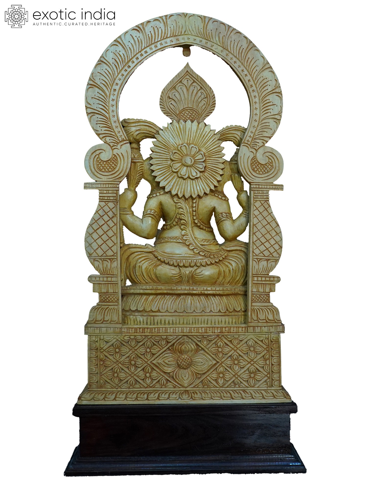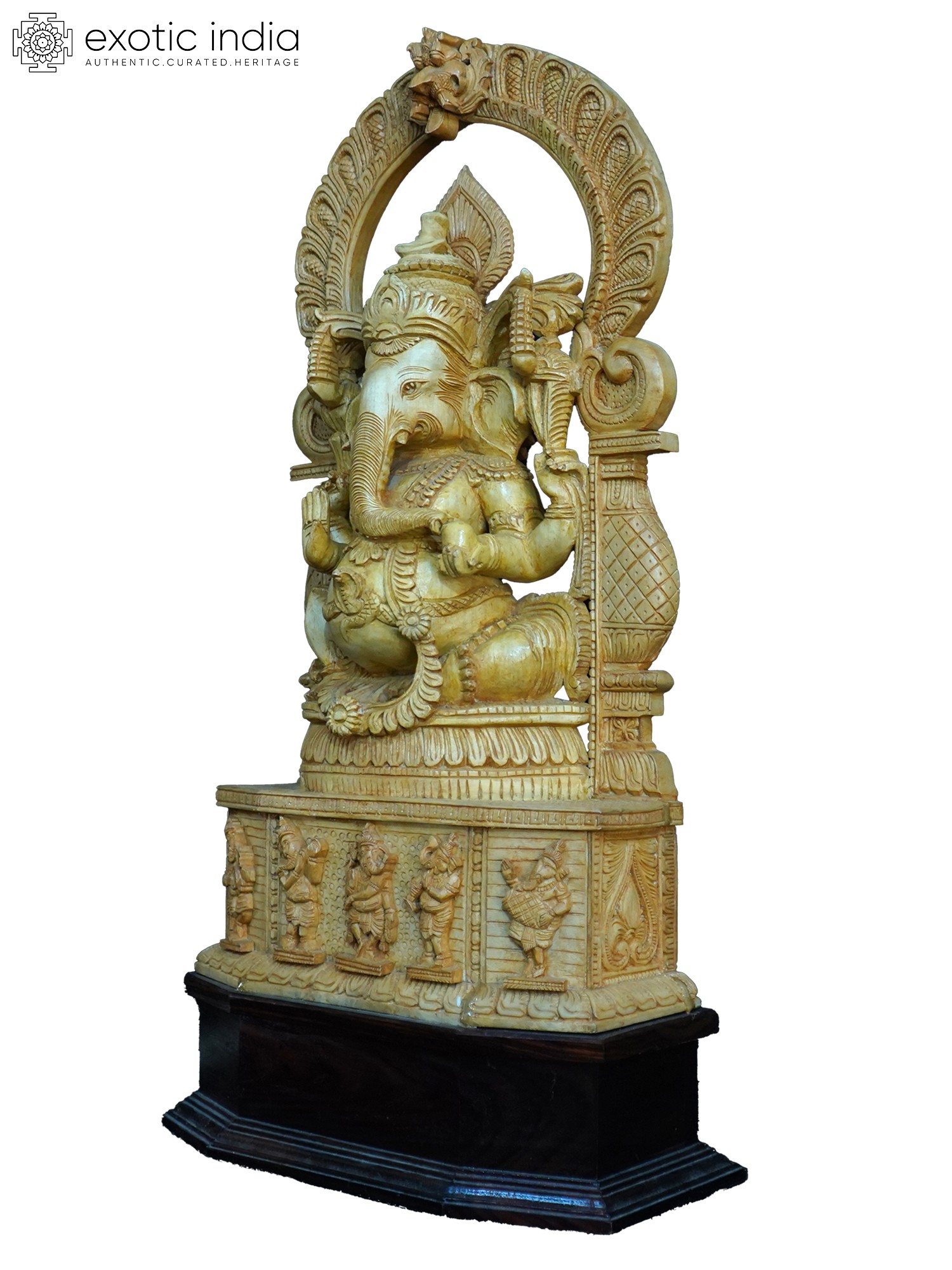 This statue is carefully handcrafted from white wood, adding a tactile dimension to this divine representation. The material provides a unique canvas for the intricate details of Ganesha’s form and the elaborate carvings of the Kirtimukha throne. Note the elaborate detailing on the deity’s jewelry, the folds of his clothing, and the texture of his skin. The meticulous craftsmanship brings Ganesha to life, exuding a sense of serenity and power. Look closely at the base of the throne, where miniature figures, likely attendants or devotees, add a further layer of complexity and visual interest. This statue is more than just a decorative object; it is a sacred representation that can transform any space into a sanctuary of peace and blessings.