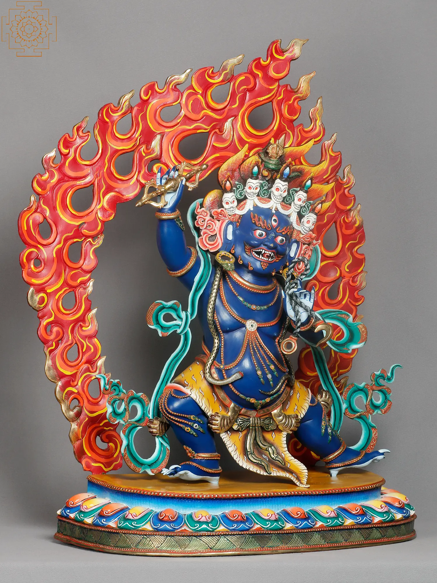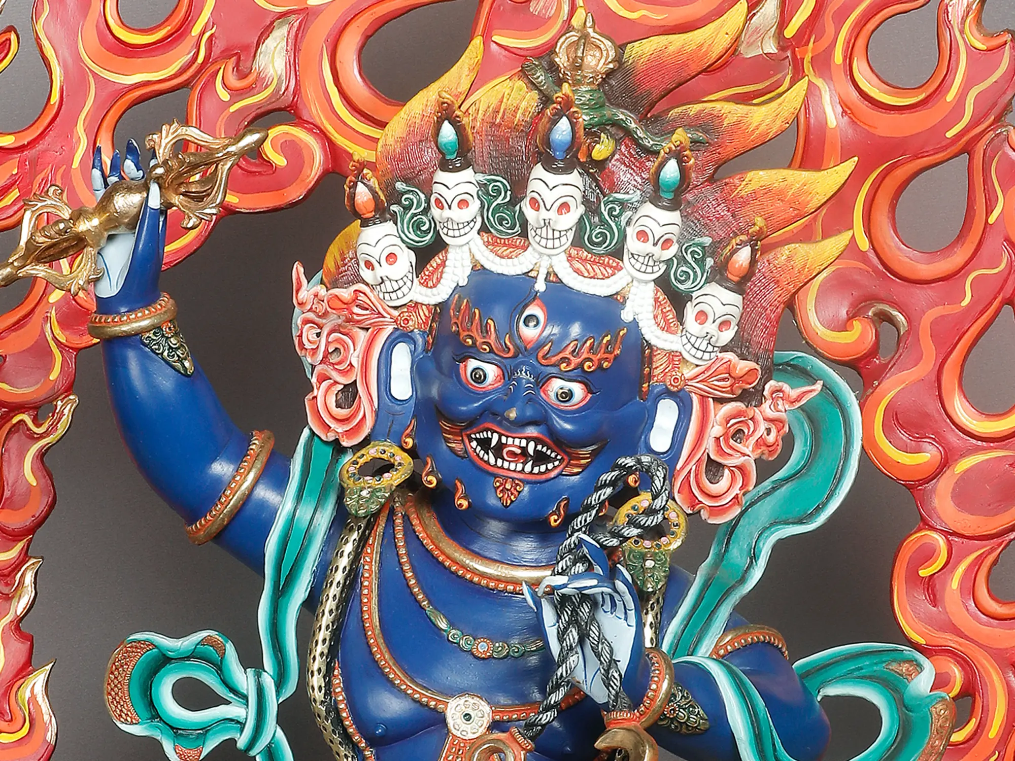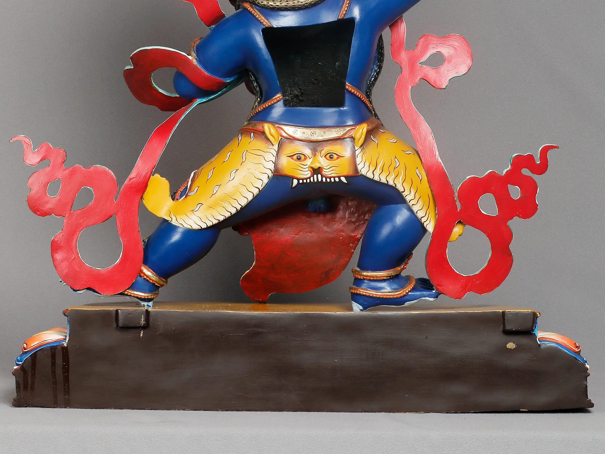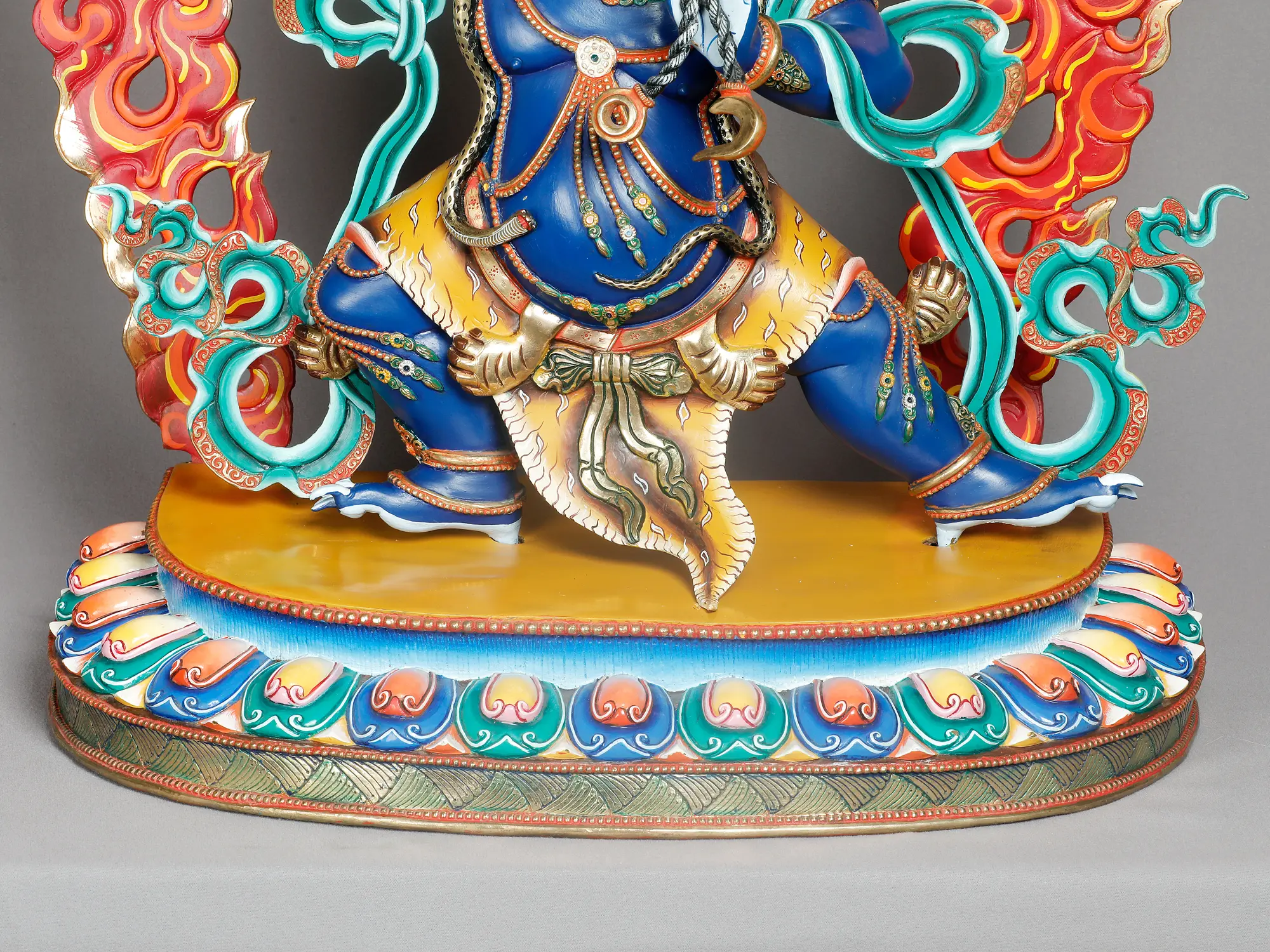 A supremely artistic and spiritually rich vision, this Nepalese statue of Vajrapani is magnificent in detailing and effect on the onlooker. The wielder of the Vajra stands lunging inside a fiery aureole, in a blue-skinned form, which represents the expansiveness of Vajrapani. The attributes of this Nepalese statue- flying brocade scarf and tiger hide attire, the posture of Vajrapani, and his expressions are filled with dynamism beyond words. Meticulously painted, this is a powerful manifestation of the sacred and potent benevolence of the guardian deity.