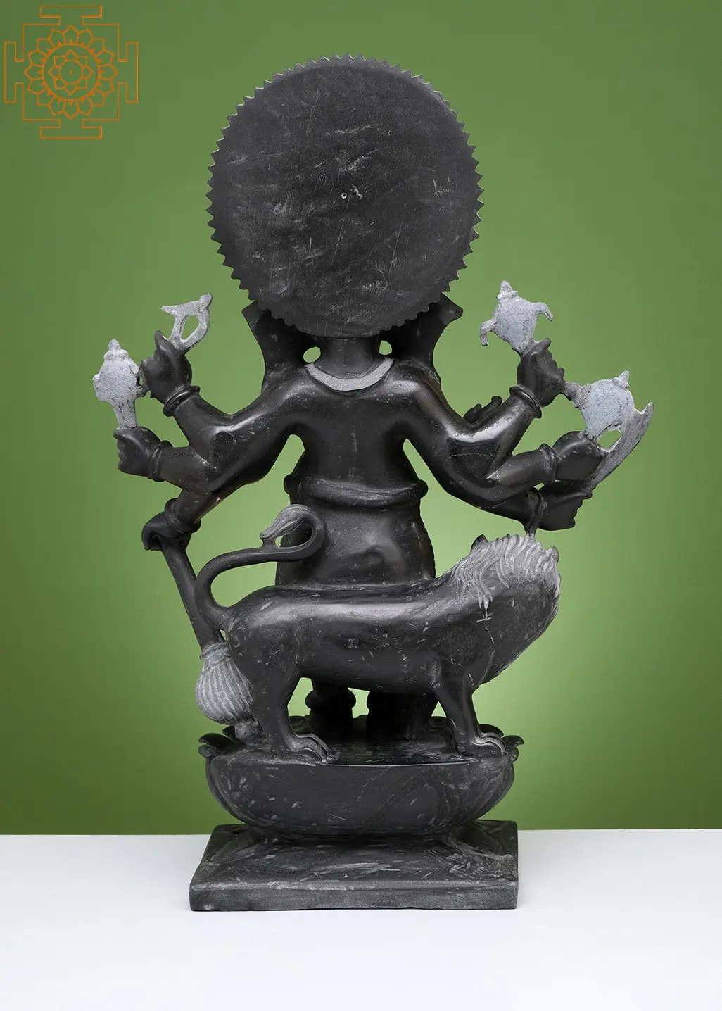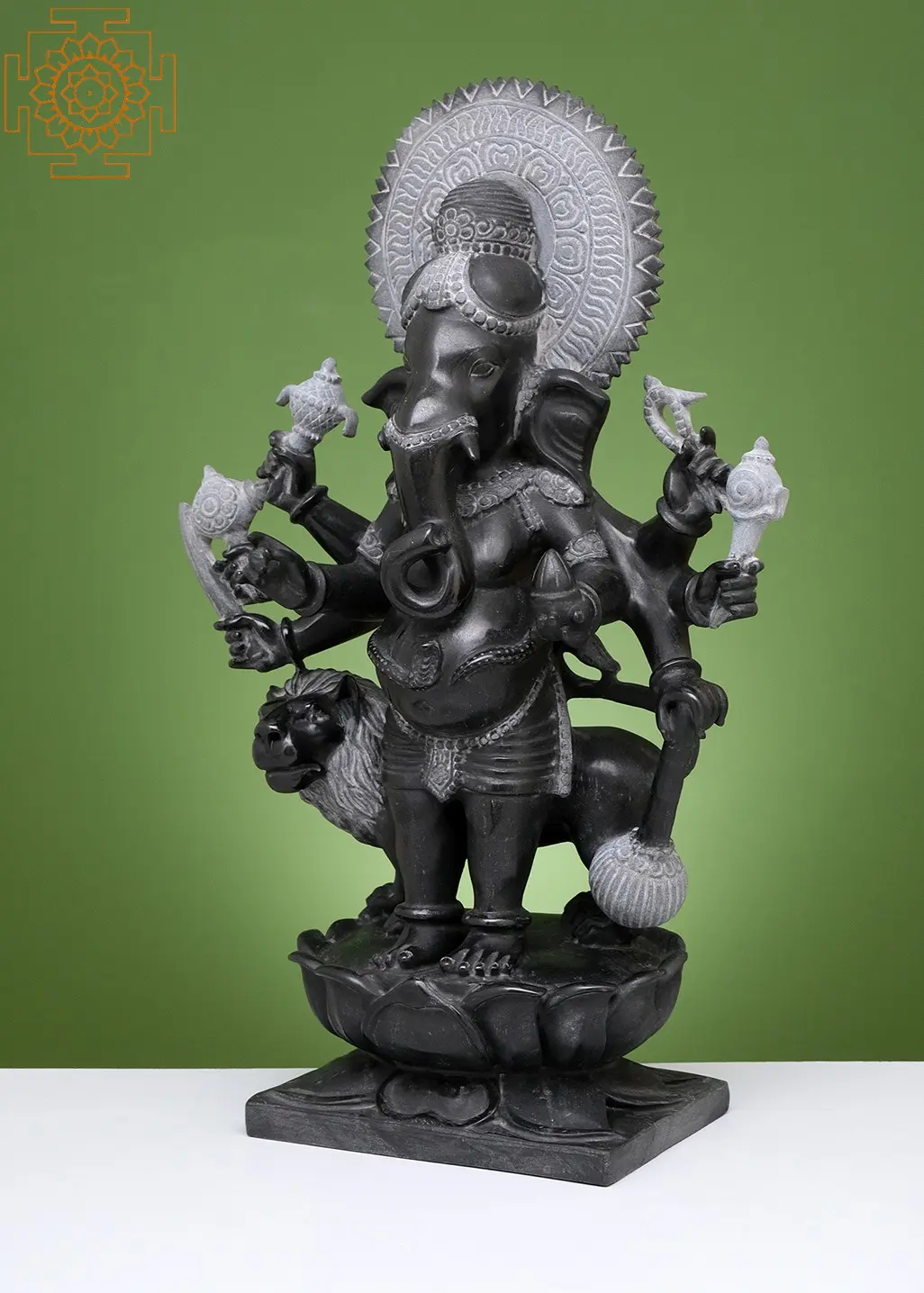 This magnificent black marble statue captures the divine essence of Lord Ganesha, the revered remover of obstacles and the god of wisdom, intellect, and auspicious beginnings. Standing tall and resplendent, this eighteen-inch tall Ganesha is an awe-inspiring representation of the elephant-headed deity, rendered with exquisite detail and profound symbolism. The deep, rich hue of the black marble lends an air of solemnity and gravitas, while the intricate carvings bring the divine form to life. The depiction of Ganesha with eight arms is particularly significant. Each arm symbolizes a different aspect of his divine power and his capacity to undertake multiple tasks simultaneously, reflecting his role as the overseer of the cosmos and the remover of all impediments. In his hands, he carries various divine accoutrements. The conch shell, for instance, signifies the primordial sound, while the discus represents the power to destroy evil and uphold righteousness. The noose symbolizes his ability to bind the wrongdoer and the goad signifies the power to spur one towards righteous action and enlightenment. These symbolic weapons and tools underscore Ganesha's multifaceted nature as both a benevolent protector and a formidable force against negativity.
