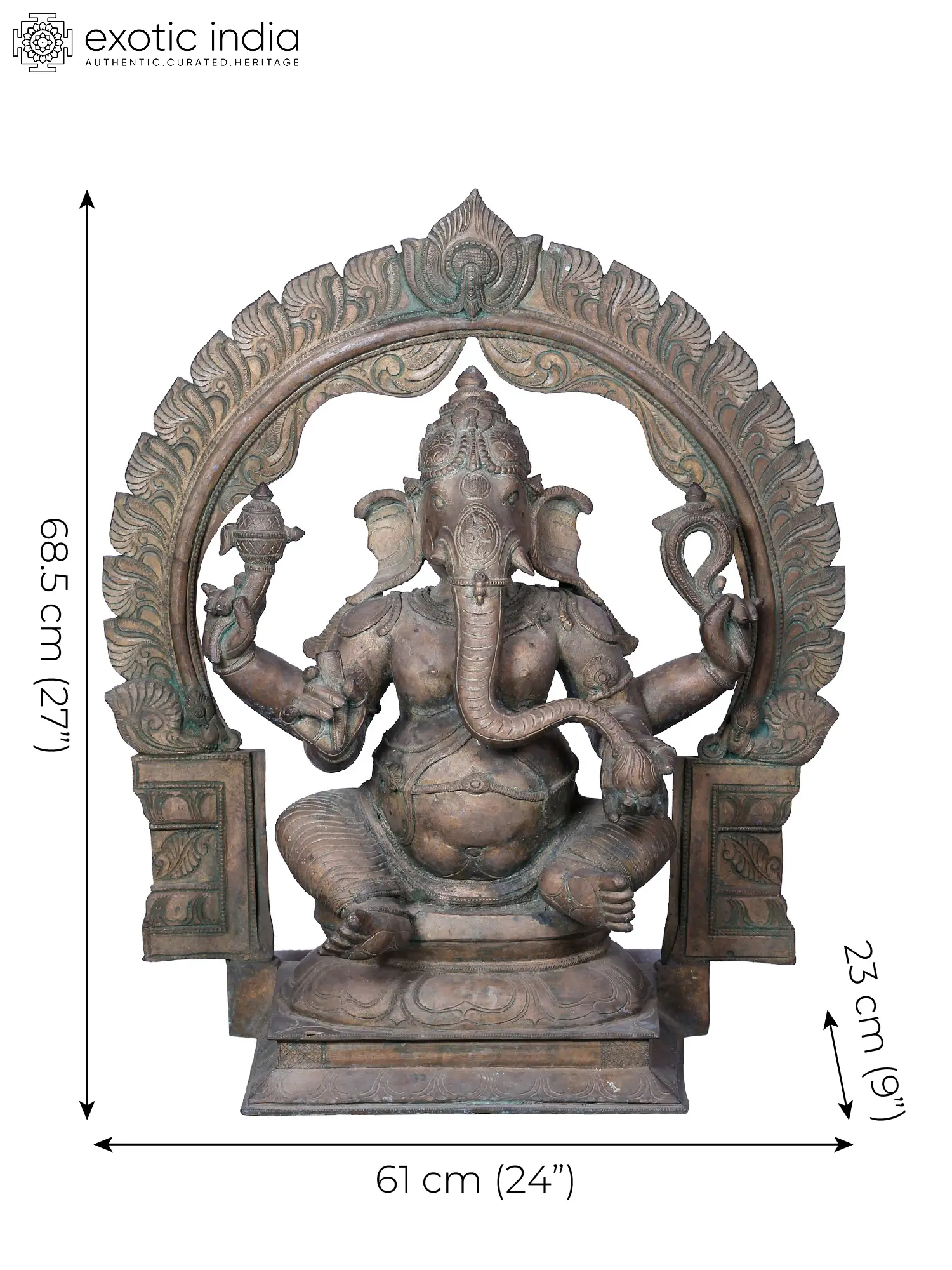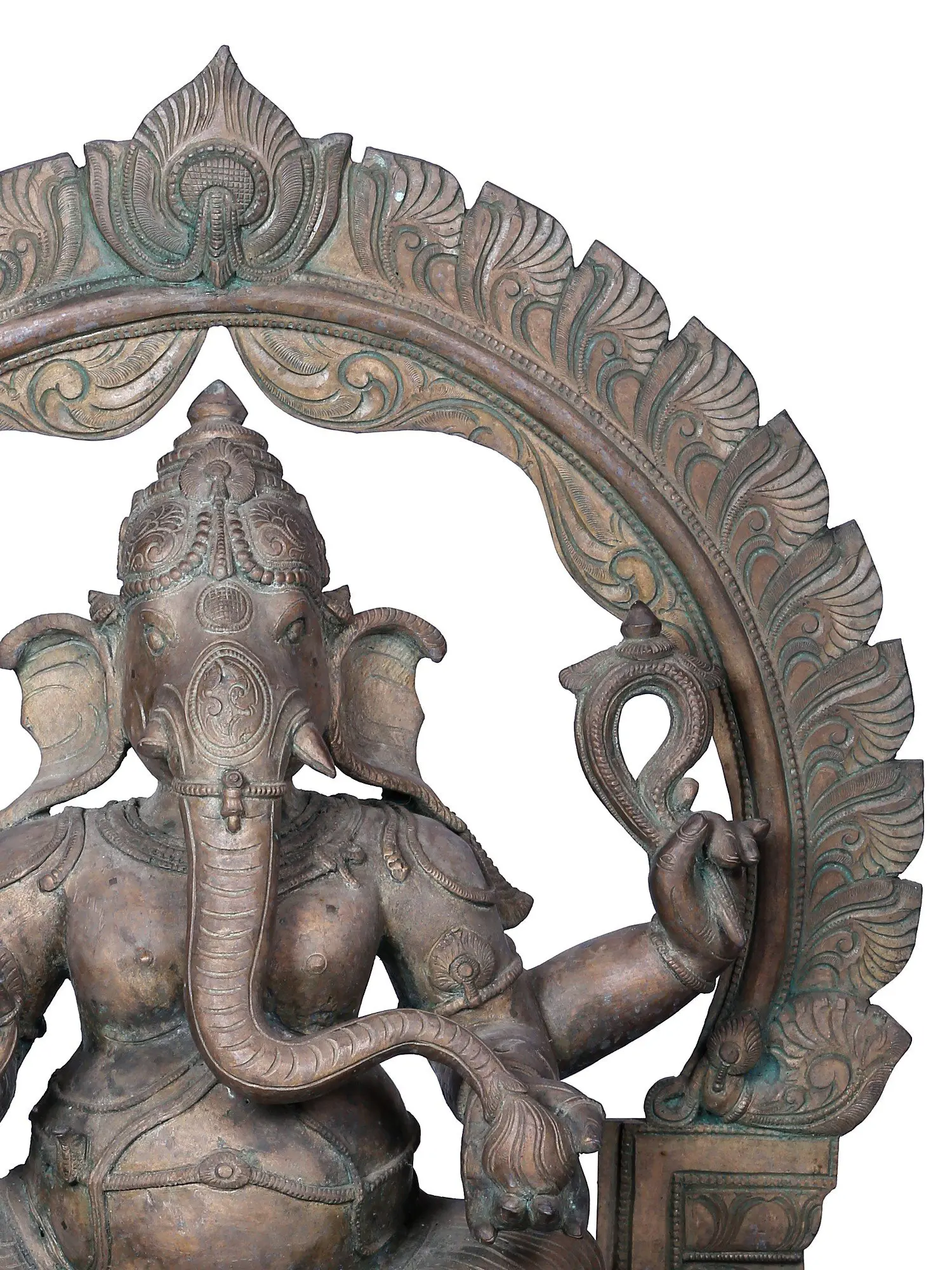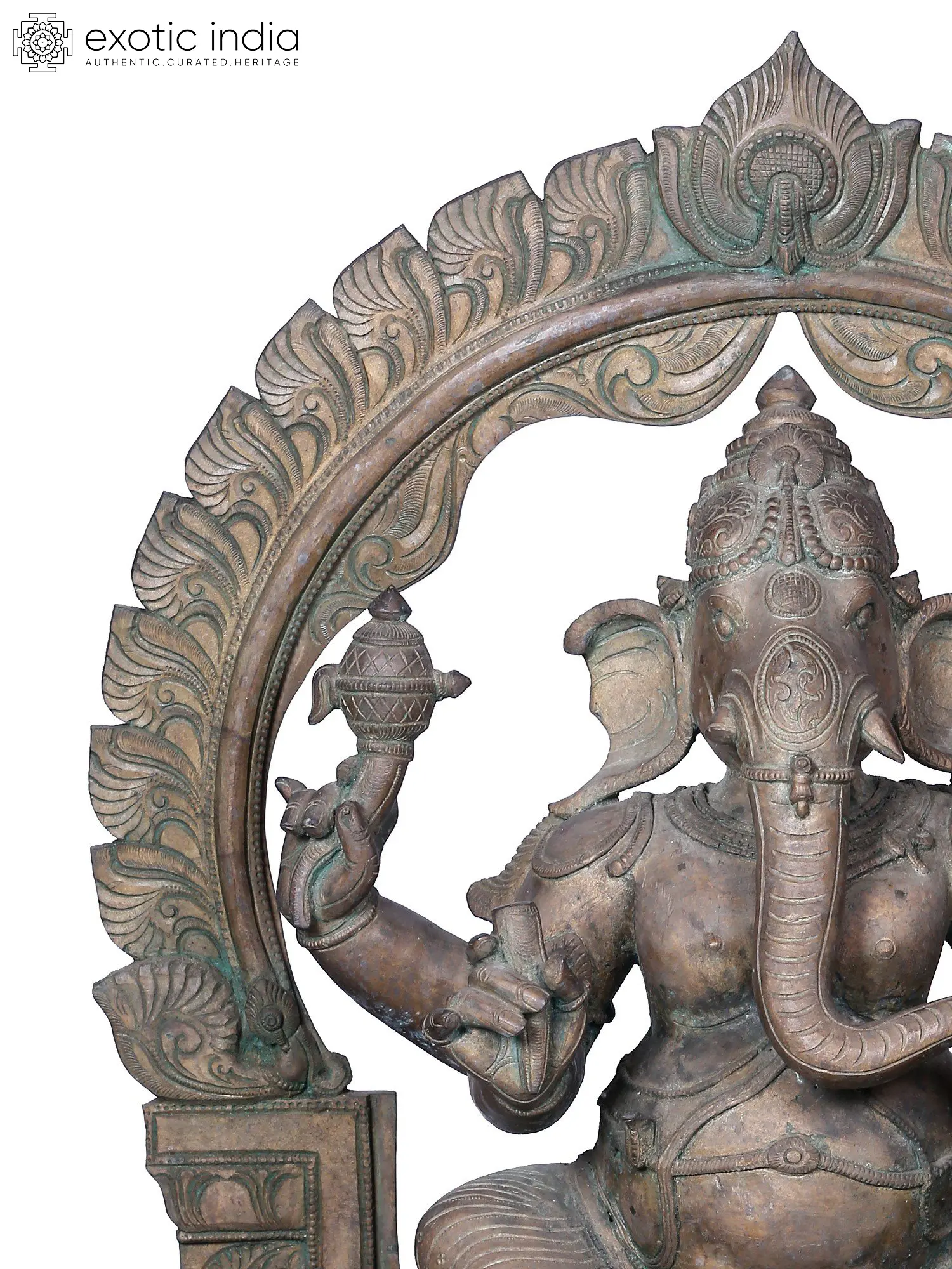 His broken tusk, an elephant goad, a noose, and his favorite treat, the delicious Modak (dumpling), are all in his four hands. He sits on a lotus pedestal under a Prabhavali, which signifies his status as a patron of light. Believers think the Lord would use the noose to bring them near to him and use it as a goad to help them advance in life. The lost-wax technique details the divine posture, inviting you to appreciate the cosmic significance of Ganesha's authoritative presence.