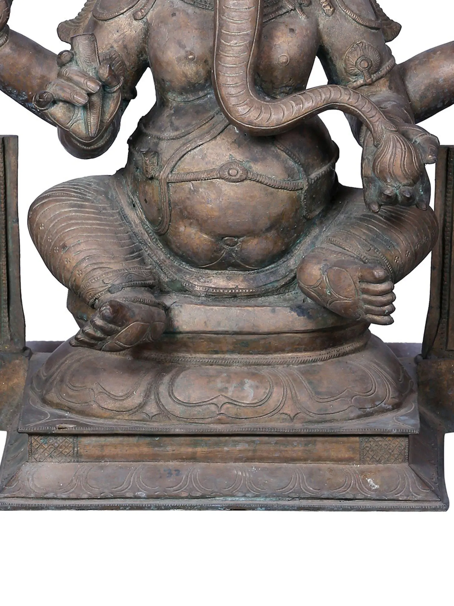 Invoke divine blessings with our Lord Chaturbhujadhari Ganesha, a manifestation of the Haridra Ganapati, Seated on Throne sculpture, a unique creation through Madhuchista Vidhanam in Swamimalai's Panchaloha Bronze. This artwork beautifully captures Ganesha uniquely, seated on a throne. Beyond its artistic finesse, the sculpture embodies the Hindu philosophical concept of 'Divine Authority,' symbolizing Ganesha's role as the lord of wisdom and guidance.