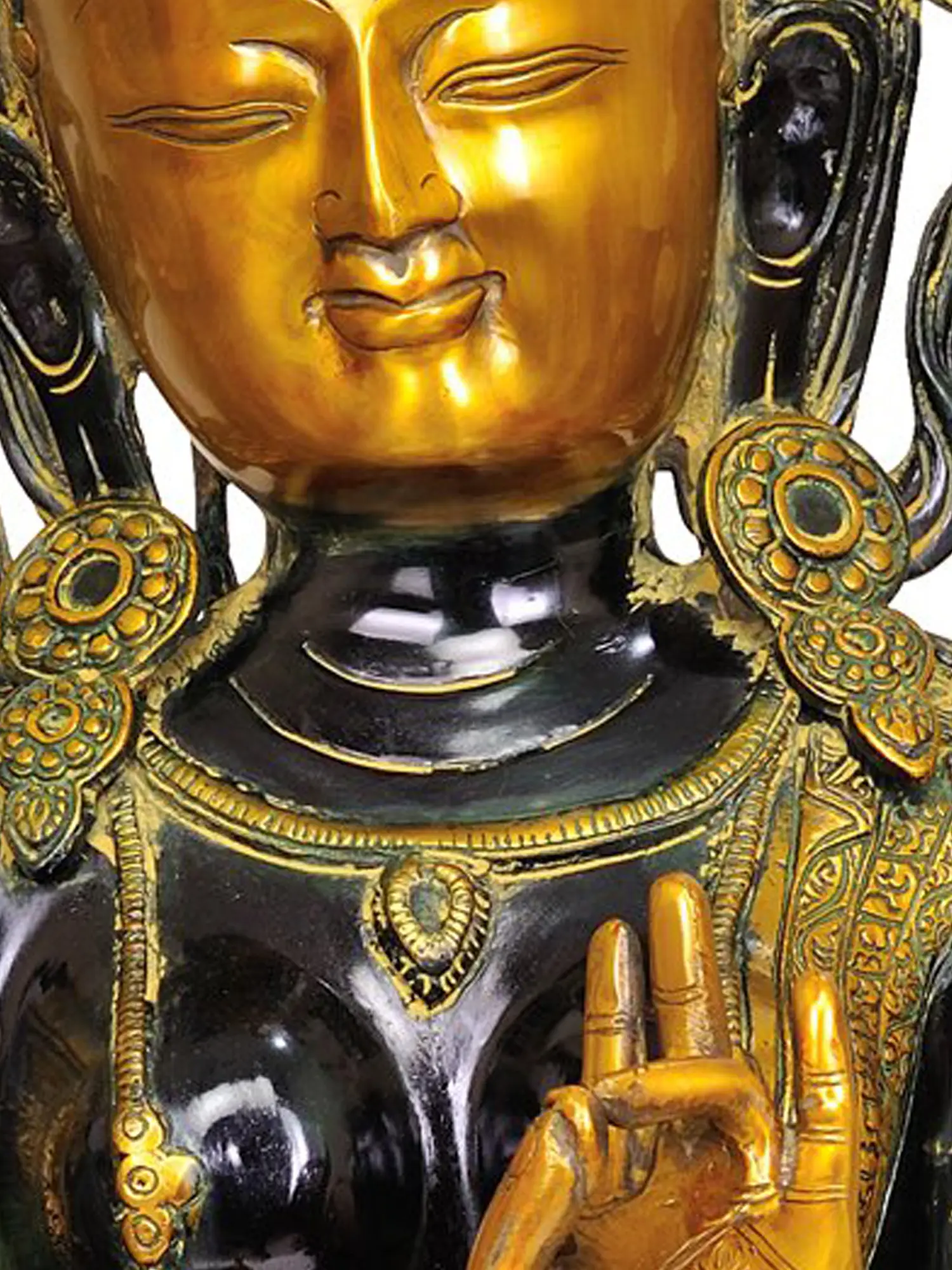 This exquisite large-sized statue depicts Green Tara, a revered female bodhisattva in Tibetan Buddhism, symbolizing compassion, wisdom, and action. Her serene countenance radiates a sense of peace and gentle power, inviting contemplation and spiritual connection. The statue is masterfully crafted from brass, showcasing the meticulous artistry and dedication inherent in traditional Indian metalwork. The striking contrast between the rich, lustrous gold finish of her face, arms, and legs, and the deep, almost iridescent black patina of her robes, adds a profound depth and visual appeal.