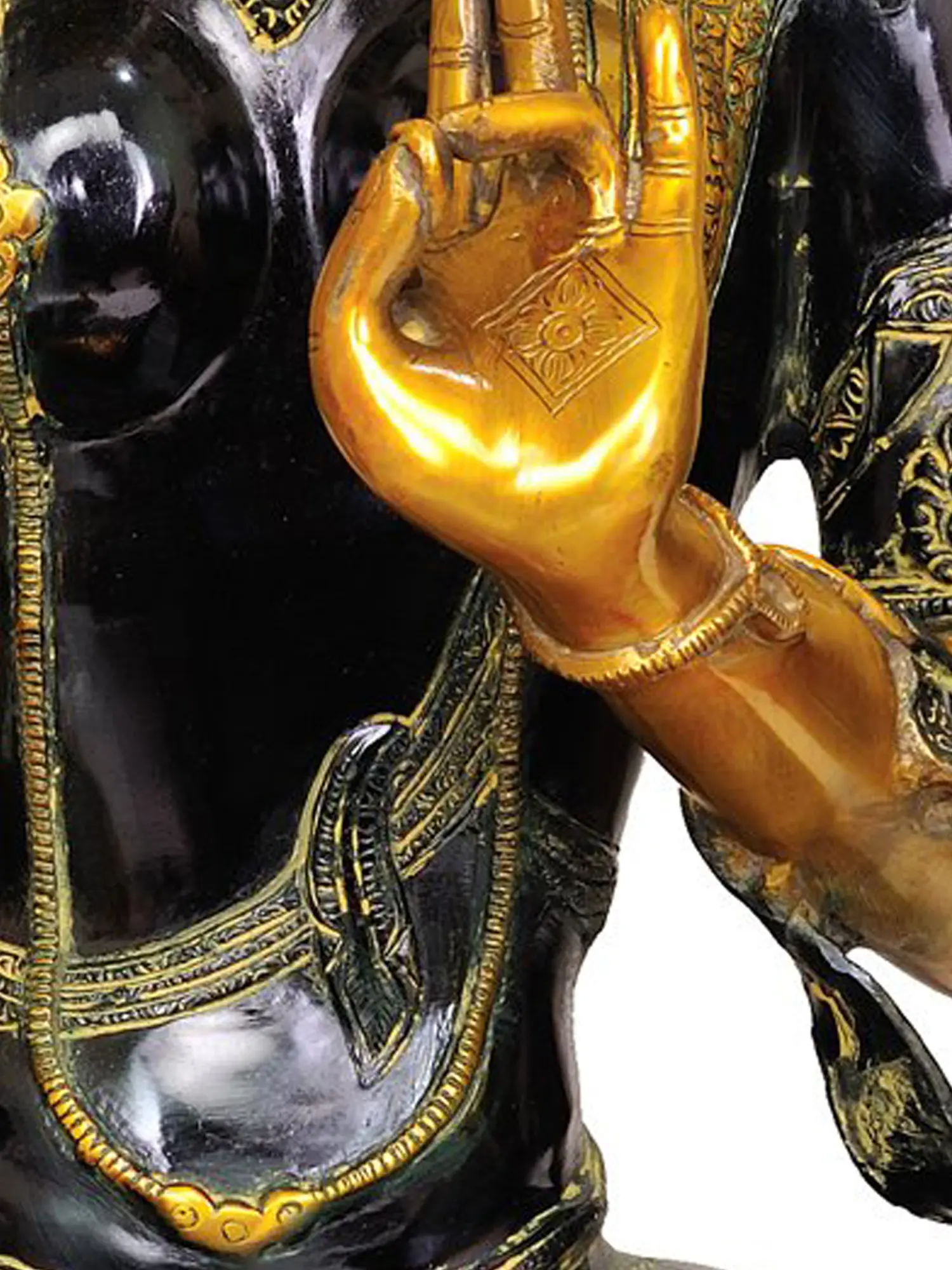 Handmade in India, this statue is a testament to the enduring legacy of skilled artisans who have passed down their techniques through generations. The use of brass allows for the fine detailing and the creation of a durable and timeless piece. The patina achieved through traditional methods not only enhances the visual aesthetics but also imbues the sculpture with an antique charm, suggesting a deep connection to the sacred traditions it represents. The scale of the statue makes it a commanding presence, suitable for dedication in a temple, meditation space, or as a significant piece of art for the discerning collector. Its substantial size and intricate detailing are sure to captivate and inspire all who behold it.