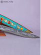 The craftsmanship of this particular Khukuri is truly exceptional. The 27-inch blade is forged from high-quality iron, its surface reflecting a sheen that speaks of strength and resilience. The handle, carved from rich wood, is adorned with stunning inlay work of stone and leather. The vibrant turquoise, coral, and other semi-precious stones, meticulously arranged in intricate patterns, bring to life mythical creatures and spiritual symbols. These decorative elements are not mere embellishments; they represent the deep spiritual beliefs and cultural values of the Nepalese people. Notice the meticulously hand-etched details, the intricate carvings, and the precise balance, crafted to meet the exacting demands of both practicality and aesthetic excellence. Each Khukuri is a unique piece, reflecting the skill and dedication of the artisan who created it.