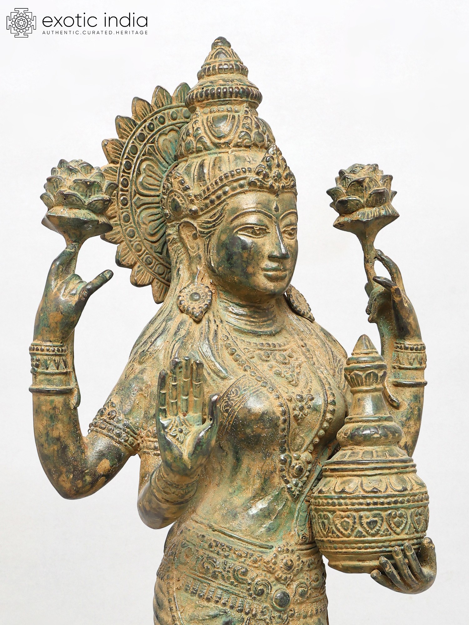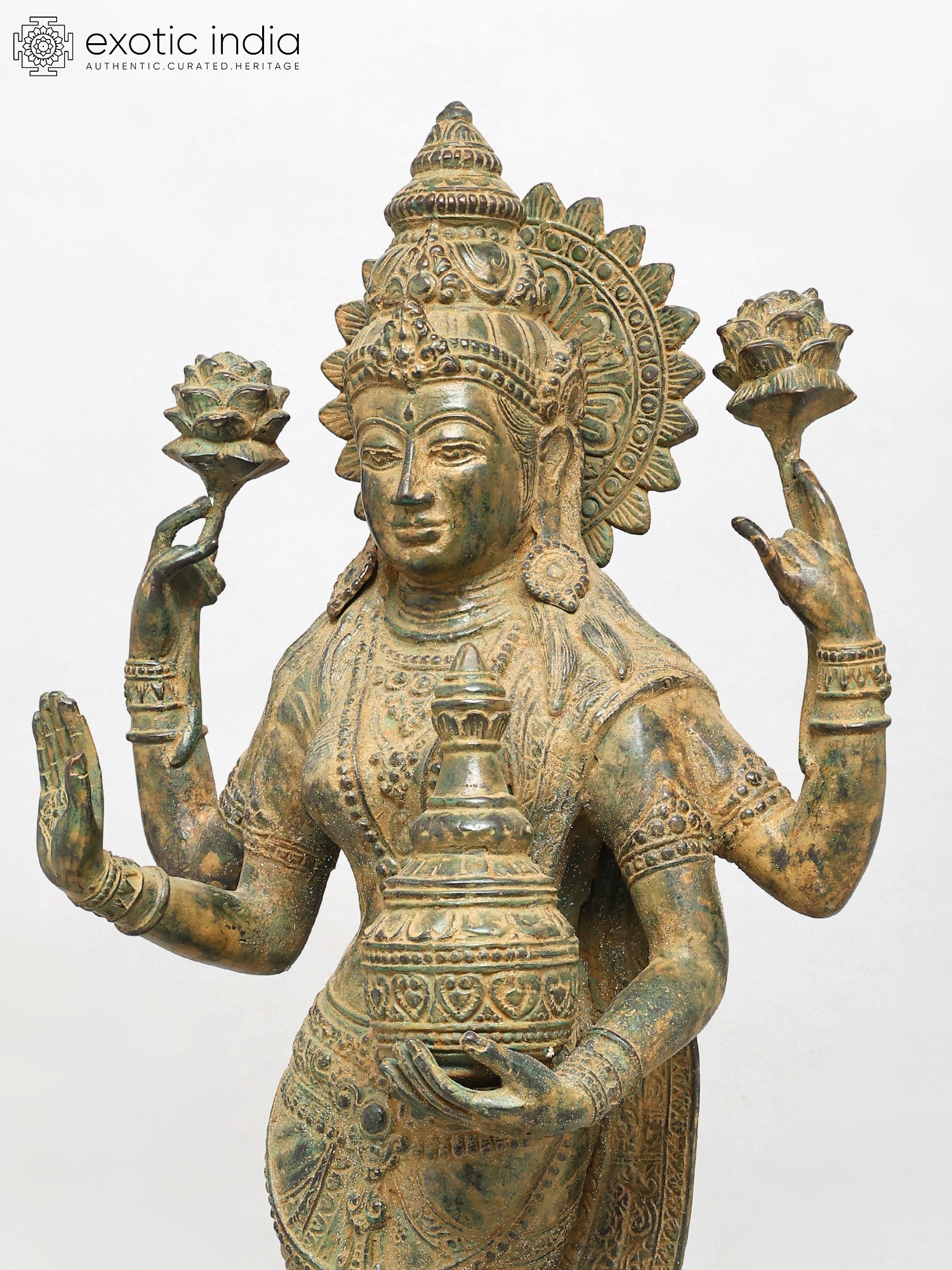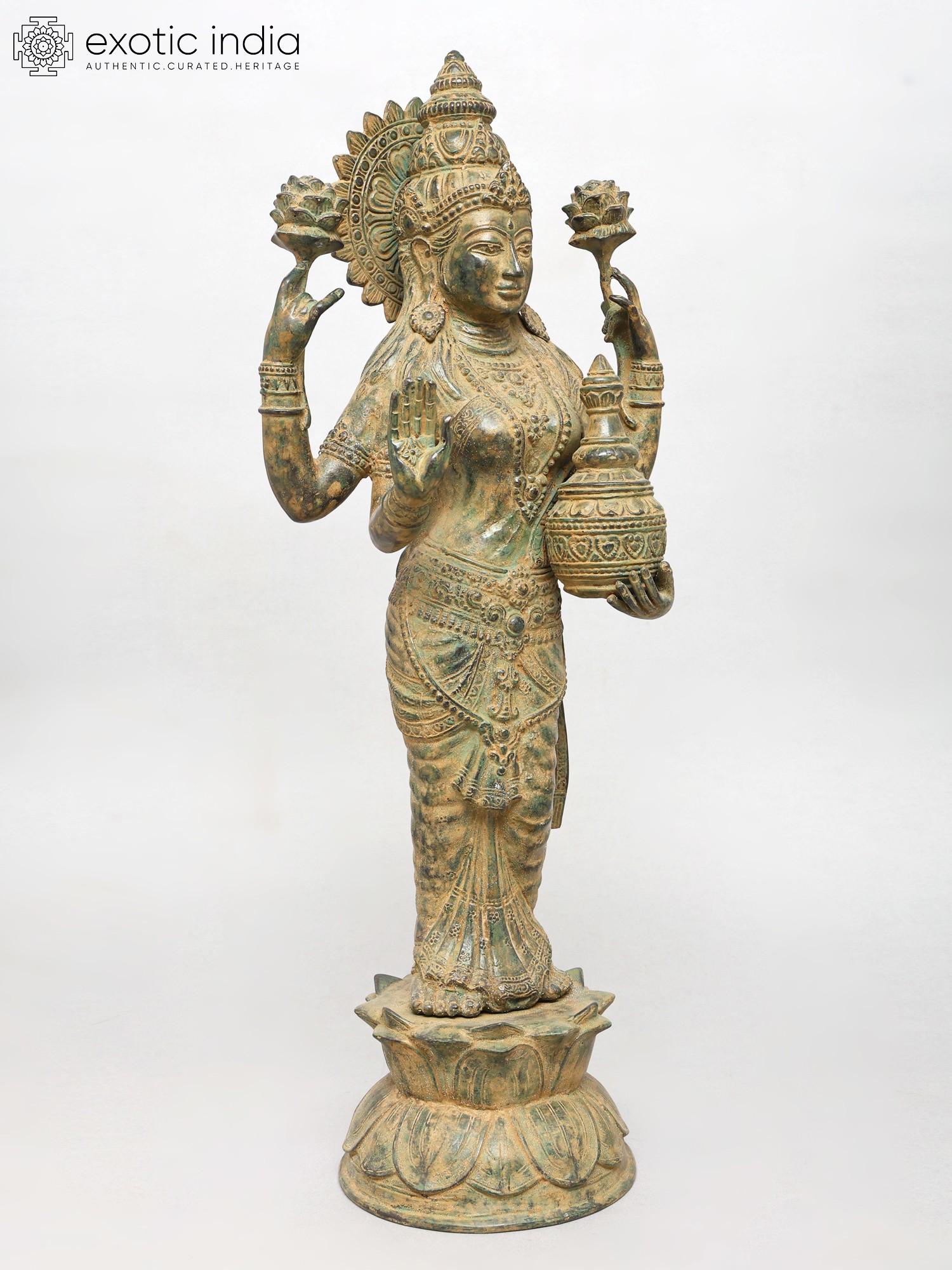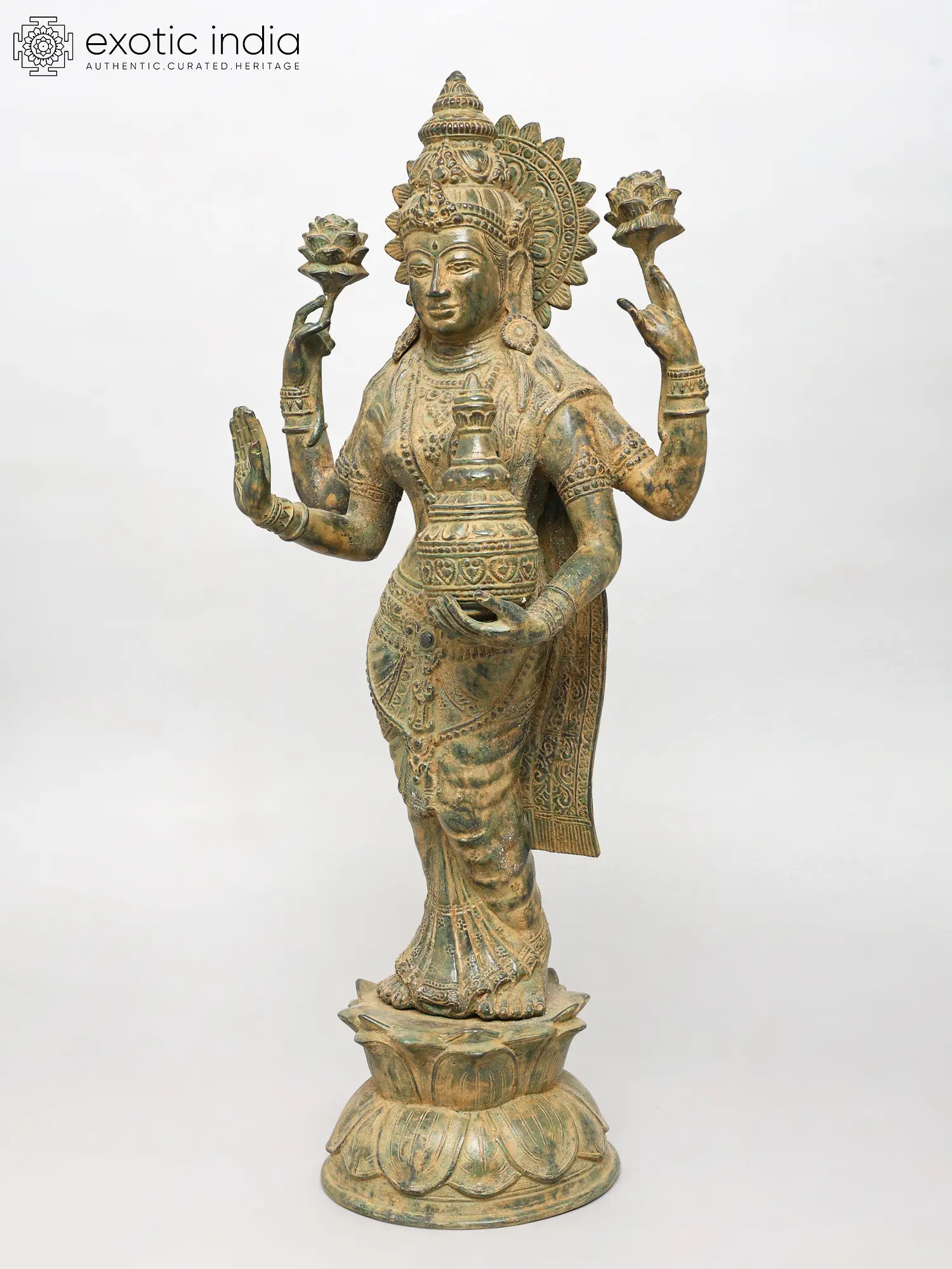 Standing at an impressive height, this sculpture captivates with its four-armed form, each element imbued with profound meaning. The outstretched hands, one in a gesture of blessing, the other holding a delicate lotus, symbolize purity and spiritual awakening. The pot held in another hand signifies the overflowing bounty of wealth and prosperity, while the serene gaze invites contemplation and peace. The intricate ornamentation adorning the deity, from the headdress to the bangles, showcases an exceptional level of craftsmanship, with a rich, antiqued finish that enhances its regal aura.