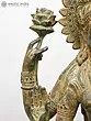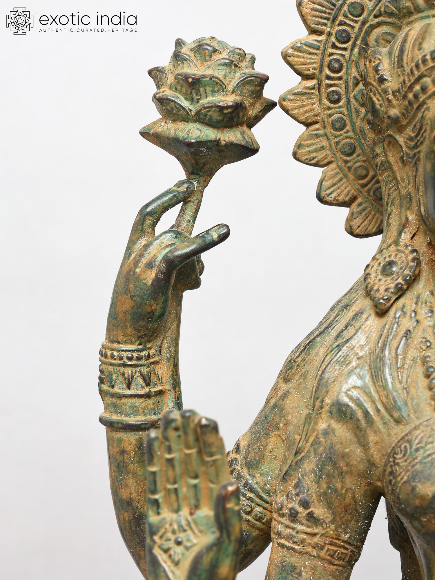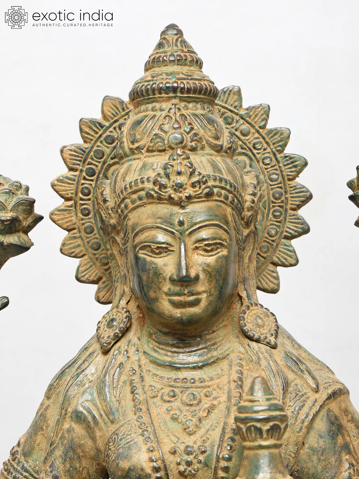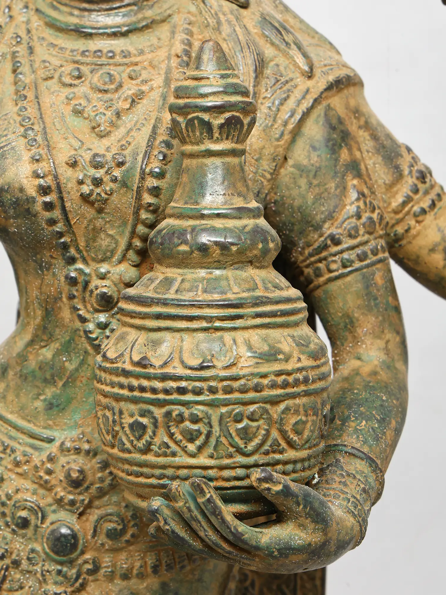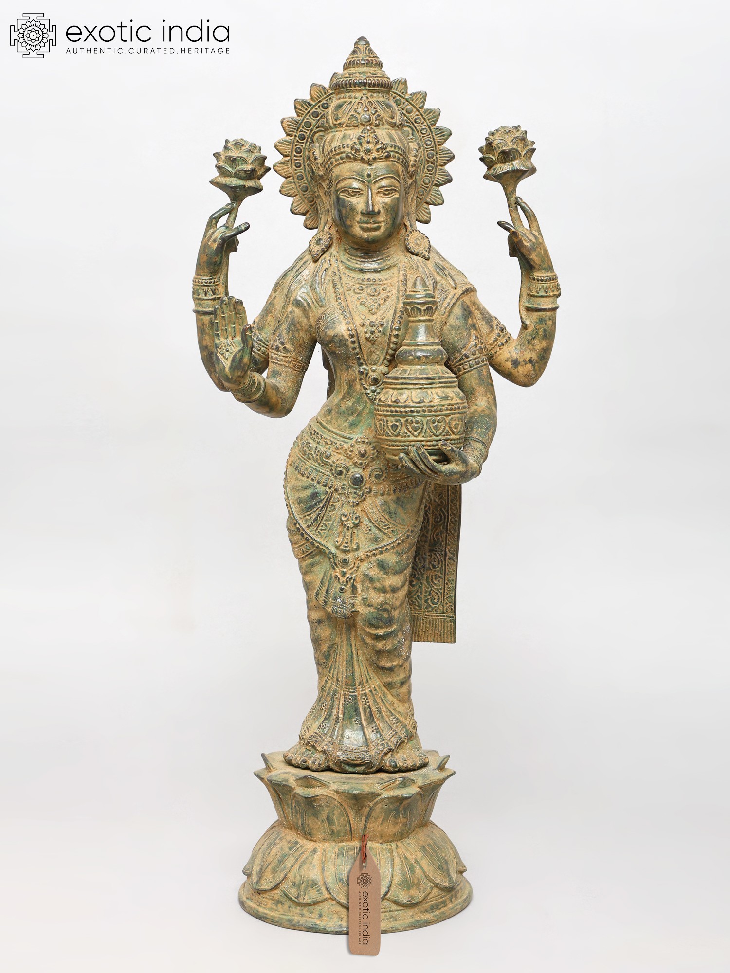 Standing at an impressive height, this sculpture captivates with its four-armed form, each element imbued with profound meaning. The outstretched hands, one in a gesture of blessing, the other holding a delicate lotus, symbolize purity and spiritual awakening. The pot held in another hand signifies the overflowing bounty of wealth and prosperity, while the serene gaze invites contemplation and peace. The intricate ornamentation adorning the deity, from the headdress to the bangles, showcases an exceptional level of craftsmanship, with a rich, antiqued finish that enhances its regal aura.