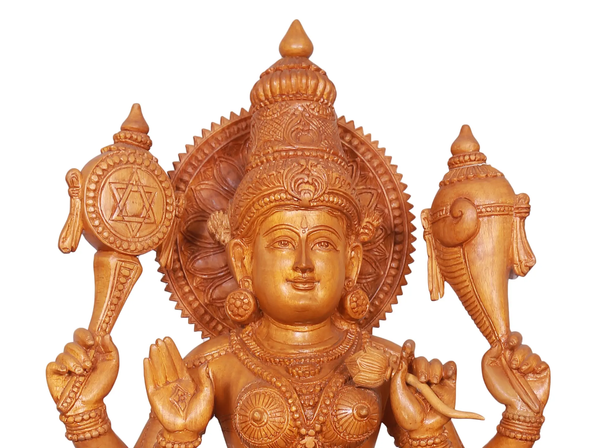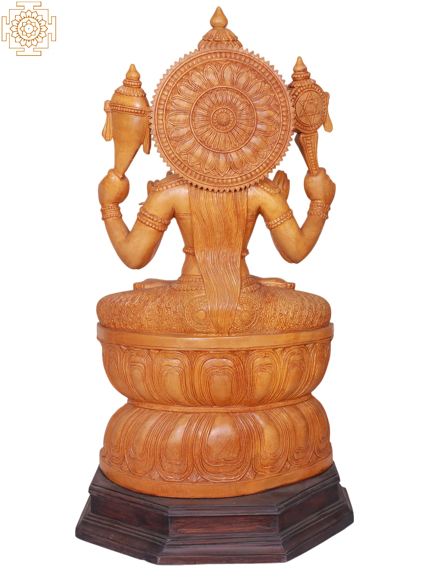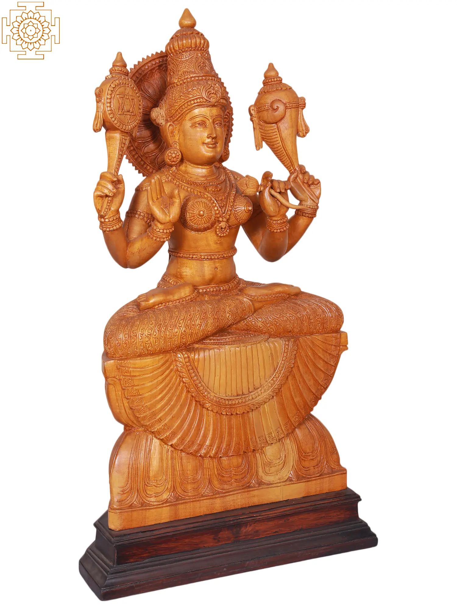 "Vishnupriya"- the beloved of Sri Vishnu, Devi Lakshmi appears in her most exquisite chaturbhuja roopa in this teakwood statue, with a gentle aura and enlivened countenance. The wood statue has been carved in a rounded manner, with fine motifs and details added to the icon using measured incised lines and cuts. A Kiritamukuta, bejeweled ornaments, and Vishnu's attributes- Shankha and Chakra form a part of this Lakshmi statue, instilling in it a heavenliness beyond words.