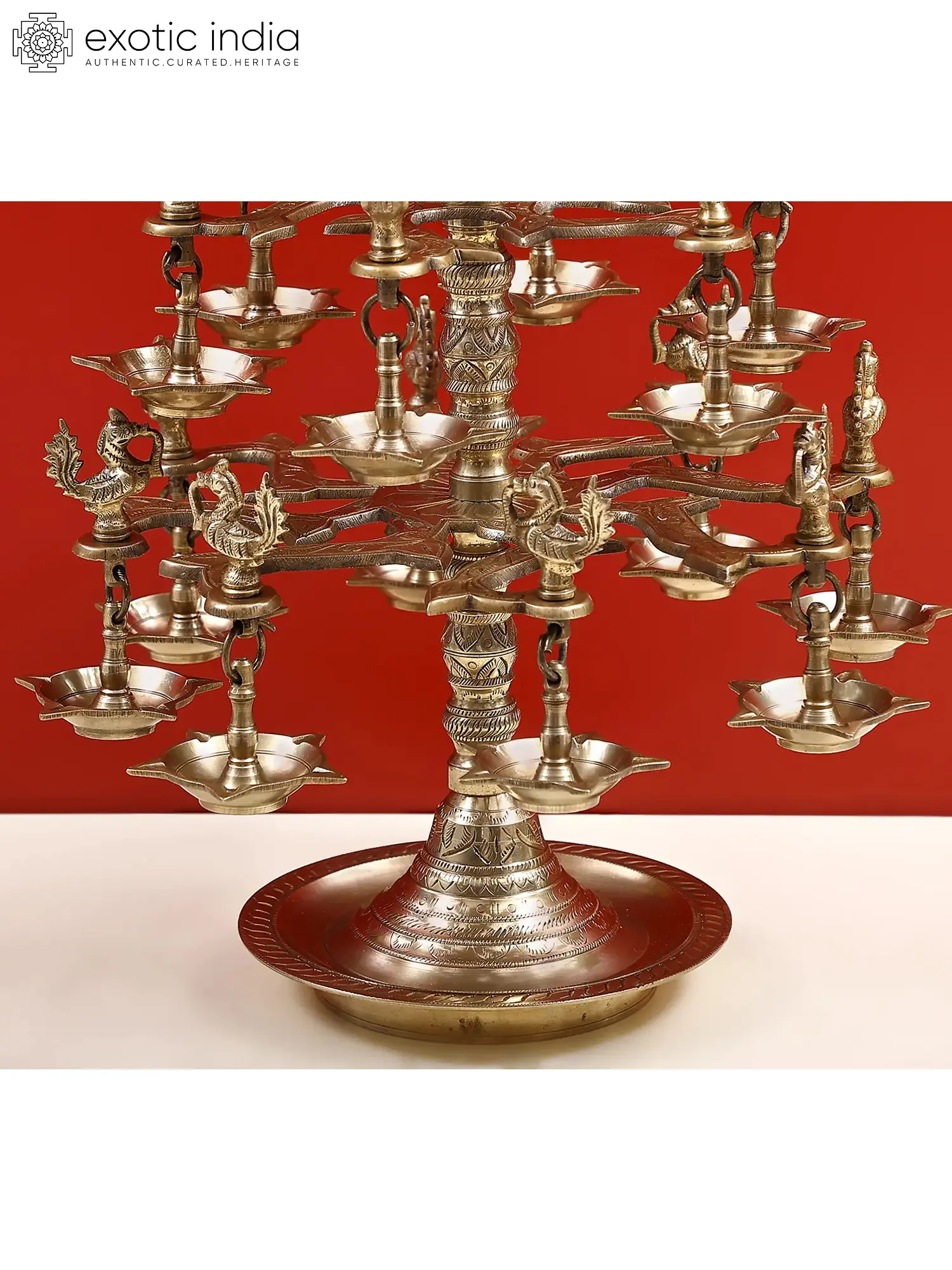 Crafted from premium brass, this multi-wick lamp possesses a timeless allure. The metal, polished to a lustrous sheen, catches and reflects the light, enhancing its radiant glow. The lamp's structure is a marvel of engineering and aesthetics, with each tier carefully balanced and adorned. The cascading nature of the wicks, descending in a graceful, tiered arrangement, creates a visual rhythm that draws the eye upwards and outwards, as if the lamp itself is reaching towards the heavens. This piece is more than just a source of light; it is a functional sculpture, an heirloom in the making, designed to be a focal point of devotion and admiration in any sacred space or grand living area. Its substantial presence, measuring 28 inches in height, ensures it commands attention, while its intricate details invite closer inspection and appreciation.