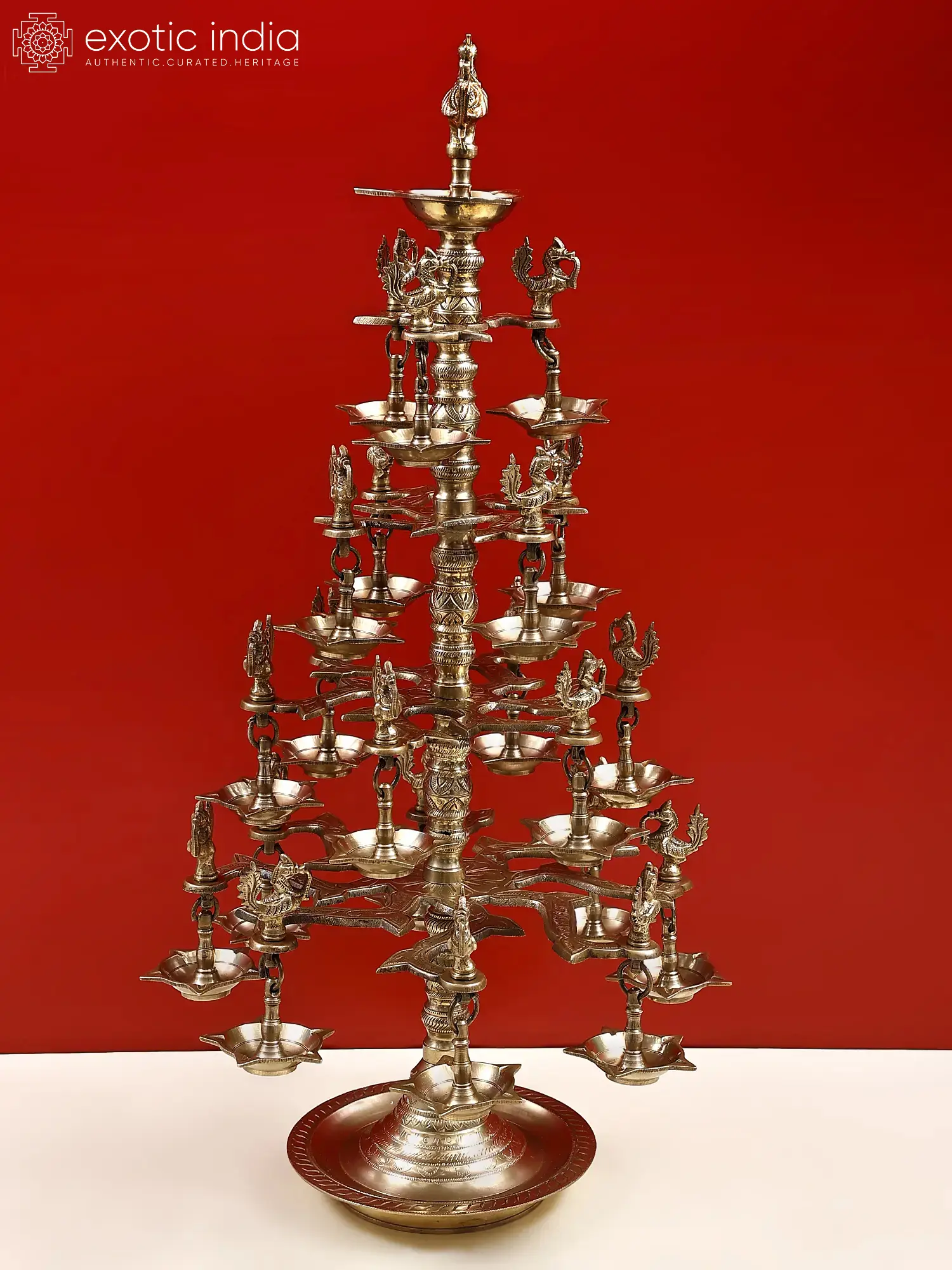 The Peacock Multilayer Lamp is identified as an Ashtothira Deepam and is made of brass. The Ashtothira is represented by 108 lights arranged in layers by hanging geometric forms. It pays homage to the divine number 108, which is connected to the 108 Mukhya Shivaganas and the 108 edges of Lord Vishnu's sacred discus. This lamp has deep origins in the nation's lighting traditions and has long been used to decorate Hindu temples for special occasions. As they may shine in all directions, the Panchadeepam that dangle from each tier is essential.  This high-quality lamp will surely provide your home a massive look among all other decors because of its excellent construction.
