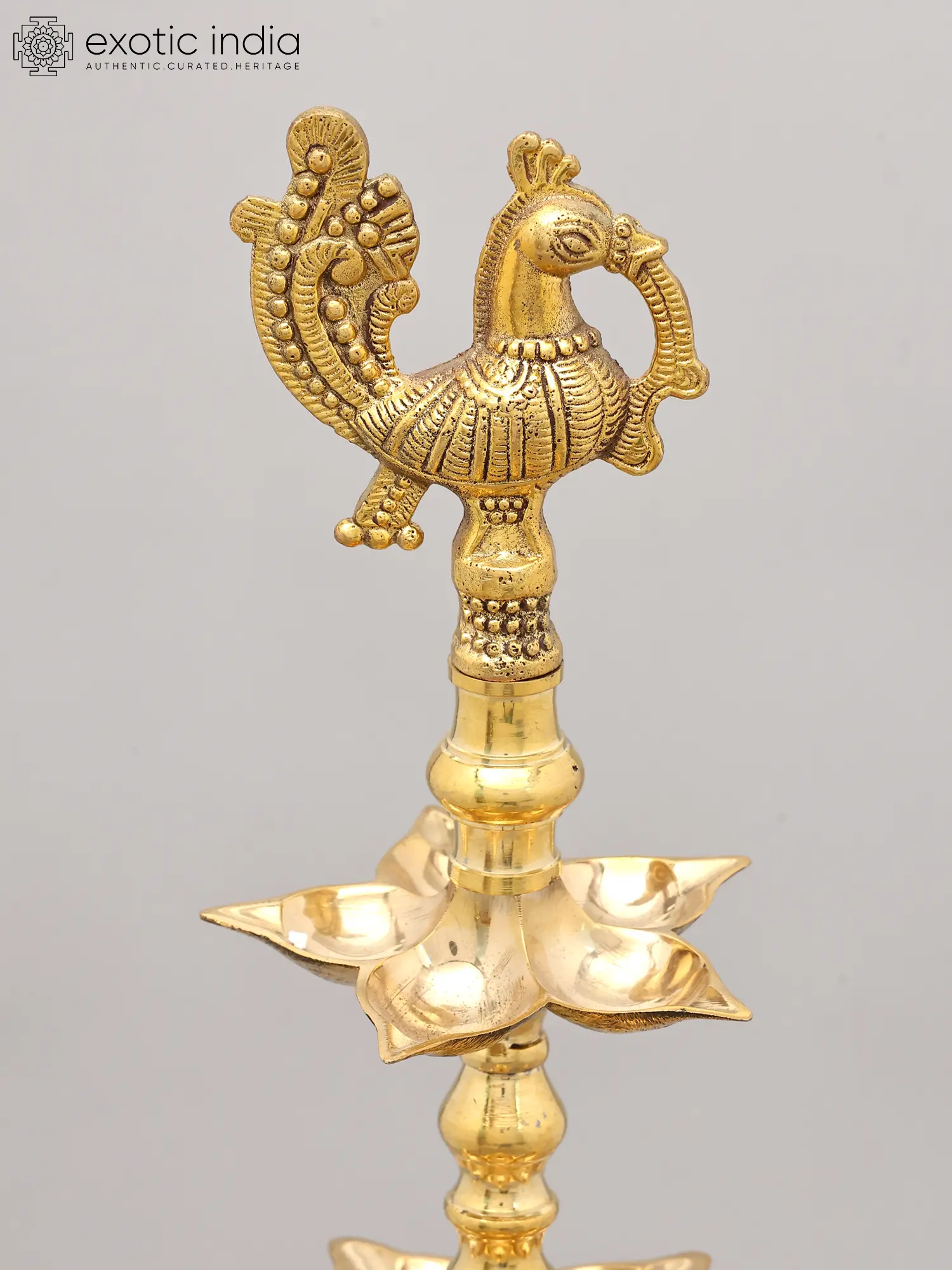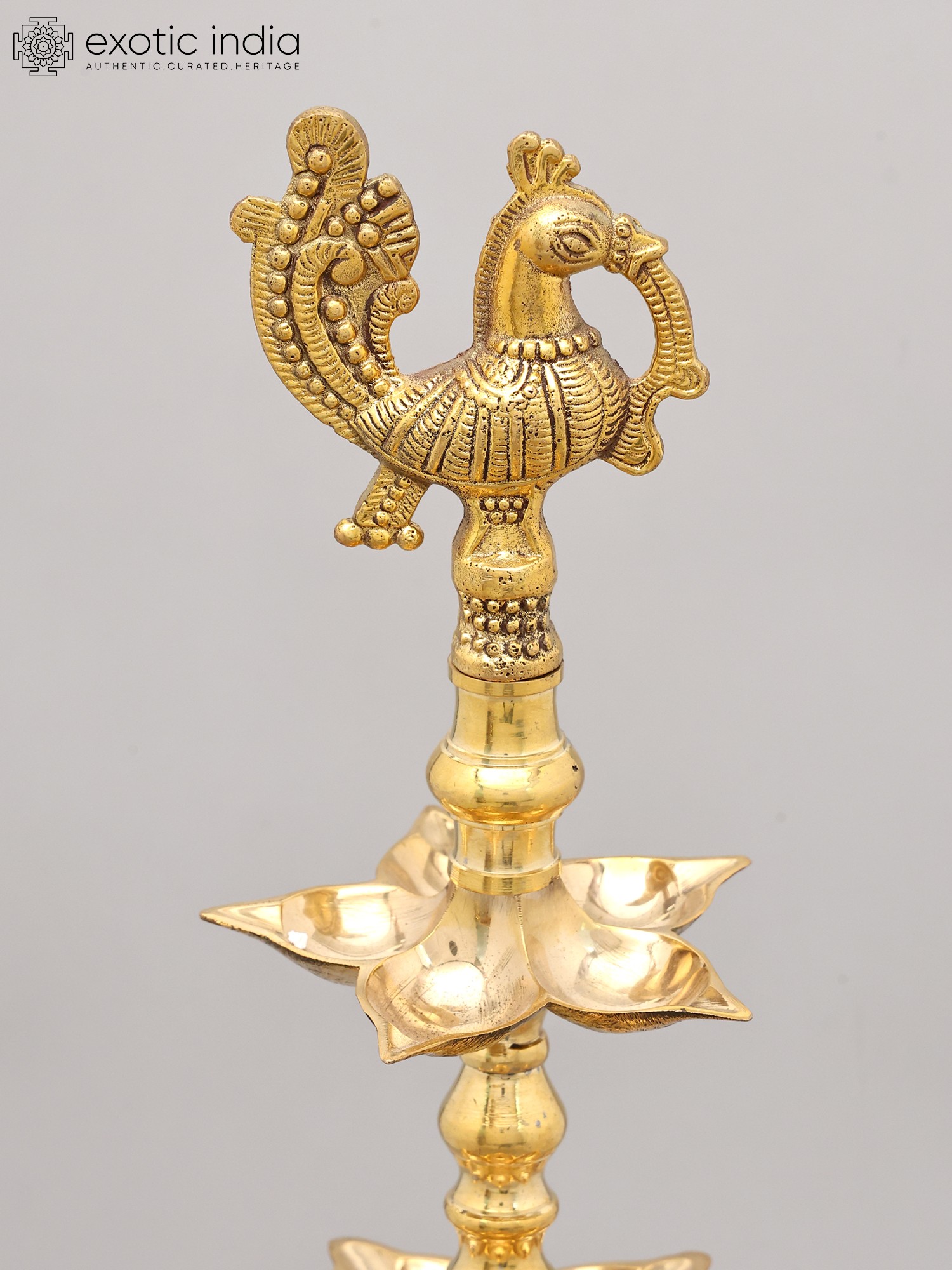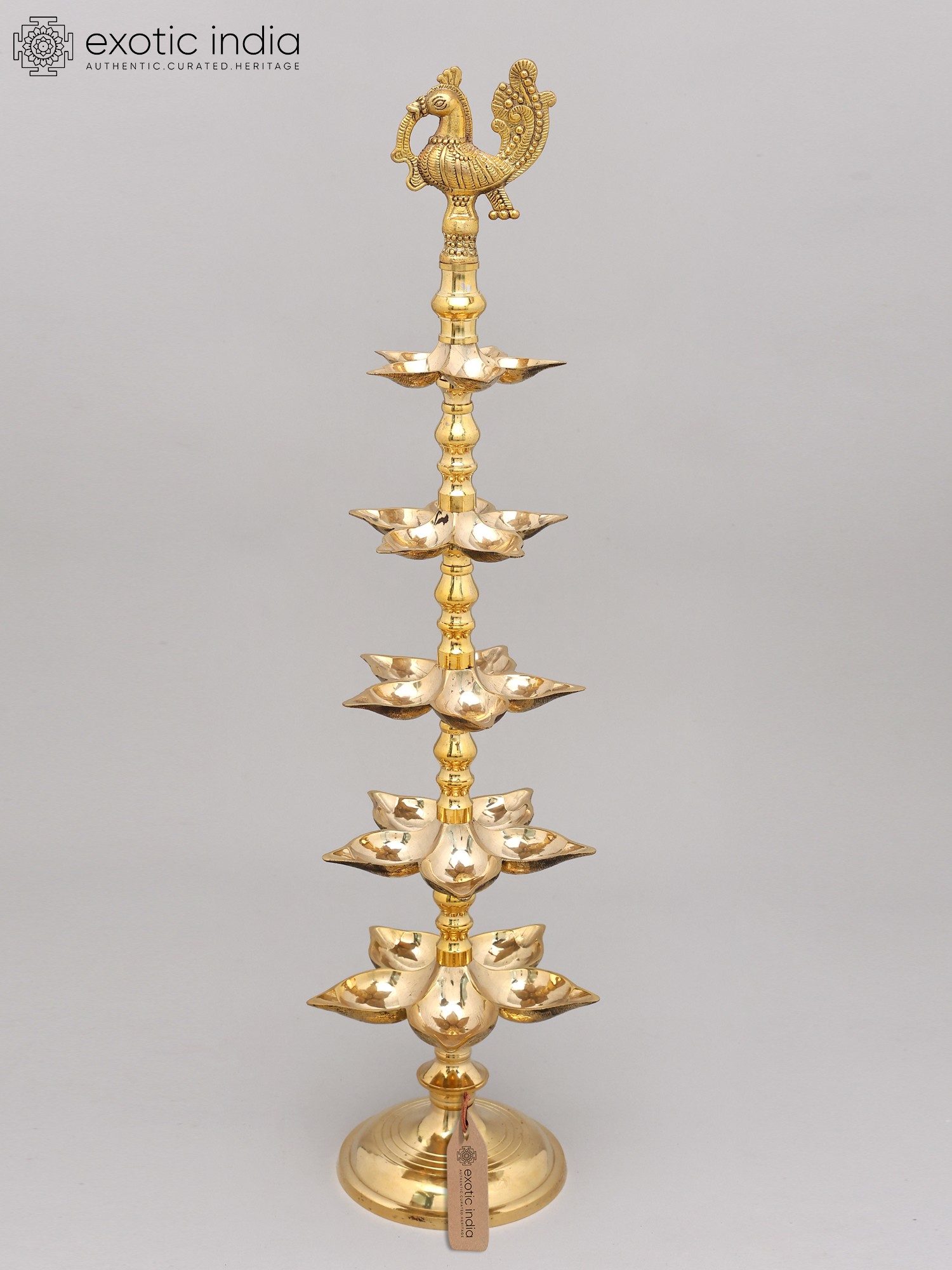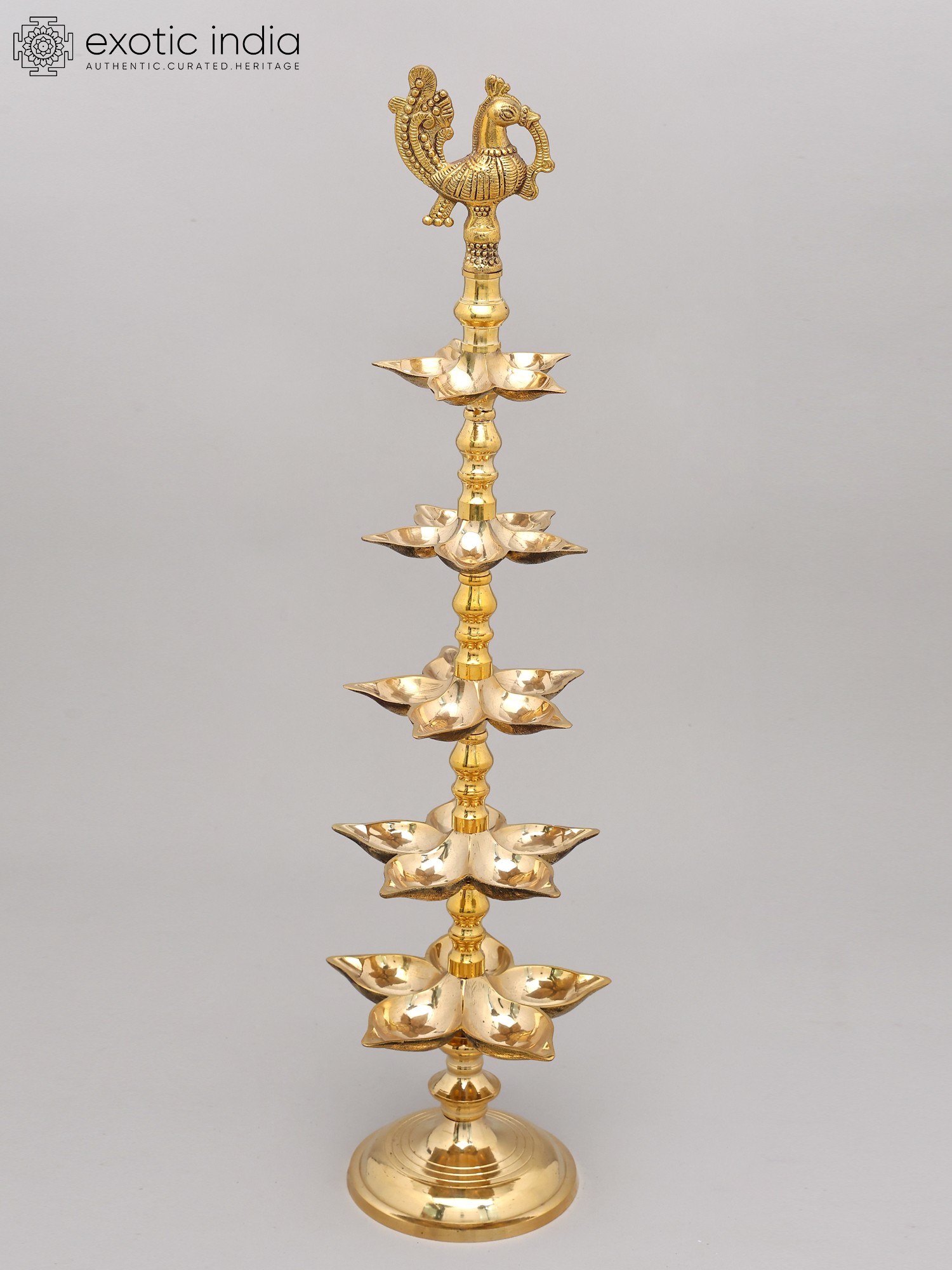 This magnificent lamp is more than just a source of light; it is a testament to the rich tapestry of Indian craftsmanship and a conduit for divine blessings. Crafted from lustrous brass, its imposing height of twenty-eight inches and intricate design evoke a sense of grandeur and spiritual significance. The lamp culminates in a strikingly detailed peacock, a bird revered across Indian mythology for its beauty, celestial connections, and its role as the mount of the god of war, Kartikeya. In Hindu tradition, the peacock symbolizes grace, immortality, and auspiciousness, and its presence atop this lamp imbues it with a powerful aura of divine protection and prosperity.