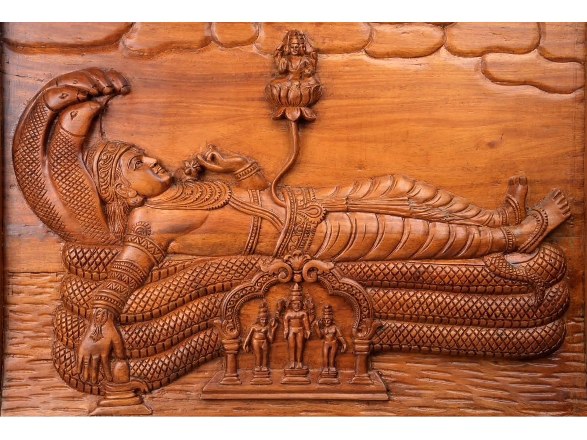 From Vishnu's navel emerges a lotus, a powerful symbol of purity, creation, and spiritual awakening. Upon this lotus is seated Lord Brahma, the creator deity, meticulously carved with his four heads, representing the four Vedas. This detail alludes to the creation of the universe from Vishnu's divine energy, a fundamental tenet in Vaishnavism. At the base of the panel, a smaller, intricately carved shrine is depicted, housing three figures. This often represents the consorts of Vishnu, such as Lakshmi, or other significant deities, signifying the divine presence and blessings that emanate from this sacred tableau. The entire scene is framed by a border of traditional carvings, adding to the panel's regal and sacred aura. The legend of Lord Padmanabha Swami is particularly associated with the magnificent Sree Padmanabhaswamy Temple in Thiruvananthapuram, Kerala, South India. This temple is renowned for its immense wealth and the divine presence of Lord Vishnu in his reclining form. The panel thus serves as a beautiful representation of this revered deity and the spiritual significance attached to his cosmic slumber. The use of teakwood, known for its durability and rich grain, lends a timeless quality to this piece, ensuring it can be a cherished heirloom and a source of spiritual inspiration for generations.
