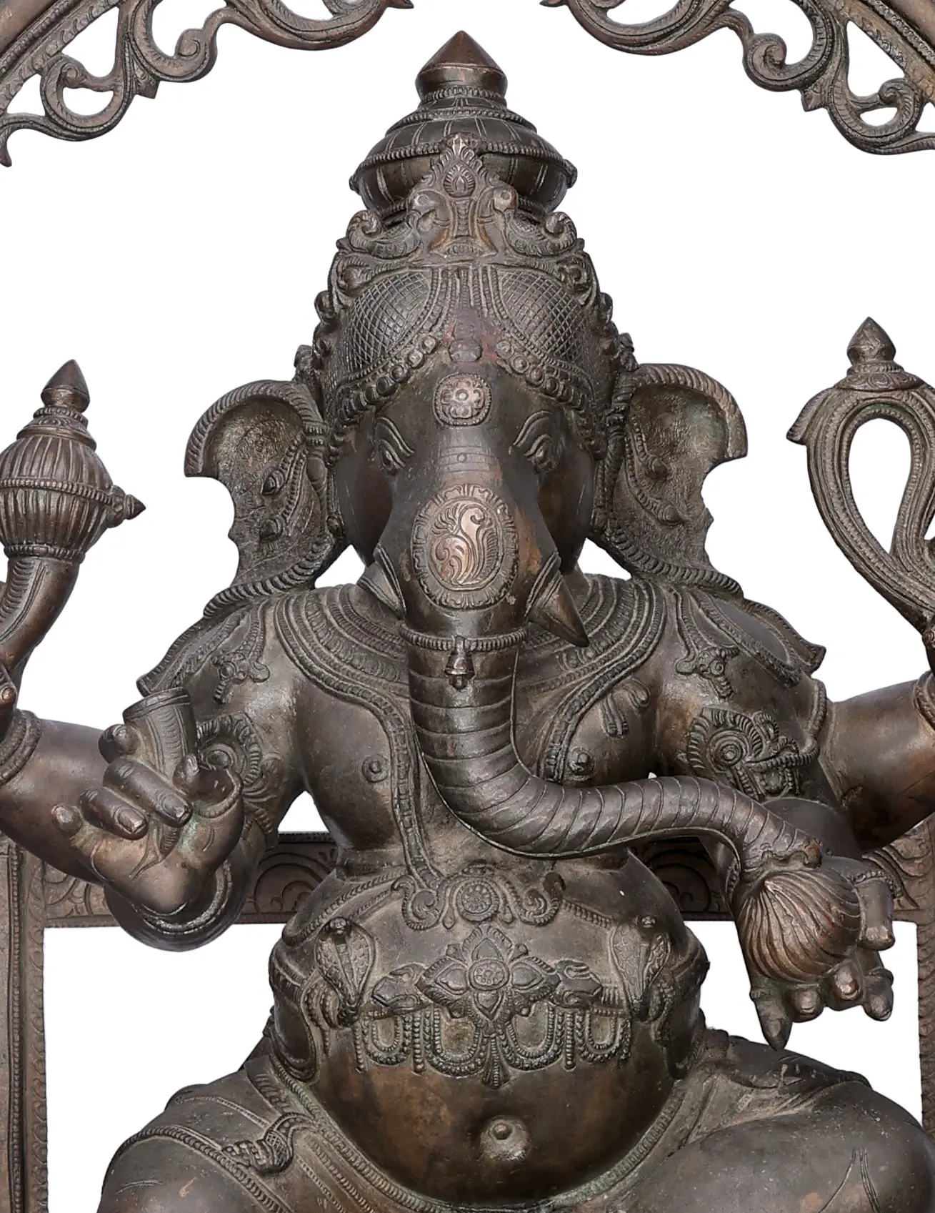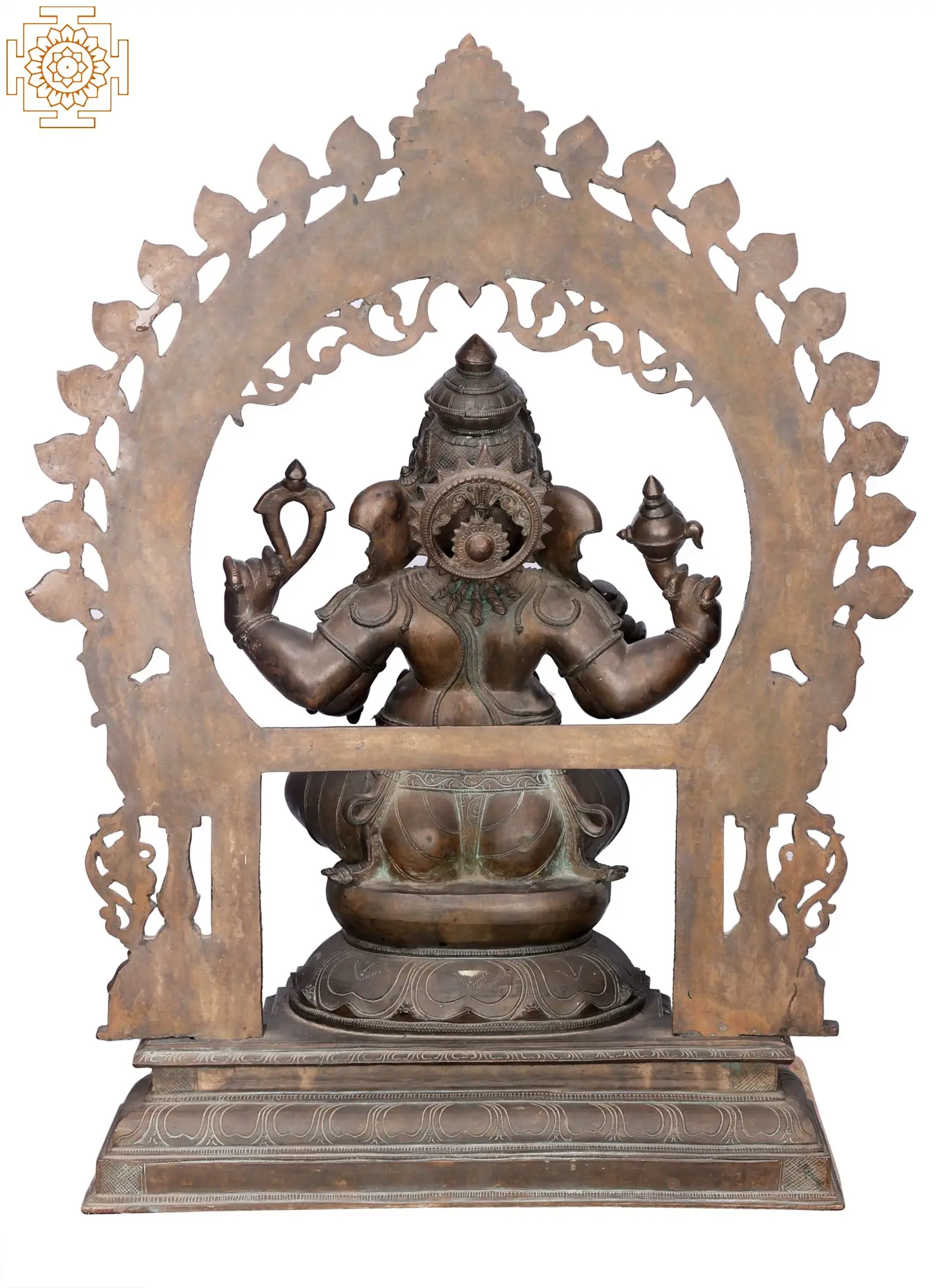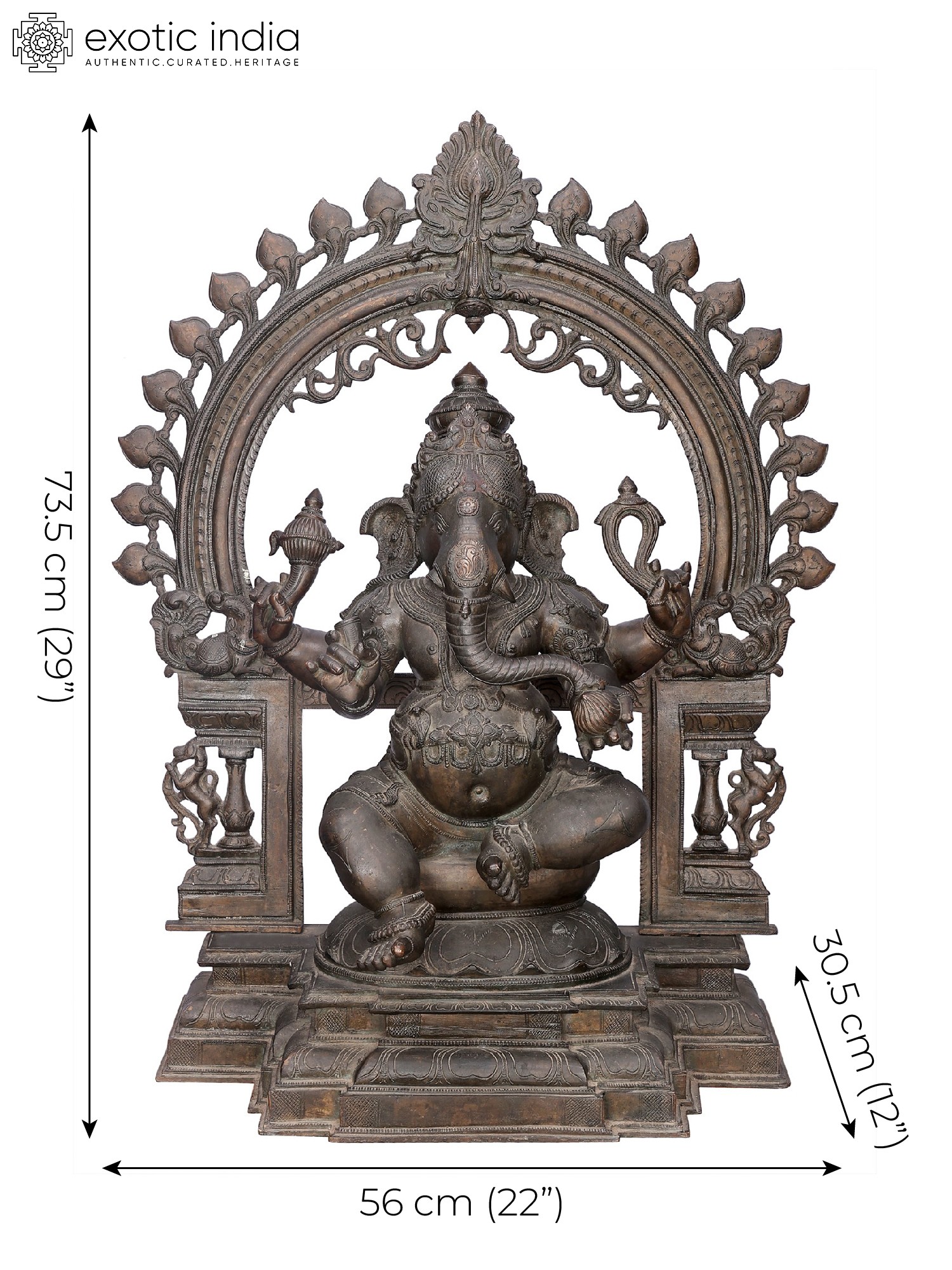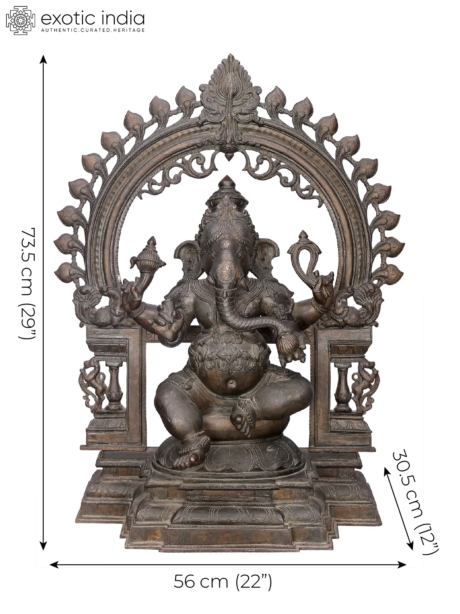 On a grand pedestal, over a Padmasana, Sri Ganesha is adorned ornately in the posture of royal ease. His aureole consists of Yalis, Makara, and architectural elements which instill an aesthetic grandeur in the murti.