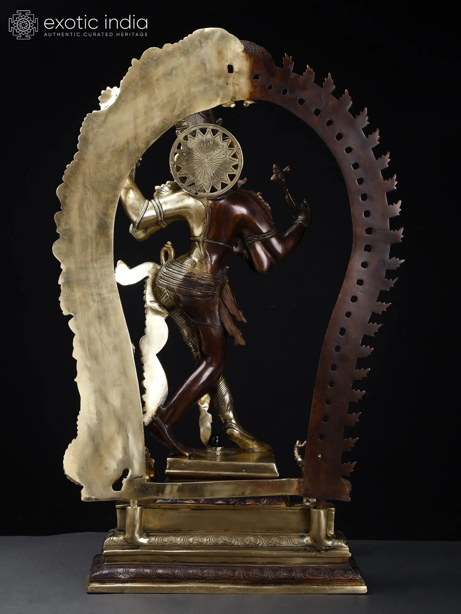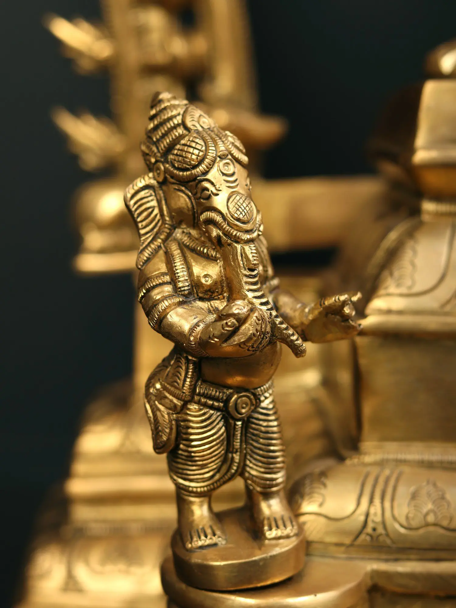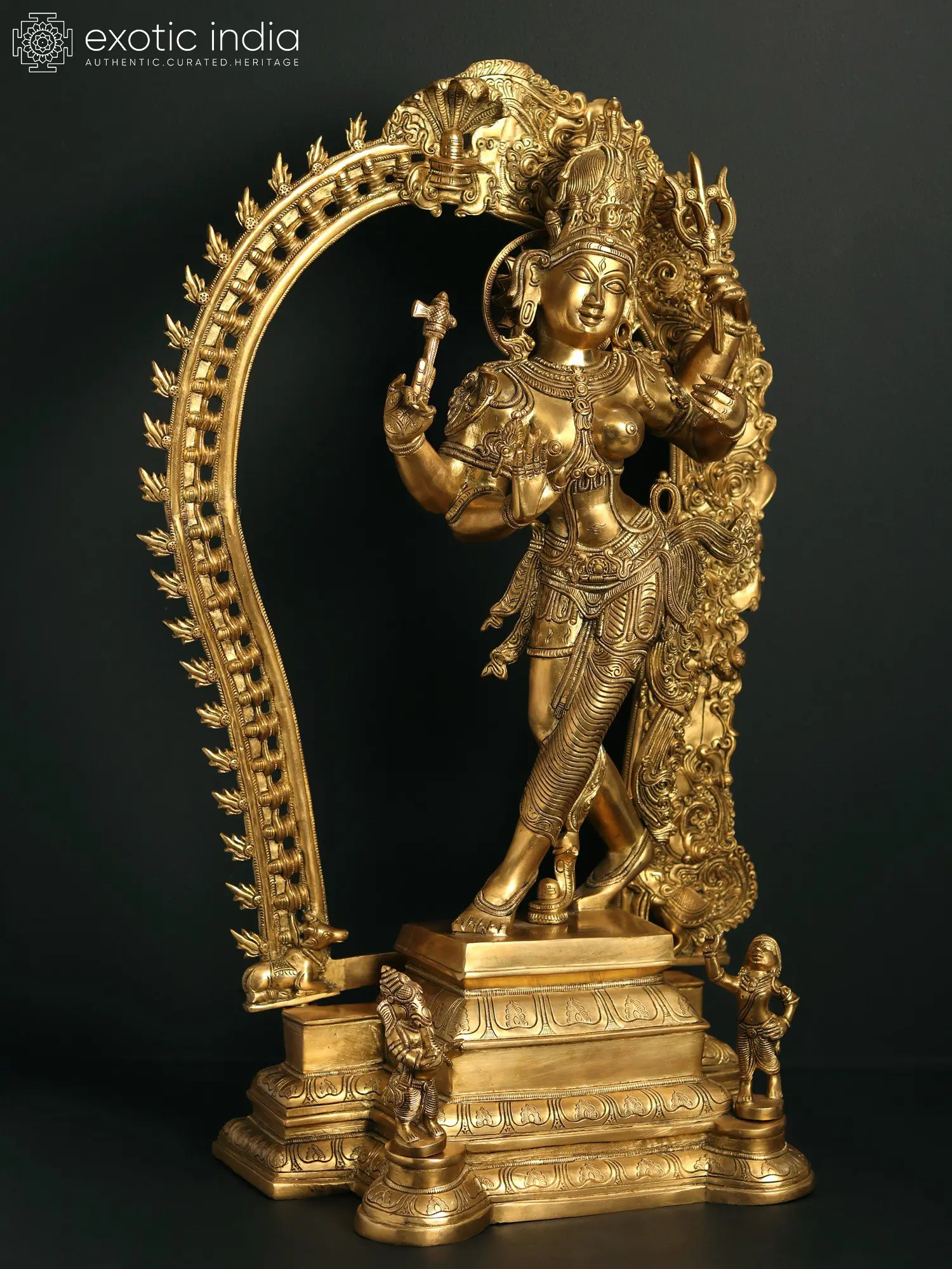 Ardhanarishwara- the union of Shiva and Shakti which inspired Brahma’s creation, and sustain it rivettingly dance in this brass statue, symbolizing the movement of Shiva and Shakti which runs the universe. Standing on a beautiful pedestal, Ardhanarishwara is accompanied by their sons- Ganesha and Karttikeya, who witness the heavenliness of their parents in bliss and awe. Shiva is marked by a mystical black color, adorned with Jatamukuta, serpent ornaments, tiger hide, holding an Ankusha, and the gesture of fearlessness. On his left, Uma emanates a golden aura, beautified by lovely ornaments and a delicate dhoti whose folds are delineated lyrically in the statue. Uma holds a trident, highlighting her powers as the supreme goddess Durga.