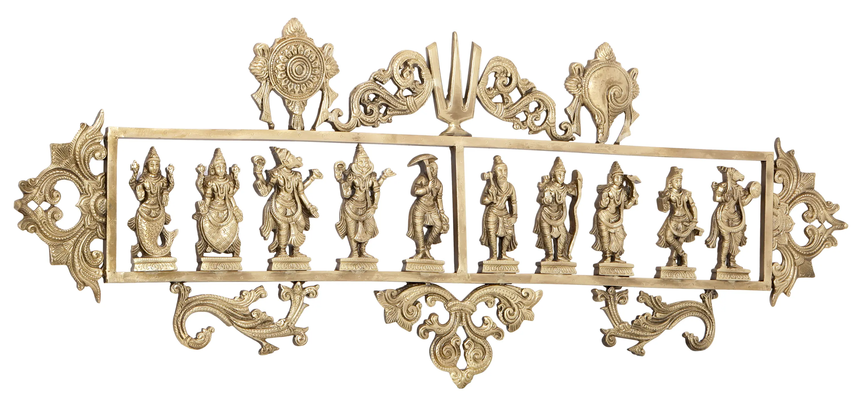 This exquisite Dashavatara panel is a magnificent testament to the rich artistic heritage of South India, specifically drawing inspiration from the Hoysala architectural and sculptural style. Rendered in lustrous bronze, this wall hanging depicts the ten principal avatars of Lord Vishnu, the preserver and protector of the universe, alongside three sacred Vaishnava symbols. Each figure is meticulously crafted, capturing the divine essence and distinct iconography associated with these cosmic incarnations. The Dashavatara, meaning "ten descents," represent Vishnu's cyclical appearances on Earth to restore dharma (cosmic order) and vanquish evil. From the aquatic Matsya (fish) and Kurma (tortoise) to the terrestrial Varaha (boar) and Narasimha (man-lion), each avatar signifies a crucial stage in the evolution of life and the ongoing cosmic struggle between good and evil. The panel continues with Vamana (dwarf), the fierce Parashurama, the righteous Rama, the gentle Krishna, the enlightened Buddha, and finally the prophesied Kalki, who will usher in a new era. The presence of these avatars serves as a visual reminder of divine intervention and the eternal cycle of destruction and renewal.