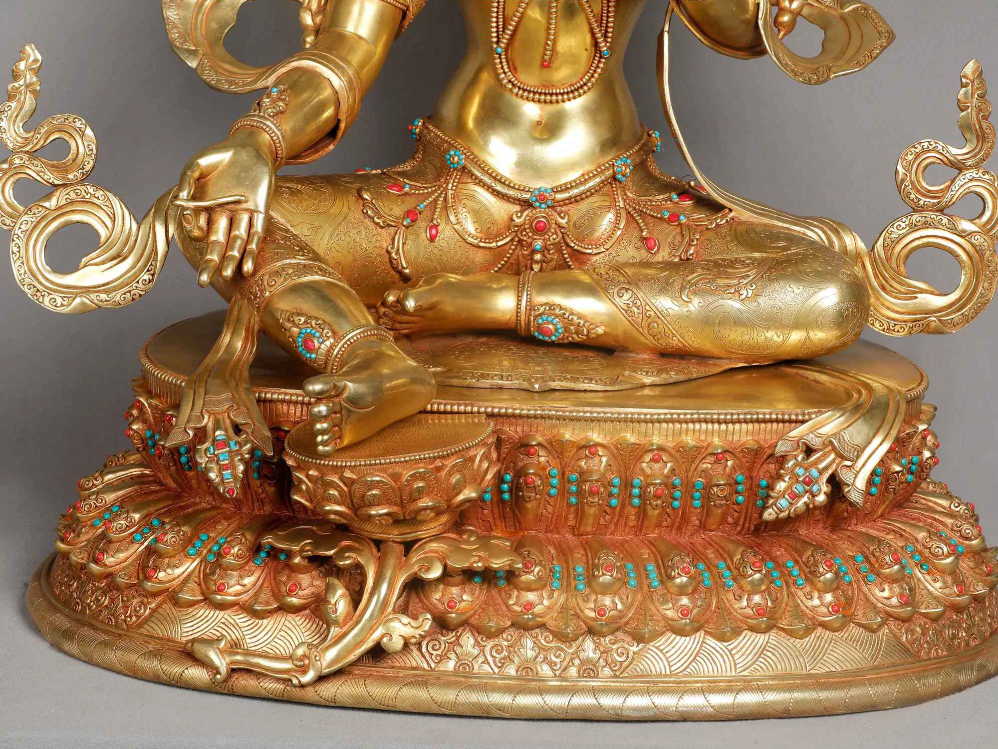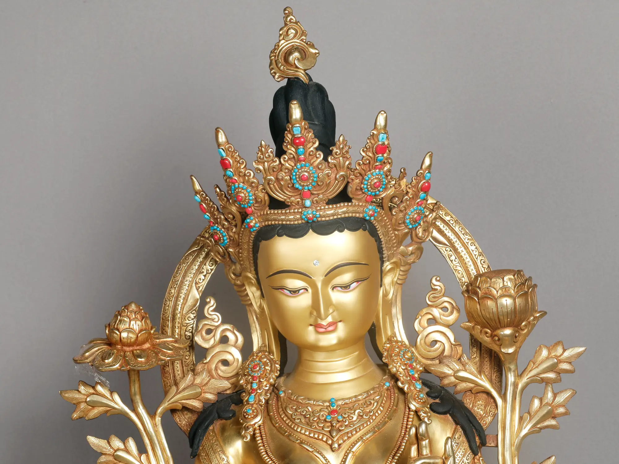 This magnificent statue captures the serene presence of Green Tara, a revered bodhisattva in Tibetan Buddhism, renowned for her swift action and boundless compassion. She is the feminine aspect of Avalokiteshvara, the Bodhisattva of Compassion, and is said to have sprung from a tear of his eye, moved by the suffering of all sentient beings. This exquisite depiction, crafted from copper with a lustrous gold finish, radiates a divine aura that can inspire peace and protection in any space. The artistry is evident in every detail, from the gentle smile gracing her lips to the intricate ornamentation adorning her regal crown and body. The vibrant turquoise and red stones embedded in the crown and jewelry symbolize her protective energies and the multifaceted nature of her wisdom. Her right hand is raised in the gesture of *varada mudra*, bestowing blessings and granting boons, while her left hand holds the stem of a lotus flower, a symbol of purity, enlightenment, and spiritual awakening. The lotus, a recurring motif, signifies that even amidst the mud of samsara (the cycle of birth, death, and rebirth), one can bloom with purity and spiritual insight.
