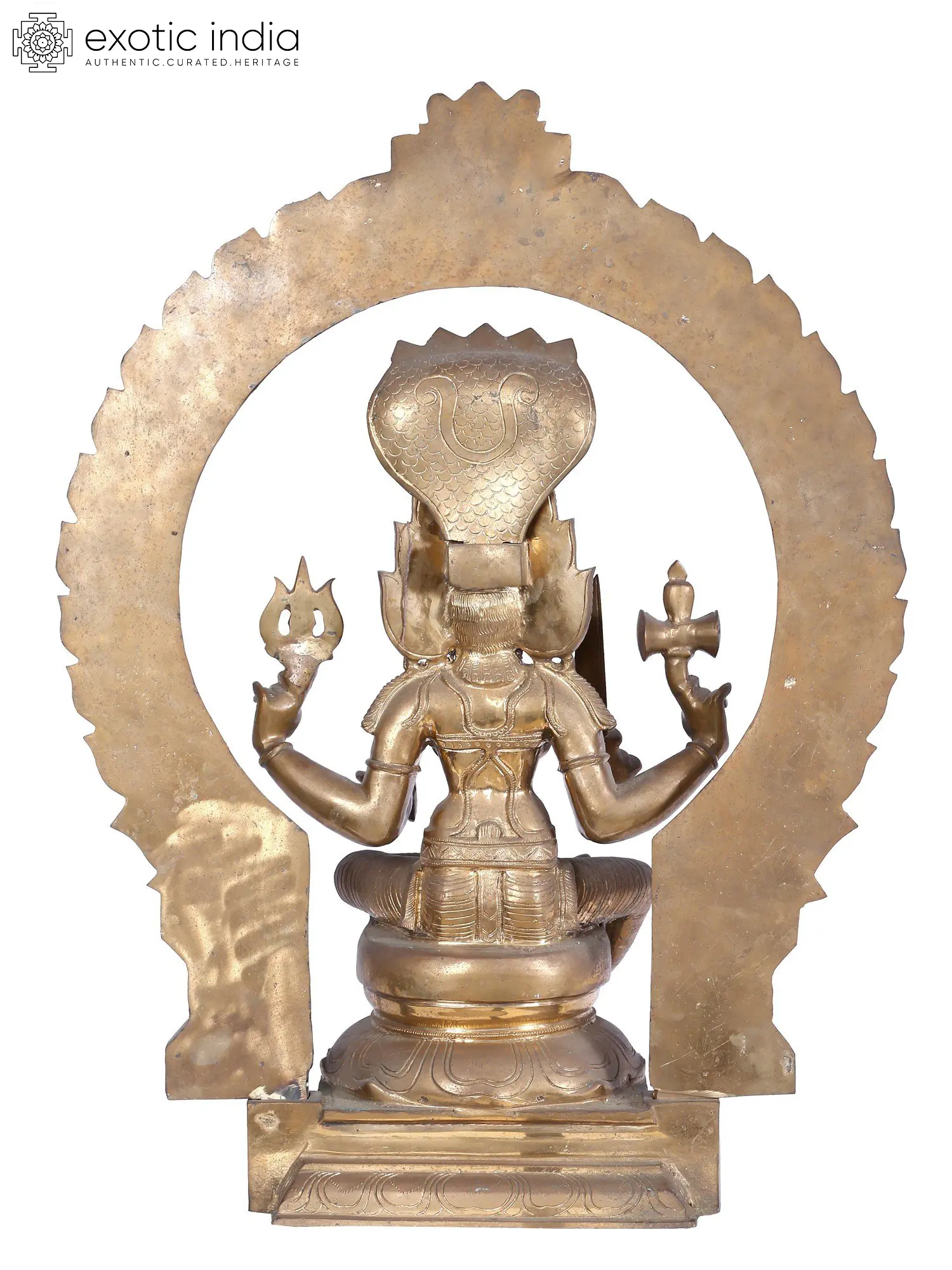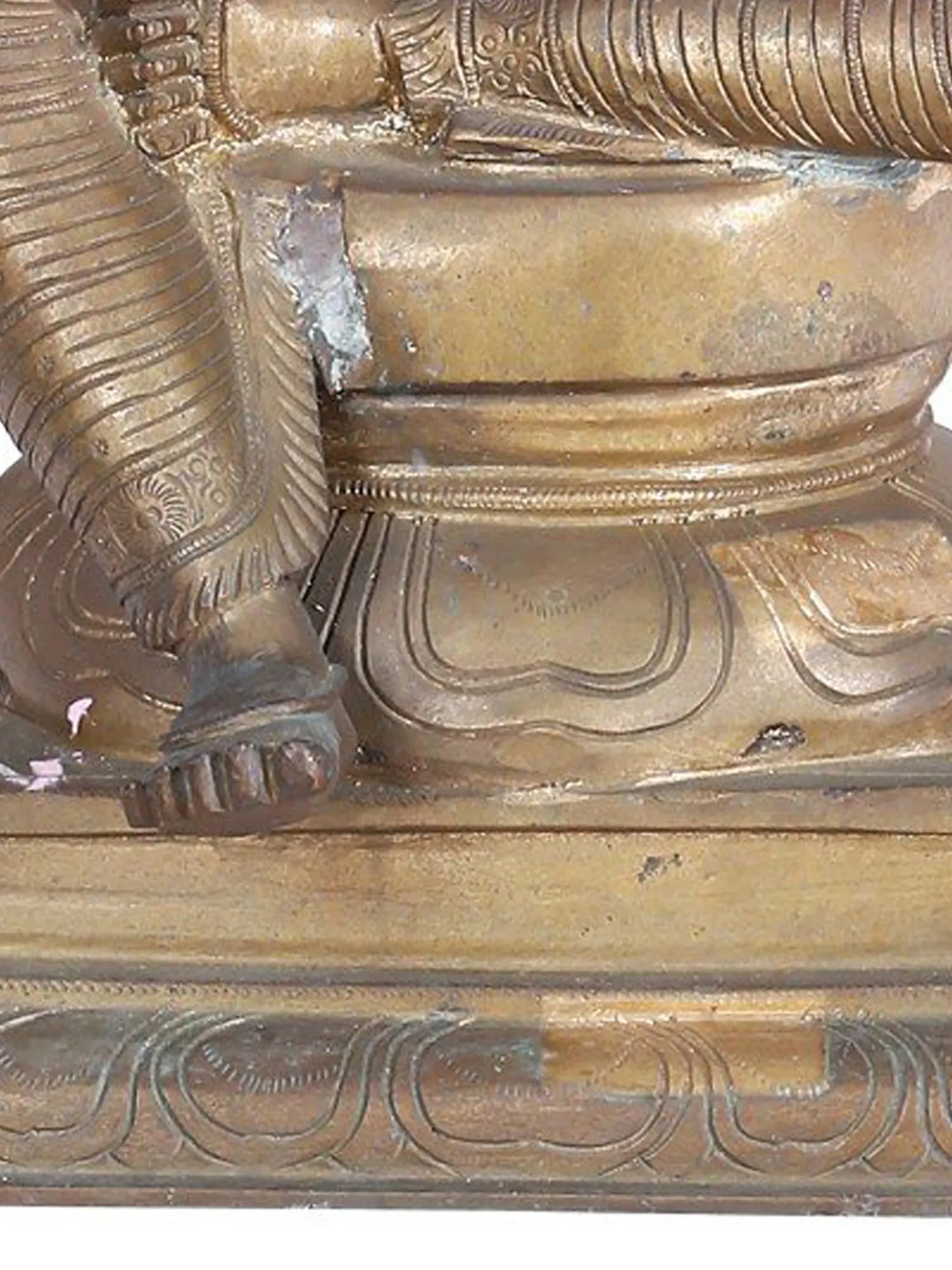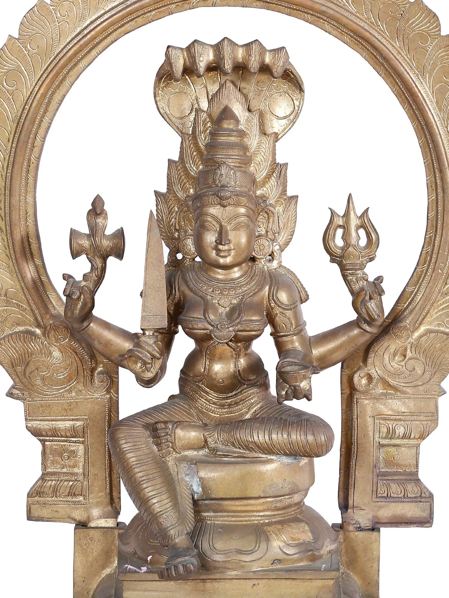 The spread of sickness was another daily concern for these ancient people. People worshipped the Goddess to avoid diseases such as smallpox, chickenpox, and measles (known as Ammai in Tamil). In this statue, the Goddess is seen in the most benevolent form, holding a Trishul, a damru, a medicine bowl, and a sword in her four hands. Her statue sits on a lotus pedestal secured under a Kirtimukha aureole. By placing this statue at home, you Invite the potent energy of Goddess Mariamman into your space, fostering a sense of divine protection and maternal care.