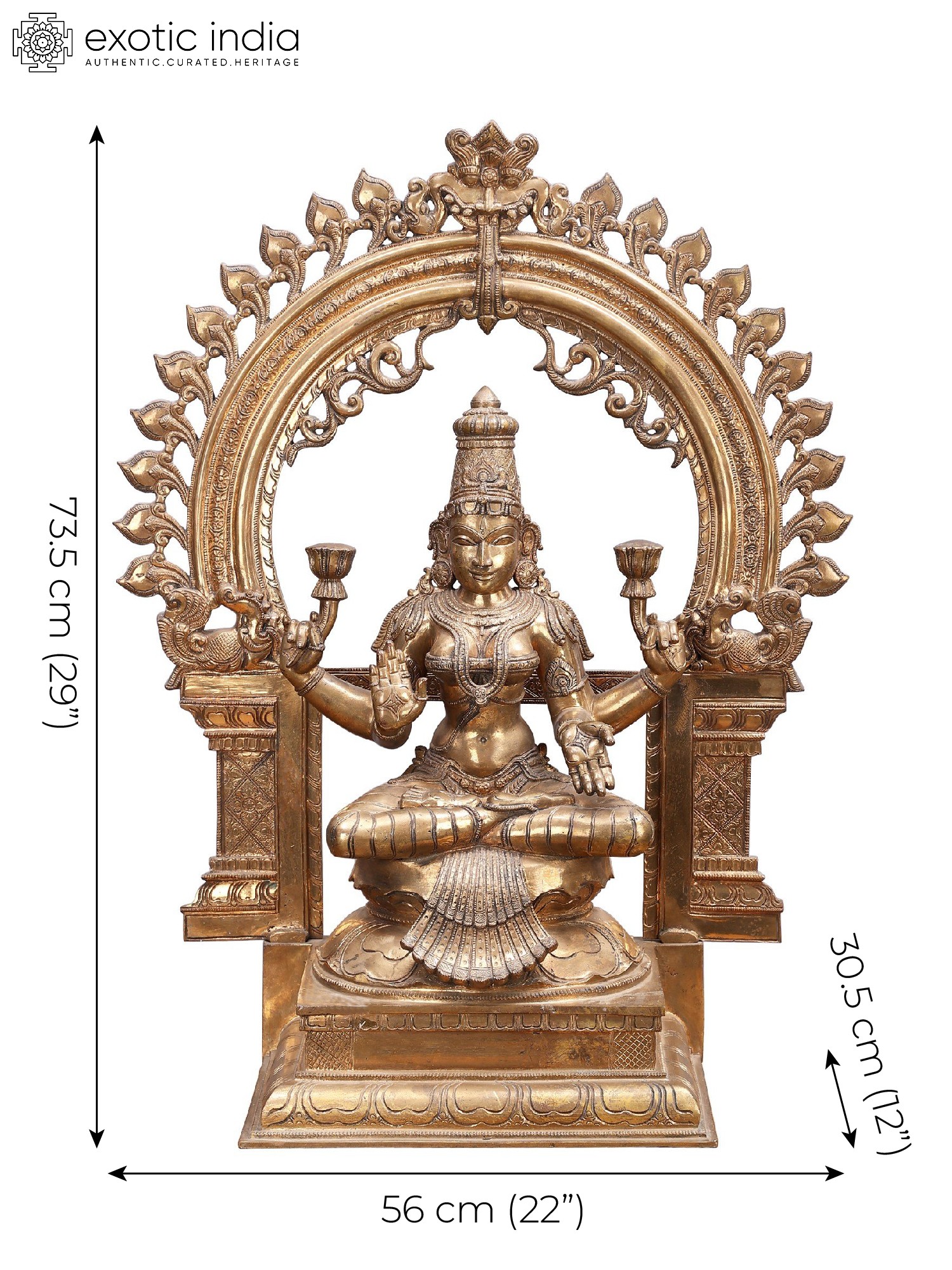 The throne of goddess Lakshmi is situated on a finely decorated base with lotus petals adorning it. A stunning aureole with mystical animals, the Makara adds to the grandeur of the bronze Lakshmi icon.