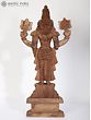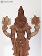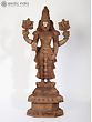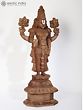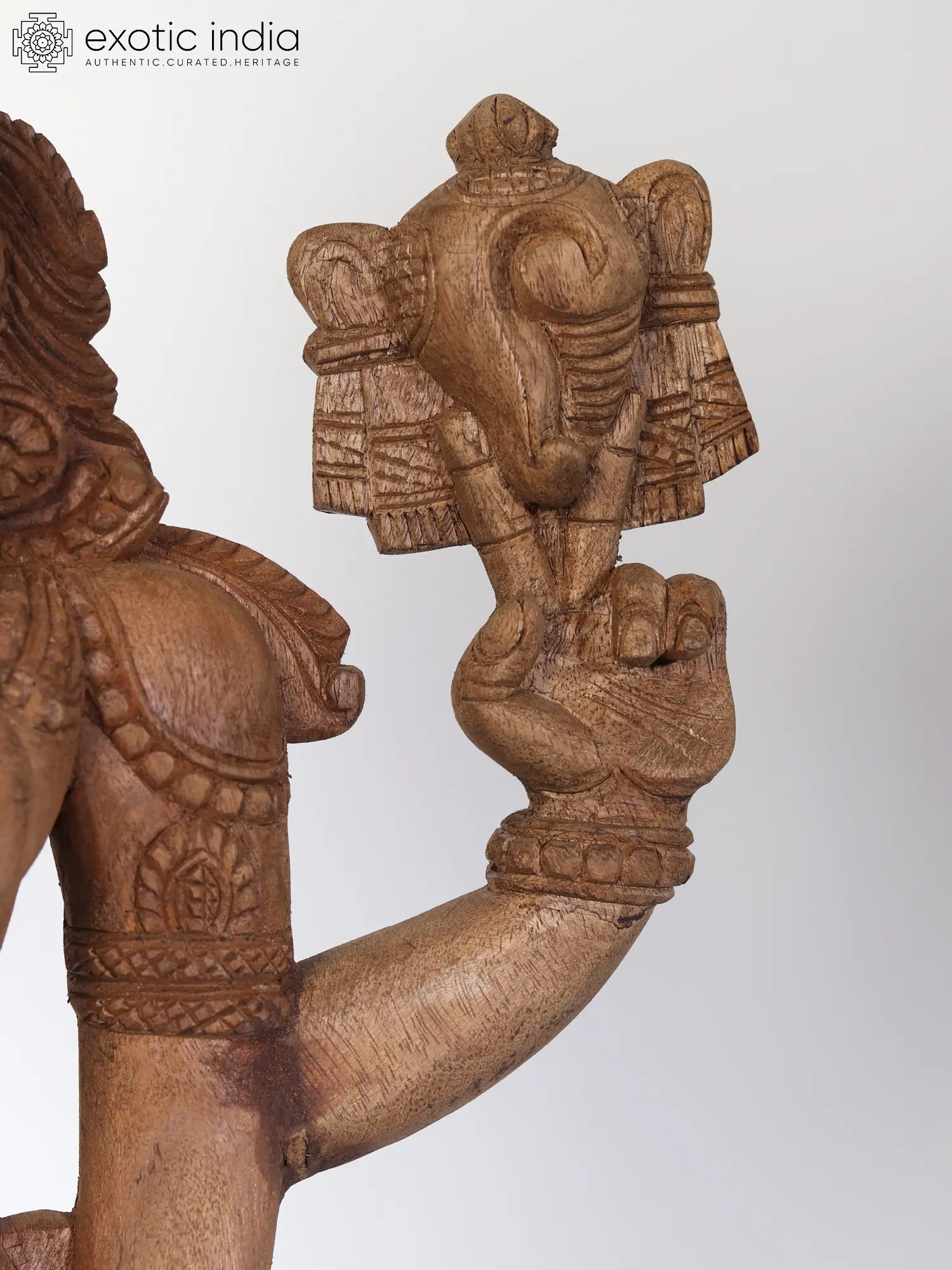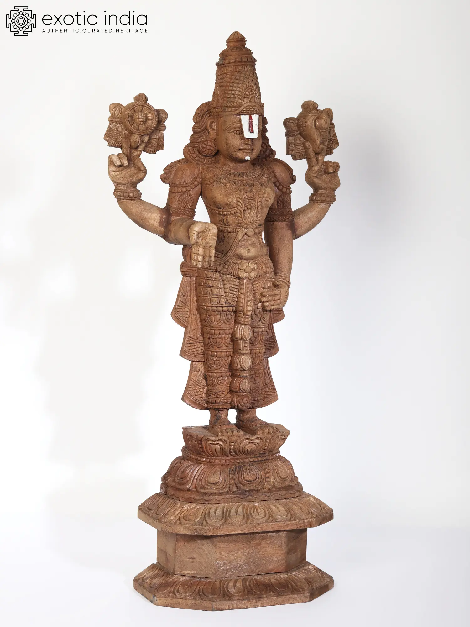 His eyes are covered as it is said that his gaze is so powerful that it would scorch the universe. In his upper hands, Balaji carries the Sudarshan, a symbol of his cosmic authority and Shankha (Conch Shell), a symbol of existence. His lower right hand extends in the Varada Mudra (Gesture of Granting Boons). And his left hand is extended in the receiving gesture as he asks devotees to have faith and surrender to him for protection. He is dressed in regal attire and adorned with a crown (Karanda Mukut), and jewellery. This Vengai Wood Statue embodies the divine grace of Balaji. Devotees are urged to embrace faith, finding solace and protection in their surrender to the benevolent Lord.