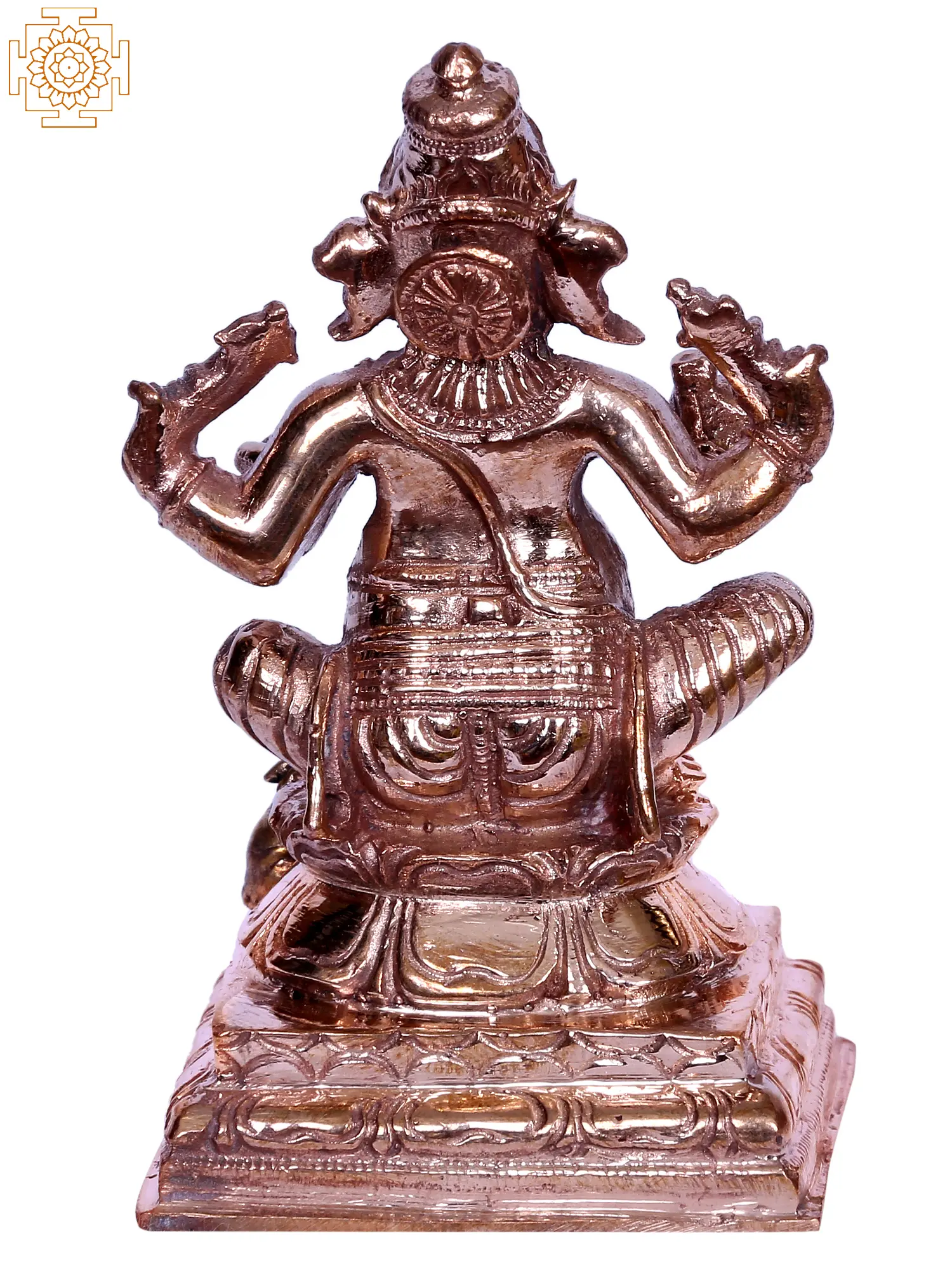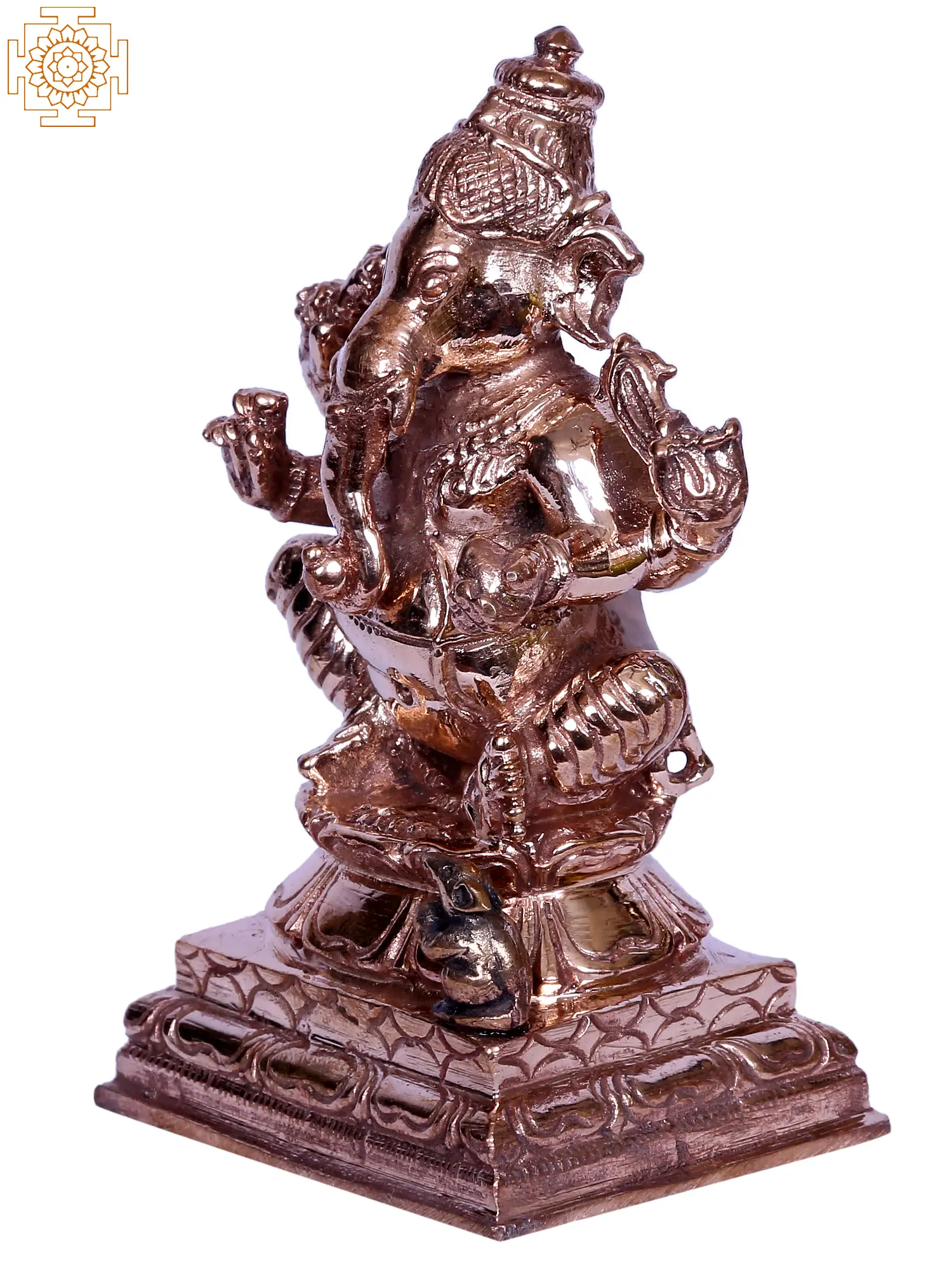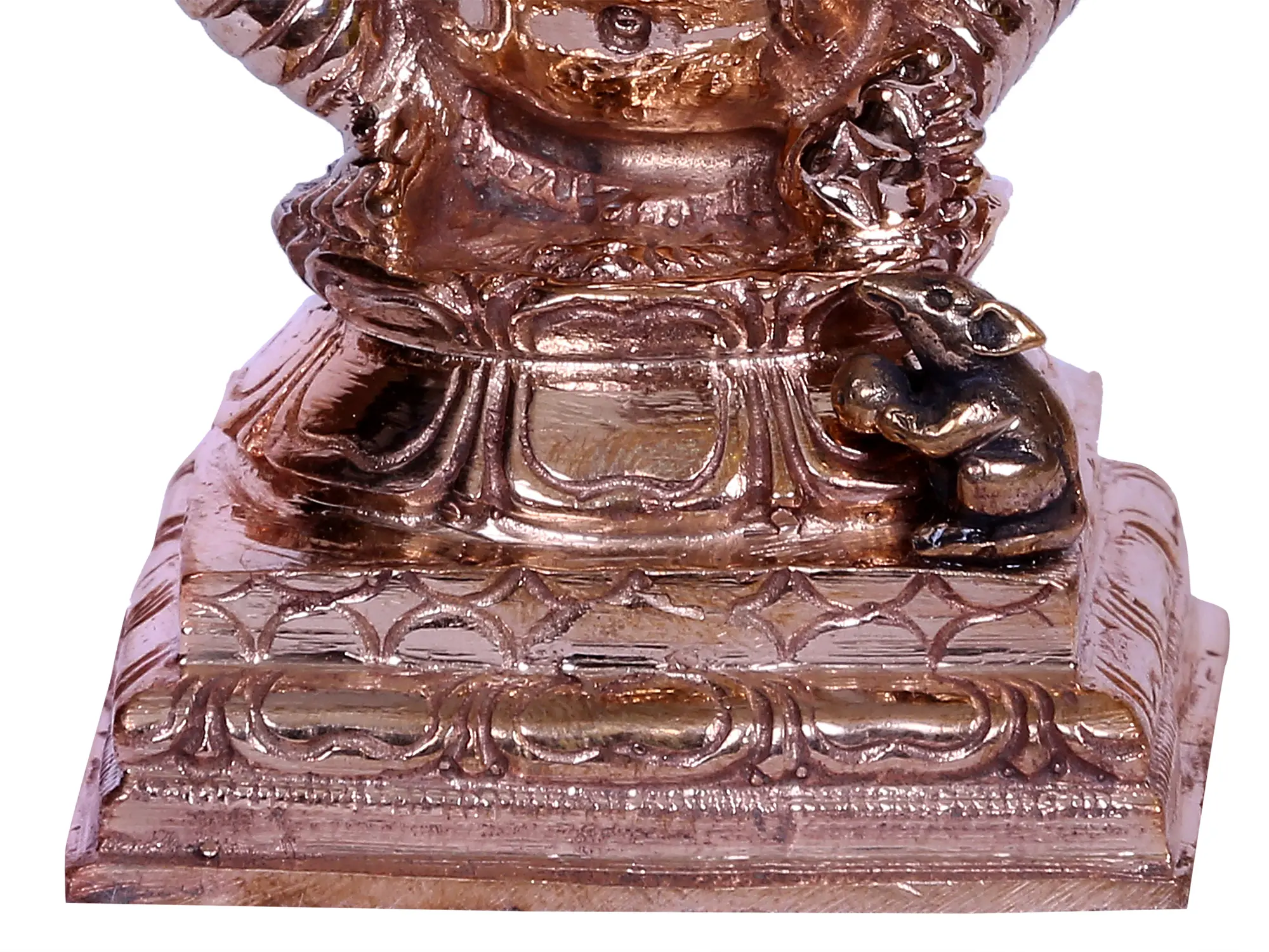 Sri Ganesha in his auspicious Chaturbhuja (four-armed) form is presented in this glistening bronze statue. A two-tiered platform is offered to the supremely auspicious God, who sits in a regal posture, holding Paasha (noose), Ankusha (goad), Modaka (sweet), and his broken tusk in his four hands. Adorned with exquisite ornaments, and revered by his Mushaka (mouse) who sits in his feet, Ganesha in this form is worshipped to gain auspiciousness, wealth, and wisdom by his devotees.