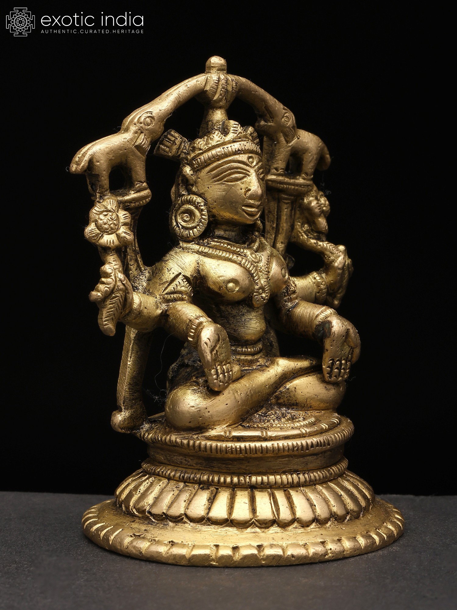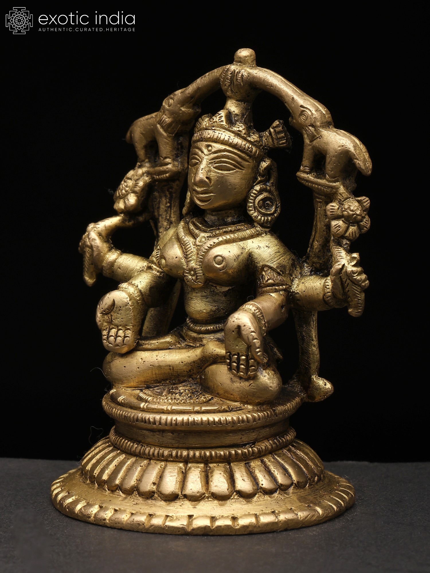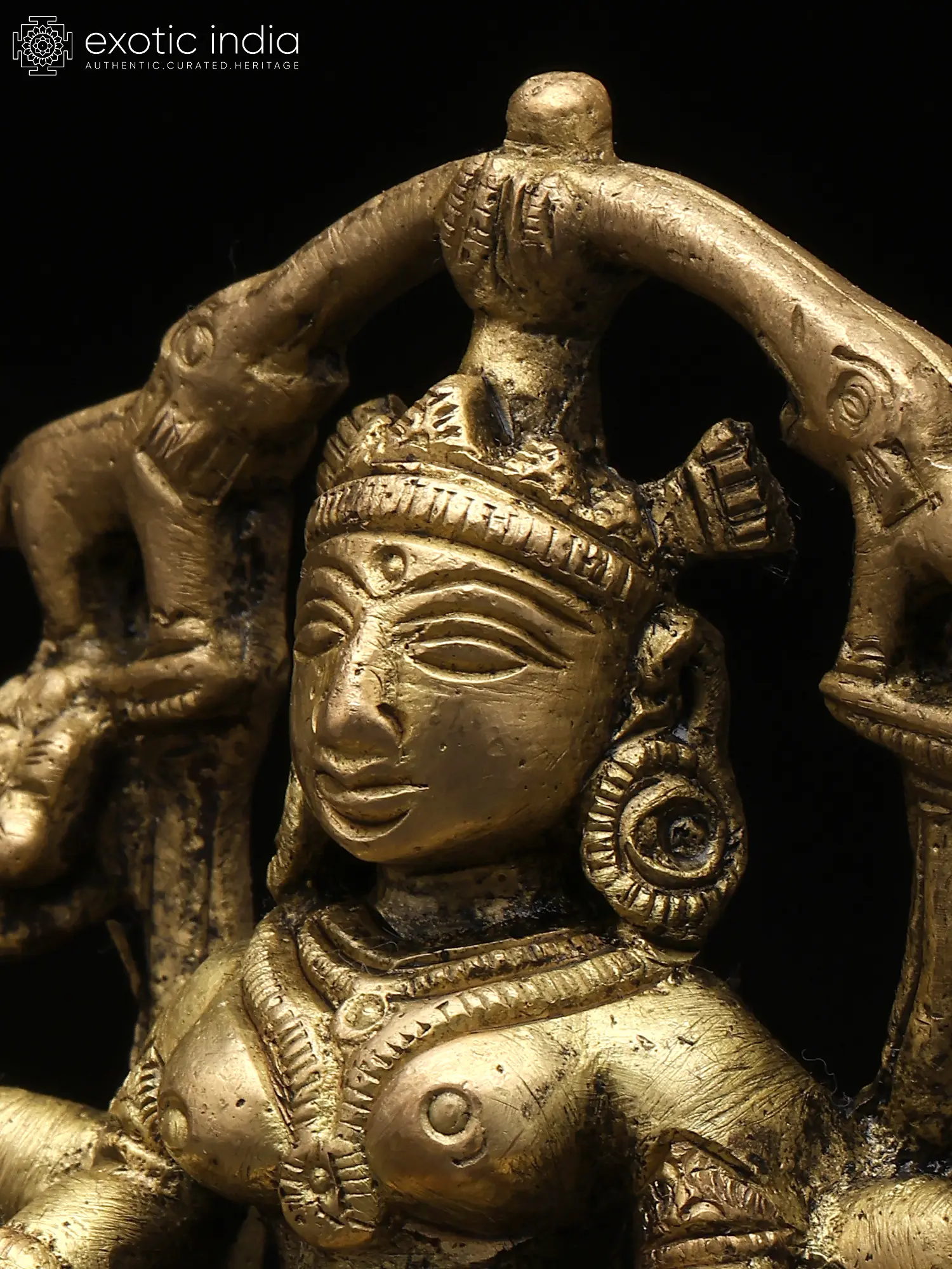 “Gajalakshmi” is the most significant aspect of the Hindu goddess of wealth, “Lakshmi”. The goddess is seen in this hypnotic form seated on a lotus pedestal, a lotus in her left hand, and a lotus “cornucopia” in her right. In the Varada Mudra, her right hand is extended downward, radiating blessings and offering gifts. This gesture signifies her capacity to grant wealth and fortune to devotees. Two elephants bathing her with life-giving waters, signifying the convergence of material and spiritual wealth, highlighting the harmonious balance between worldly success and inner growth. Invite the blessings of Gajalakshmi into your life with this timeless and elegant brass creation.
