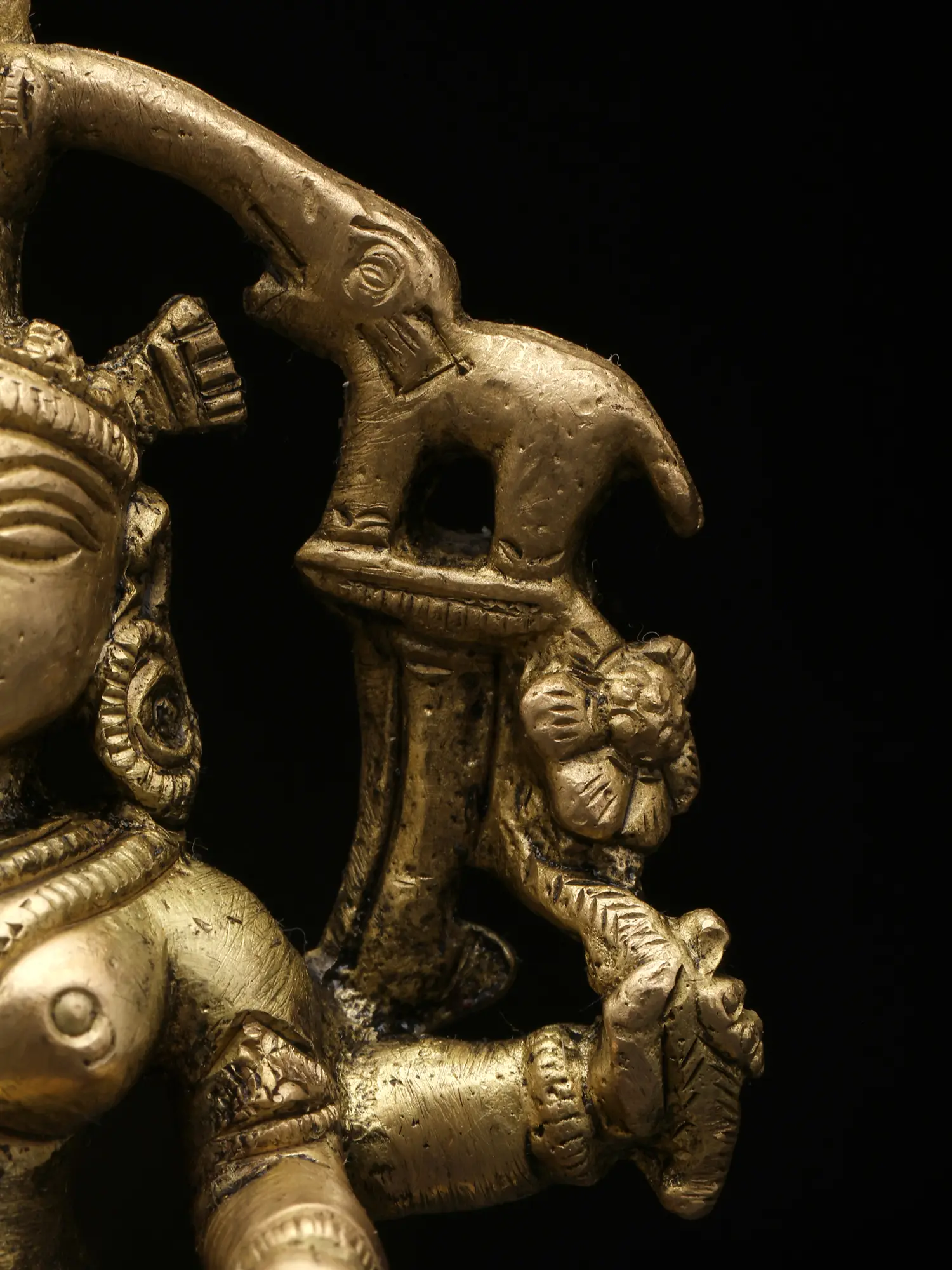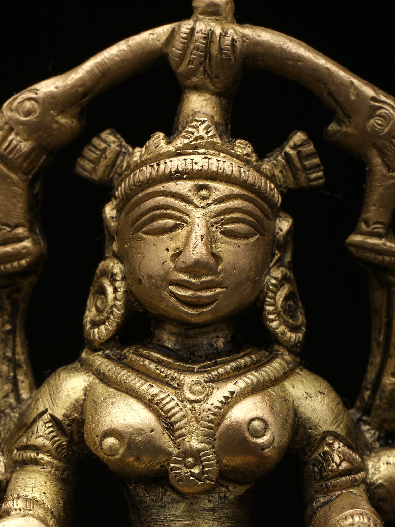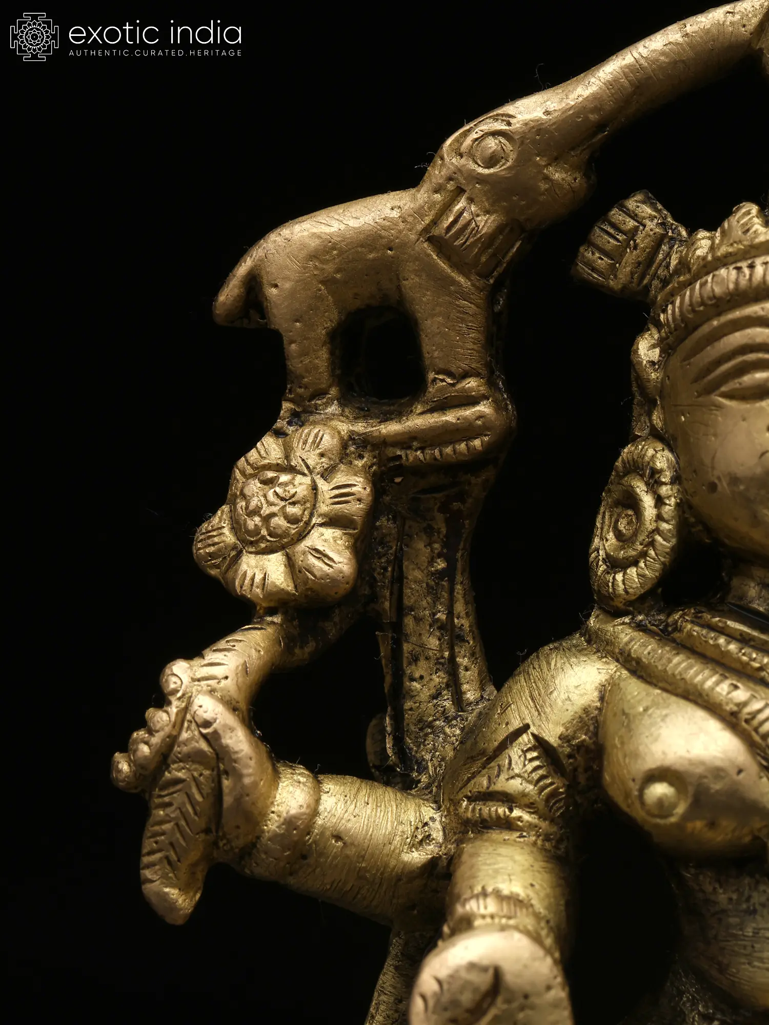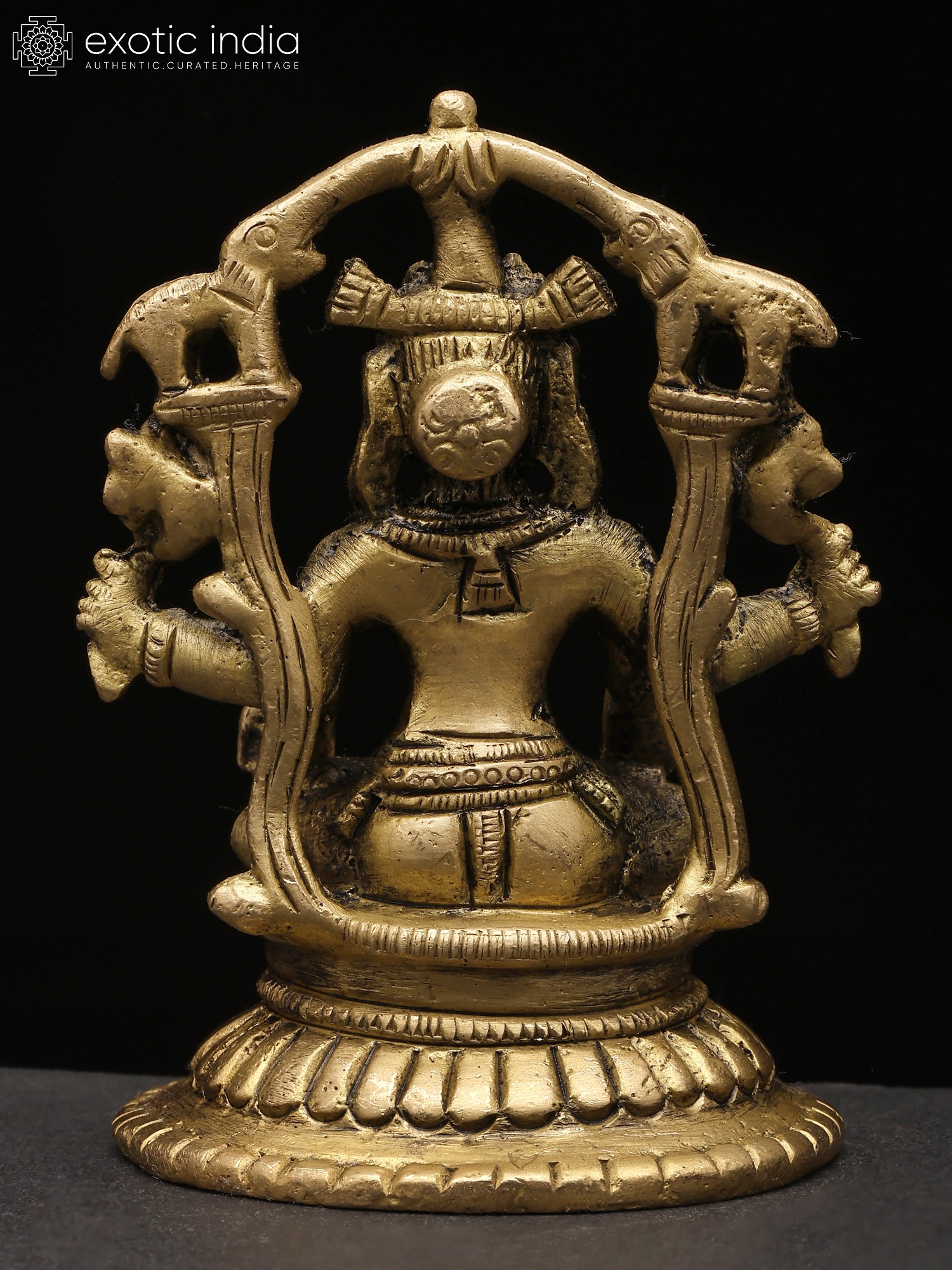 “Gajalakshmi” is the most significant aspect of the Hindu goddess of wealth, “Lakshmi”. The goddess is seen in this hypnotic form seated on a lotus pedestal, a lotus in her left hand, and a lotus “cornucopia” in her right. In the Varada Mudra, her right hand is extended downward, radiating blessings and offering gifts. This gesture signifies her capacity to grant wealth and fortune to devotees. Two elephants bathing her with life-giving waters, signifying the convergence of material and spiritual wealth, highlighting the harmonious balance between worldly success and inner growth. Invite the blessings of Gajalakshmi into your life with this timeless and elegant brass creation.