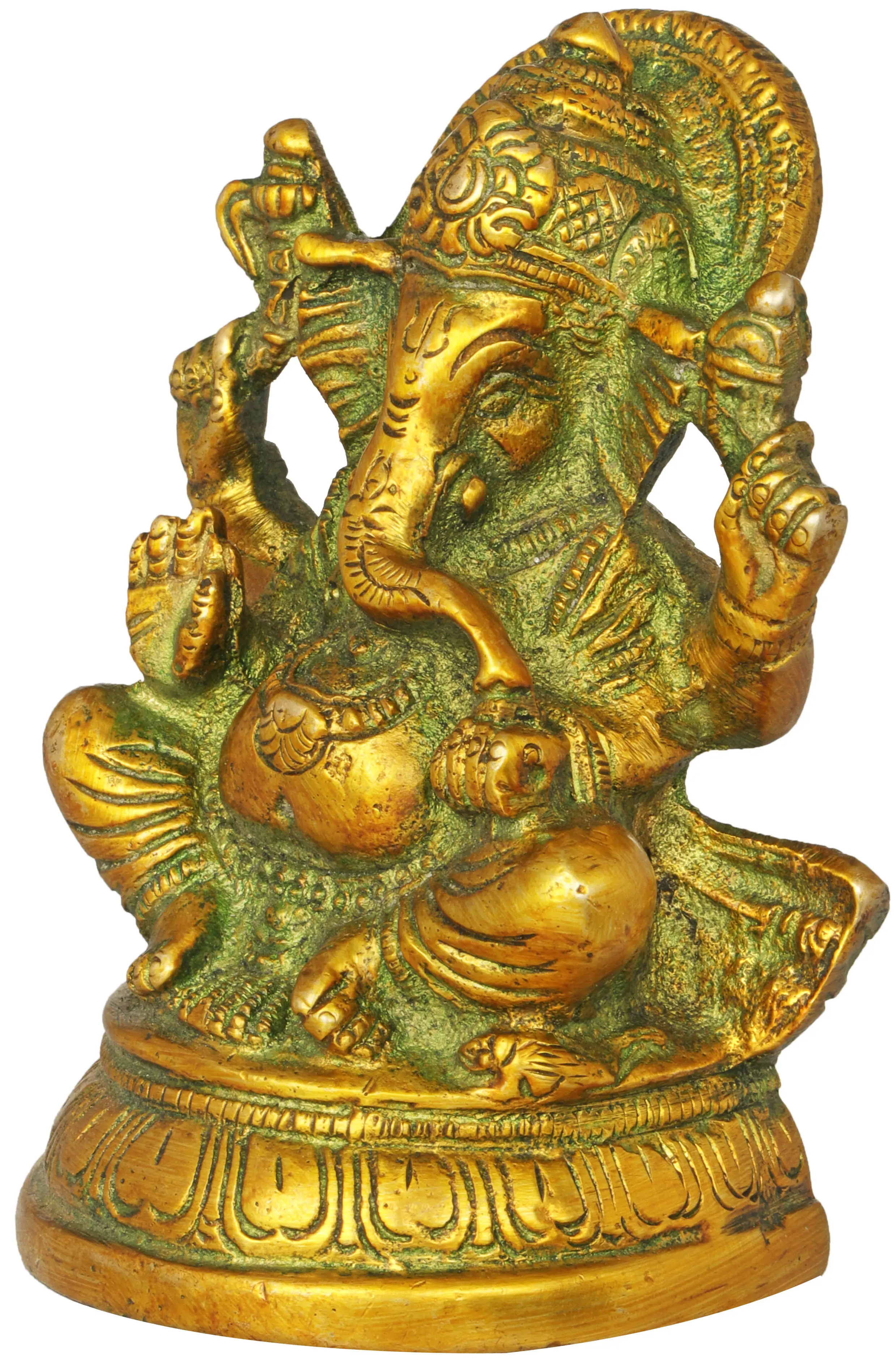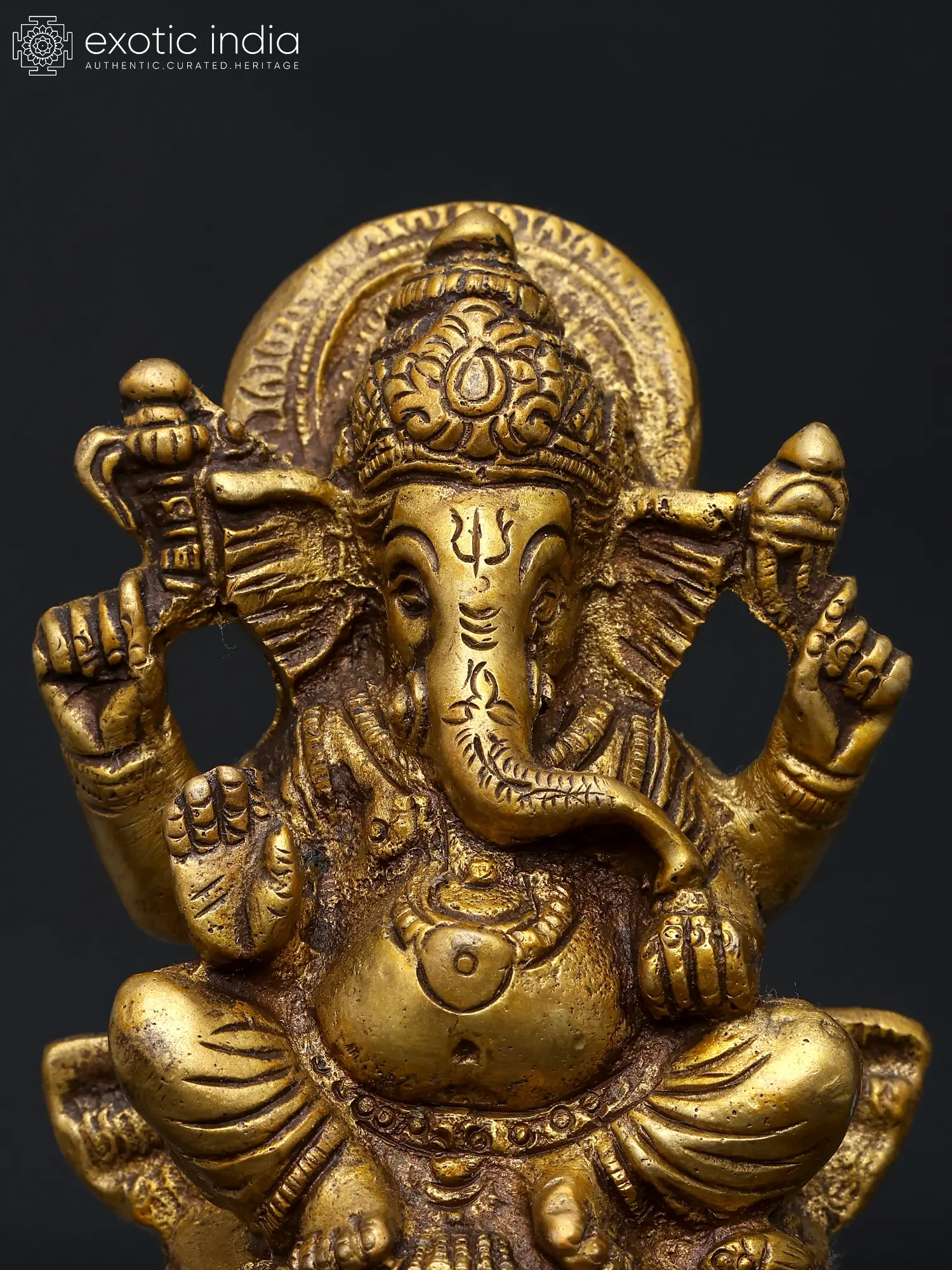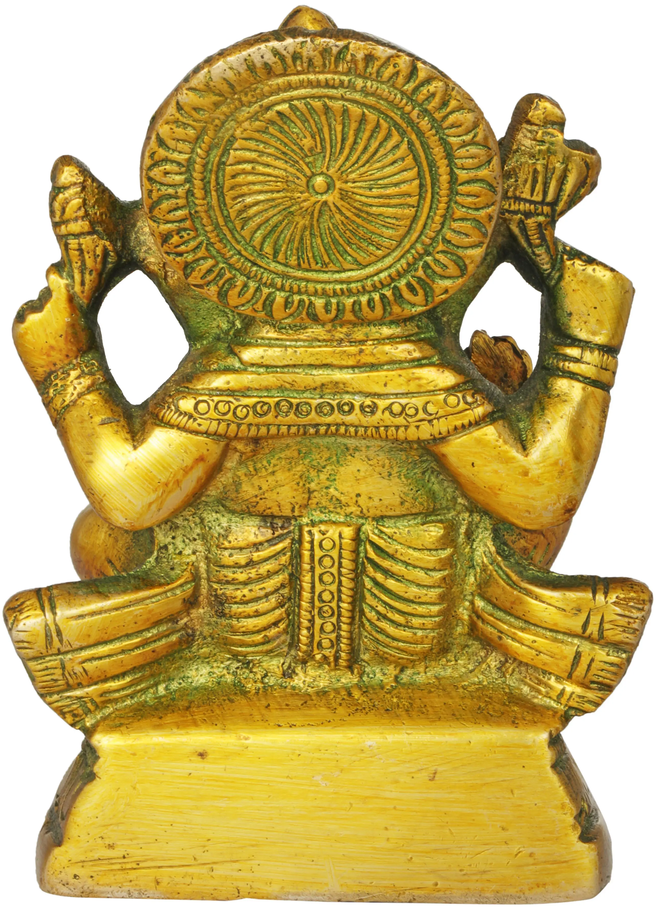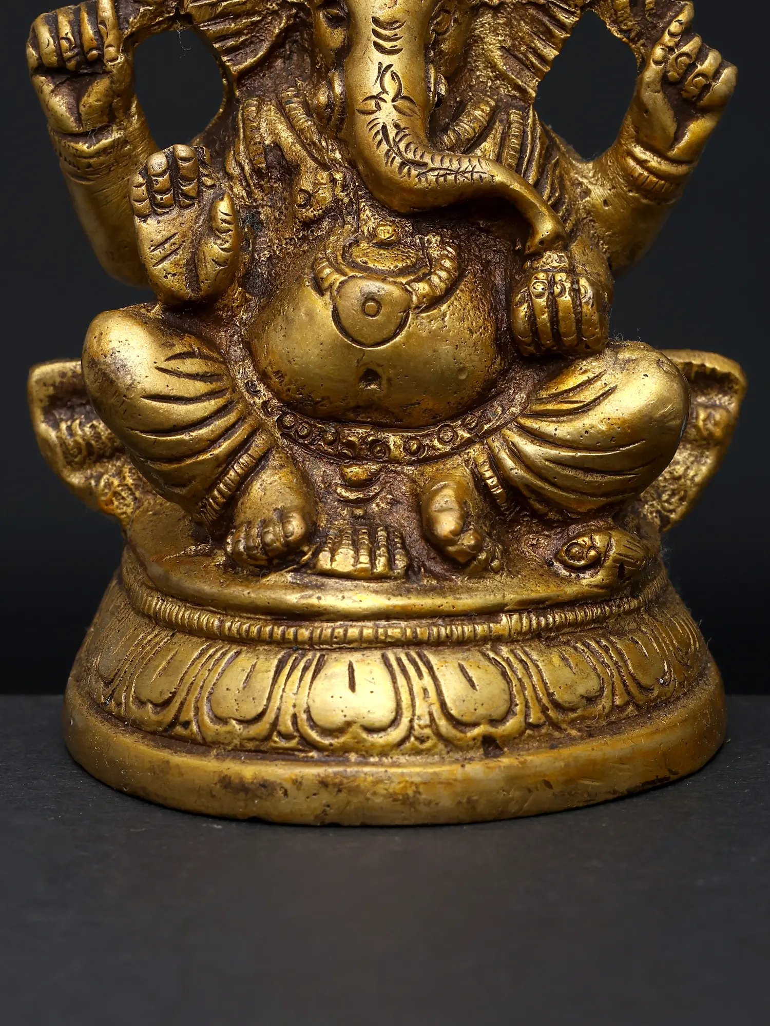In this brass sculpture, Lord Ganesha, the harbinger of success, is sitting in a serene and easy posture on a Lotus podium, exuding divine energy and wisdom. Lord Ganesha gracefully holds a goad and a noose, symbolizing his power to guide and control the minds of devotees. In Abhaya Mudra, his right hand extends a blessing of fearlessness and protection. Ganesha’s large belly represents his all-encompassing ability to assimilate life’s experiences with grace and equanimity. Handmade in India, this exquisite artwork embodies the benevolence and strength of Lord Ganesha, inspiring confidence and offering divine blessings for success, prosperity, and the removal of obstacles on life’s journey.