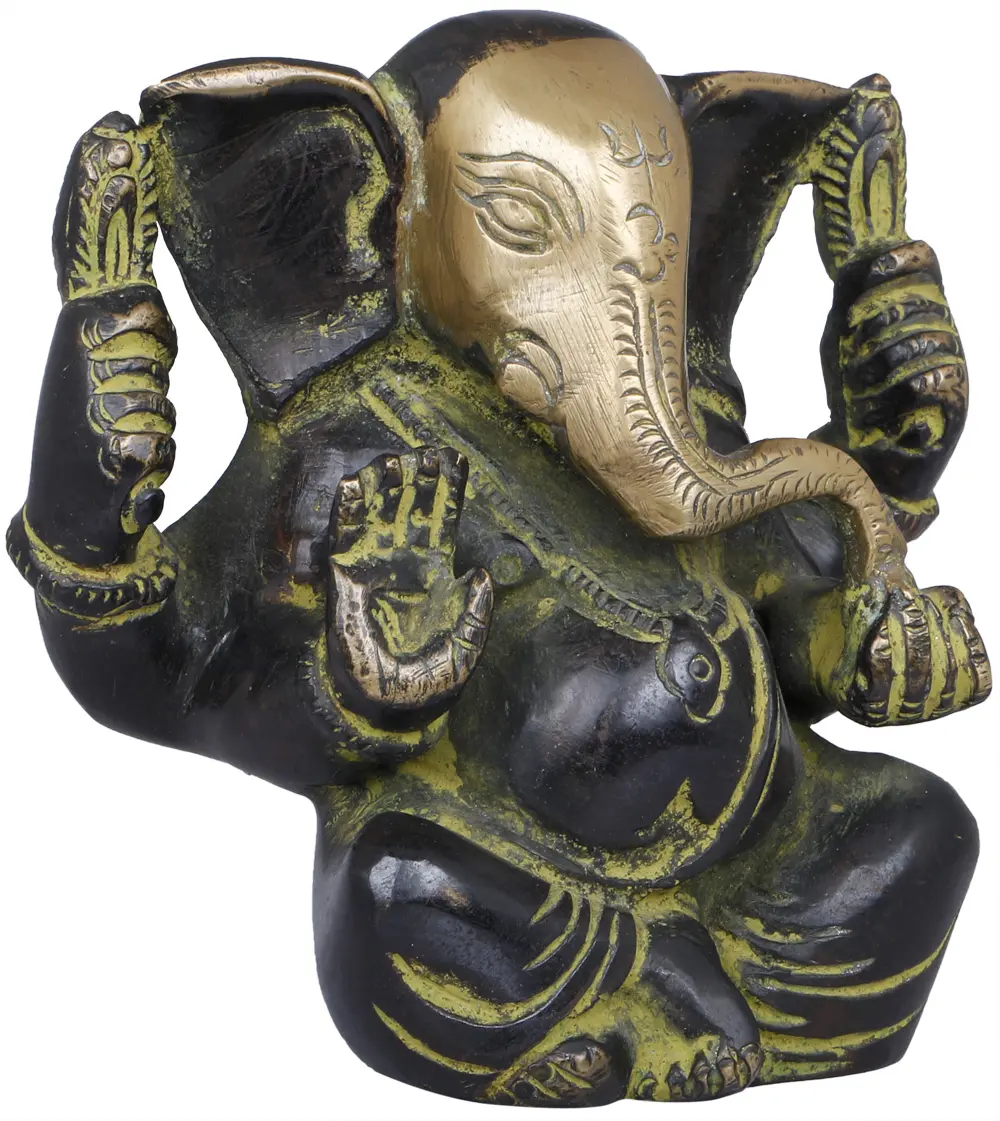 Invite the divine blessings of Vighnaharta, the Remover of Obstacles, into your home with this exquisitely crafted brass idol of Lord Ganesha. Each piece is a testament to the rich artistic heritage of India, meticulously handcrafted by skilled artisans who pour their devotion and expertise into every detail. This charming depiction captures the beloved deity in a moment of serene contemplation, his trunk gracefully curled around a sweet modak, a celestial delicacy that symbolizes abundance and the rewards of righteous effort. The traditional green and bronze patina of the brass adds a sense of timeless elegance, making this idol a captivating focal point for any sacred space, altar, or as a decorative accent in your living area. The gleam of the brass evokes purity and divine energy, while the subtle hints of green represent prosperity and growth. Ganesha, with his elephantine form and single tusk, is a powerful symbol of wisdom, intellect, and new beginnings. He is revered as the patron of arts and sciences, and the deified lord of wisdom, invoked at the start of rituals and ceremonies to ensure success.